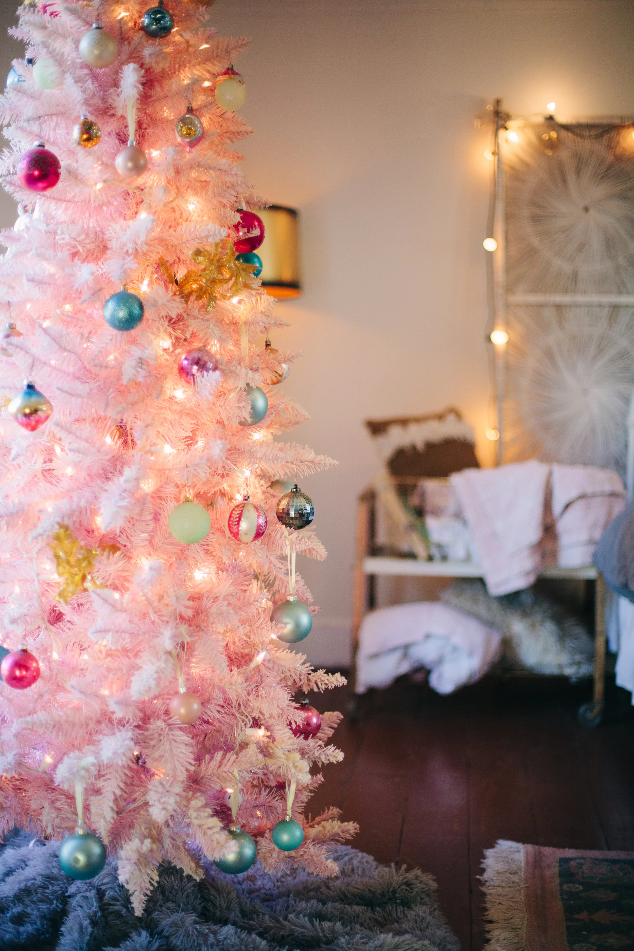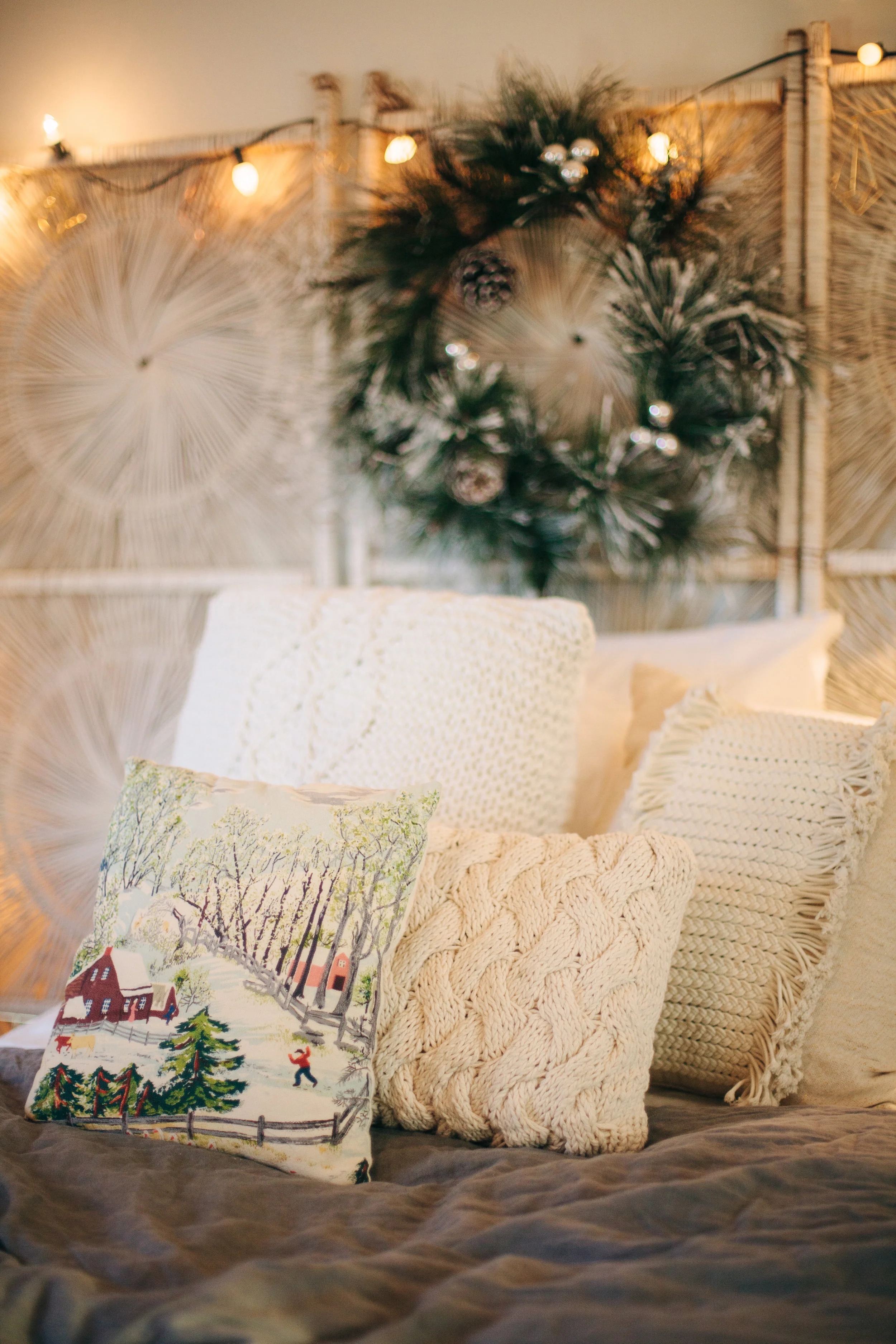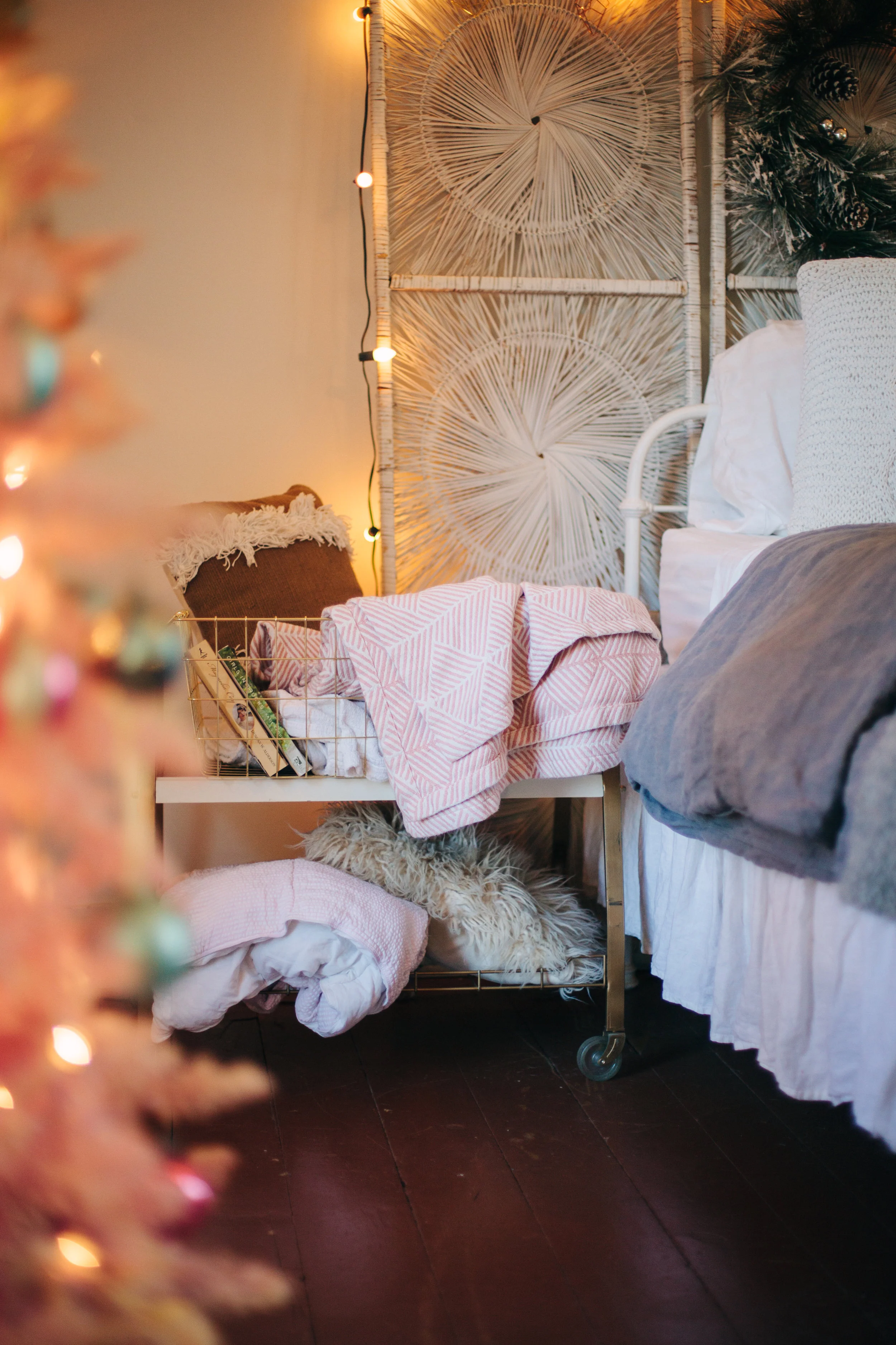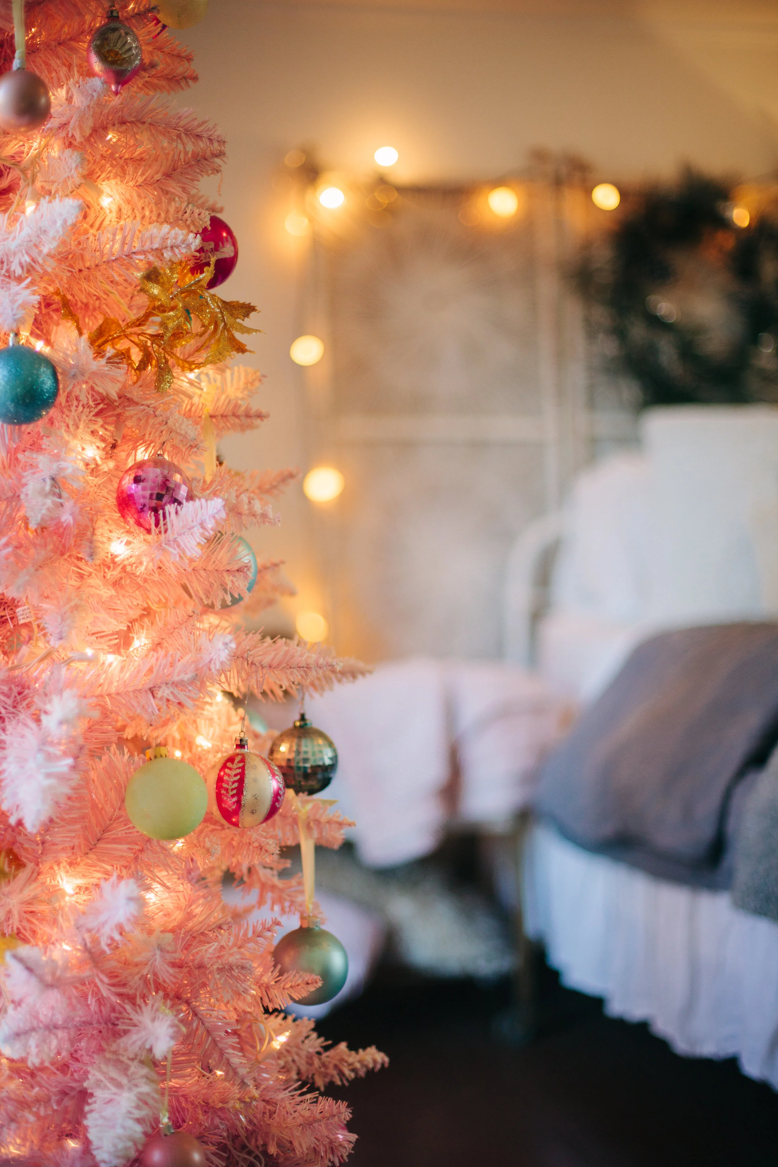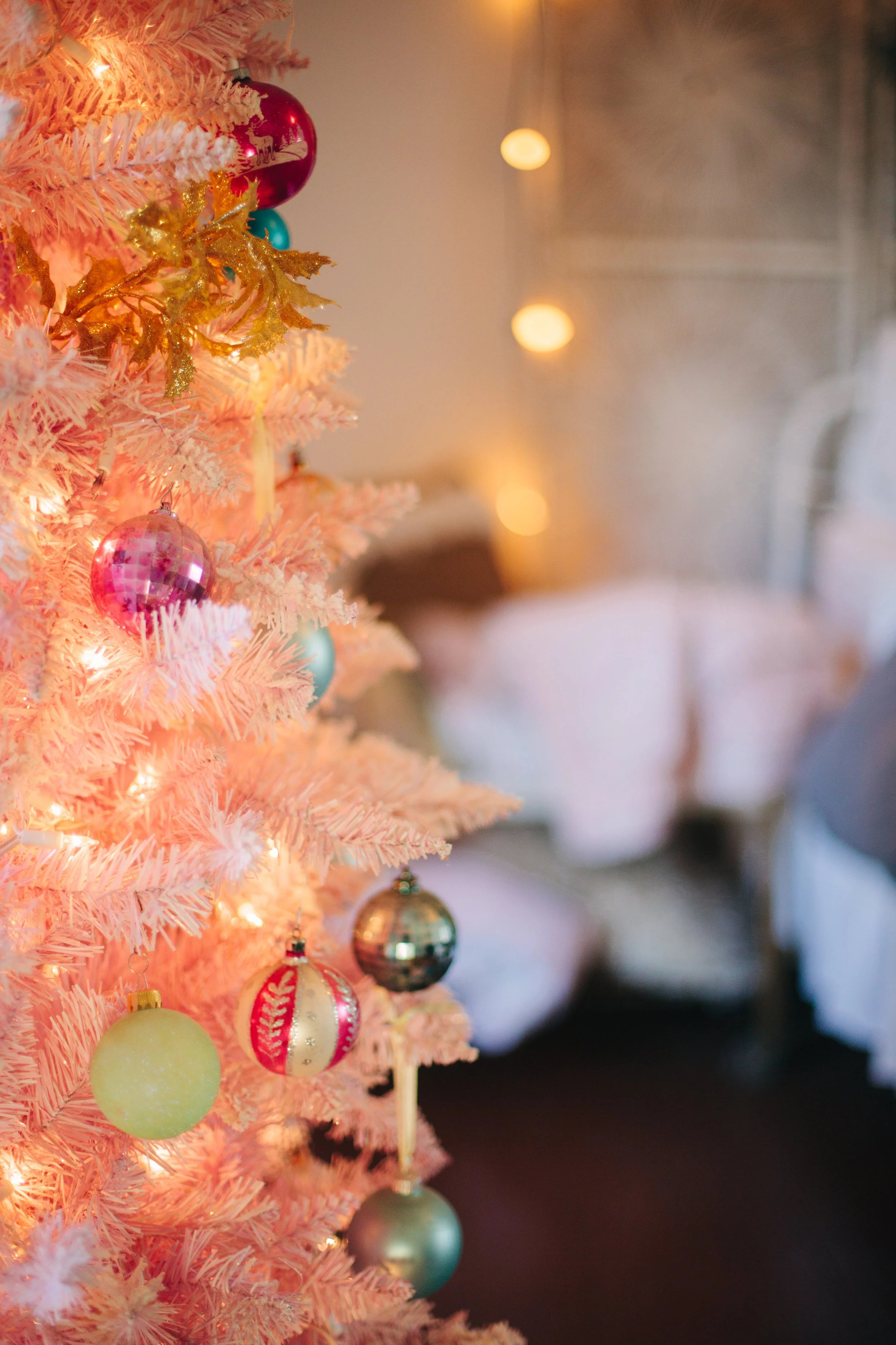 Our little guest bedroom is one of my favorite rooms to decorate for the holidays. I love being able to pile on the pillows, throws, and make the space feel super cozy and inviting. I haven't really gotten around to finalizing the decor in here and besides painting the walls and updating the light fixture, not much has changed since we moved in. We still would like to sand up the painted floors to see if we could restore the wood underneath, but for now I am working with the brown floors (at least it's not carpet!). Since the color scheme has stayed pretty neutral in here, I added some pops of pastel for Christmas; mostly because I just HAD to find somewhere to put my pink flocked tree! Over the years I have collected a lot of little pastel vintage Christmasy trinkets and this seemed like the perfect room for them. I mixed in lots of creamy knit pillows and gray tones too so that the pastels weren't too overpowering and juvenile feeling. The room felt a little bare before but with all the Christmas decorations it instantly feels more cozy + complete- who wants to come stay?!