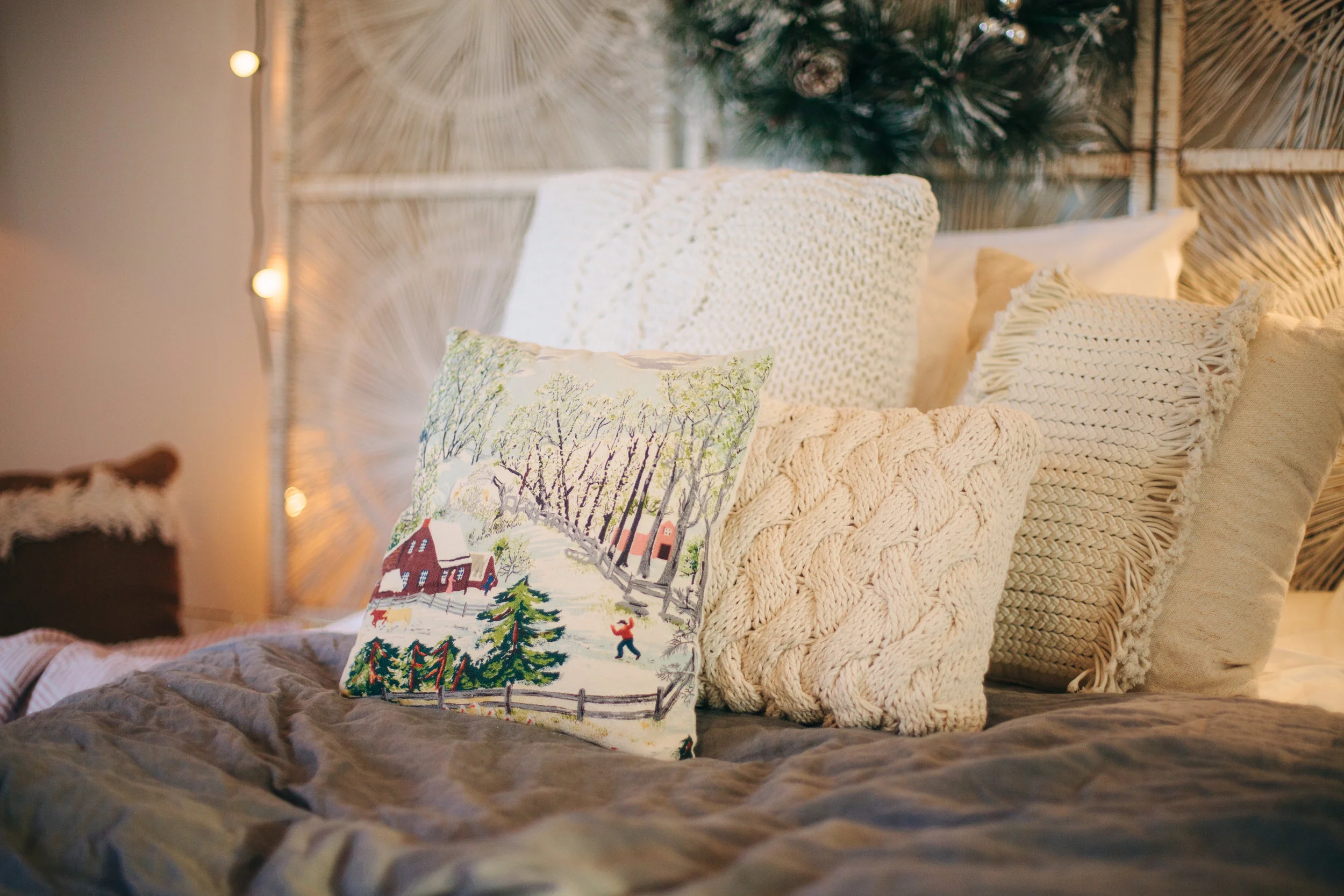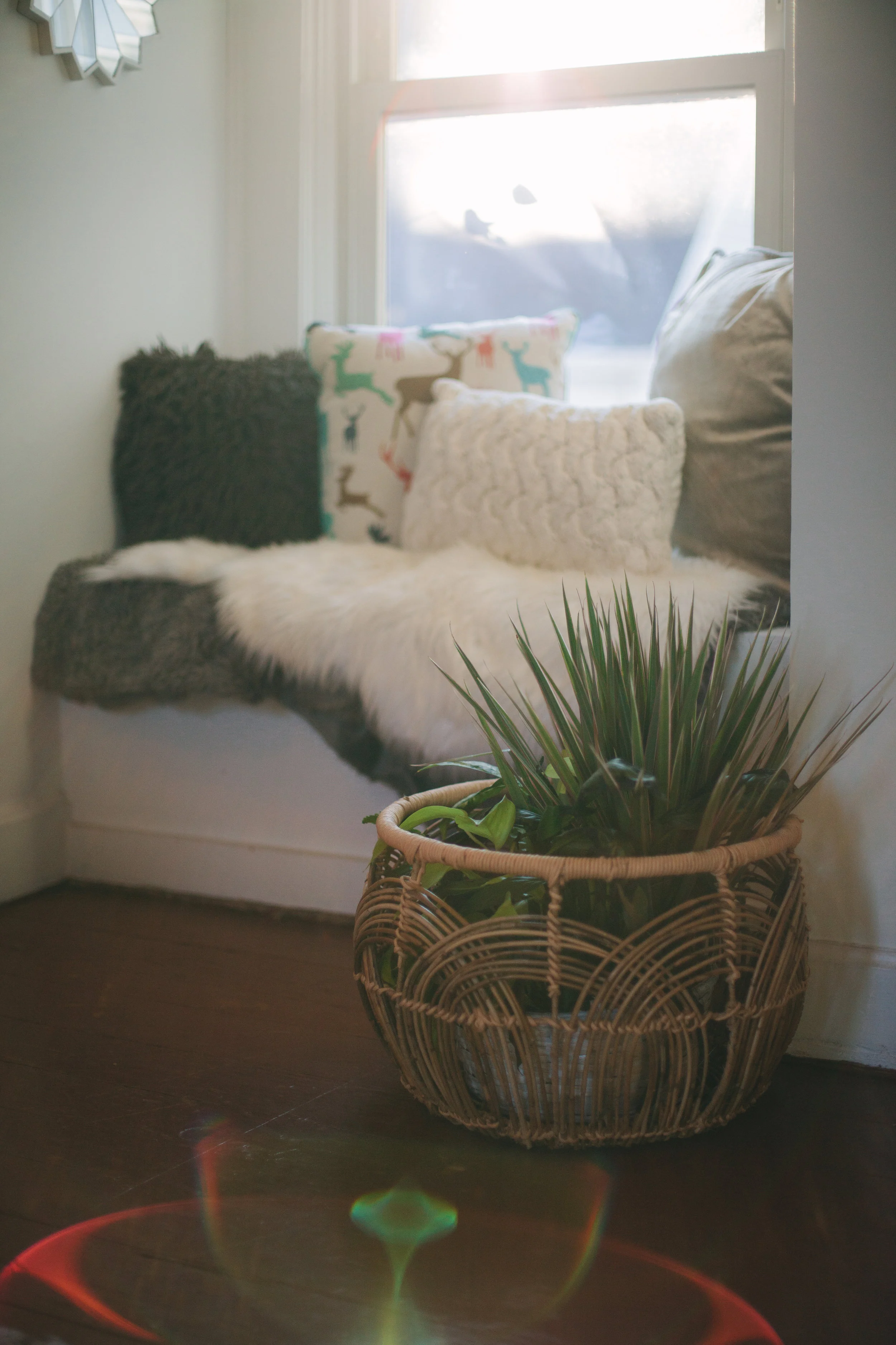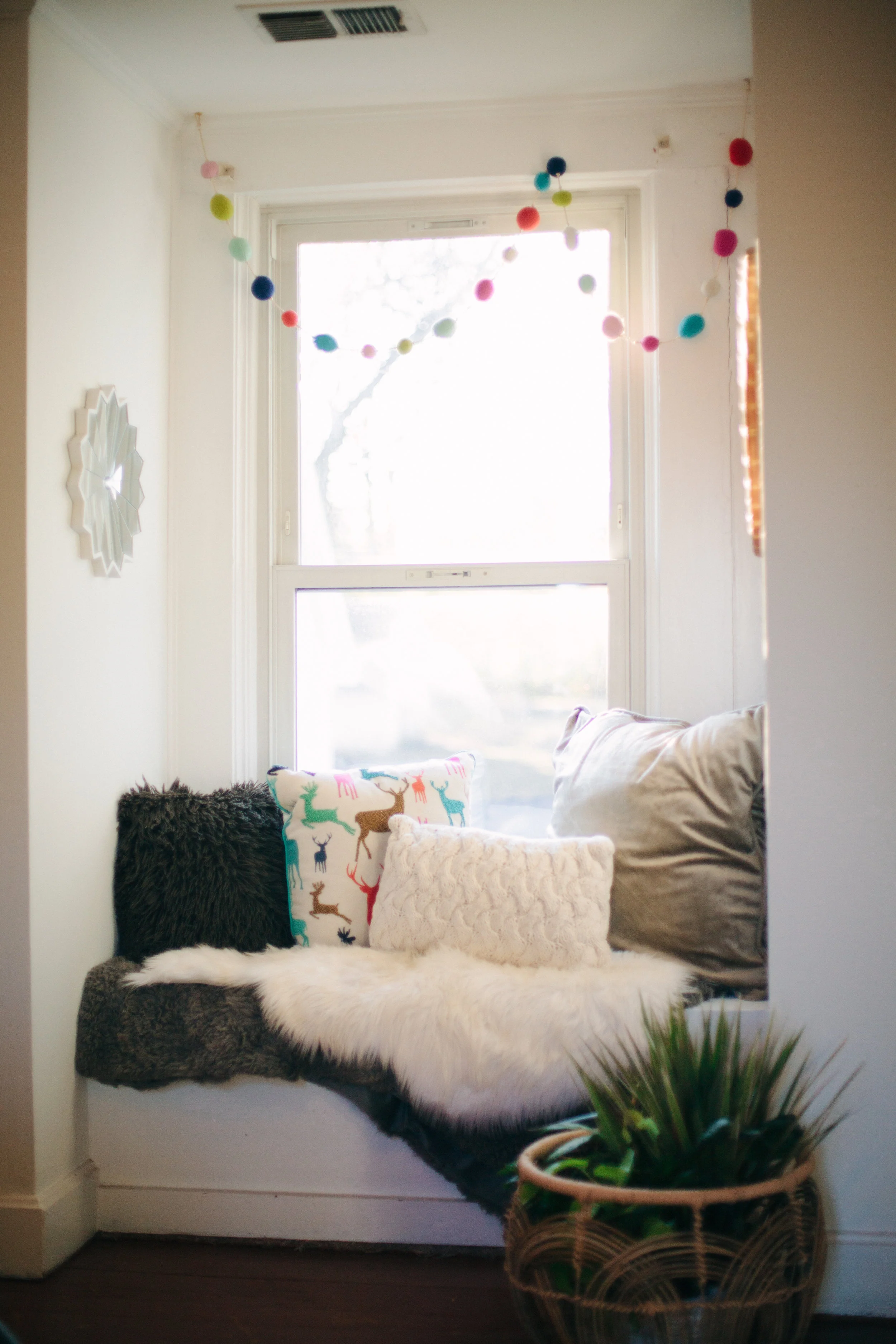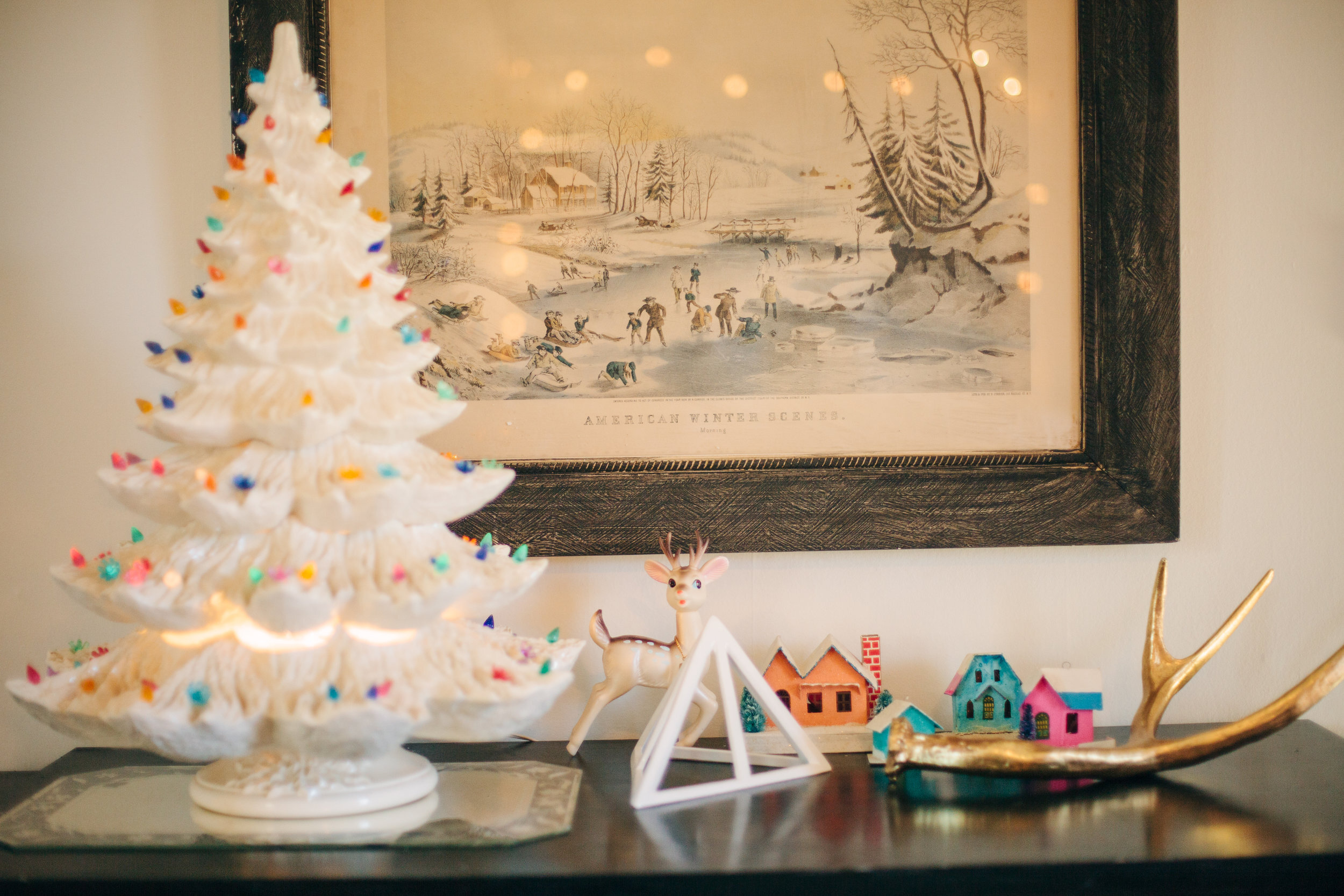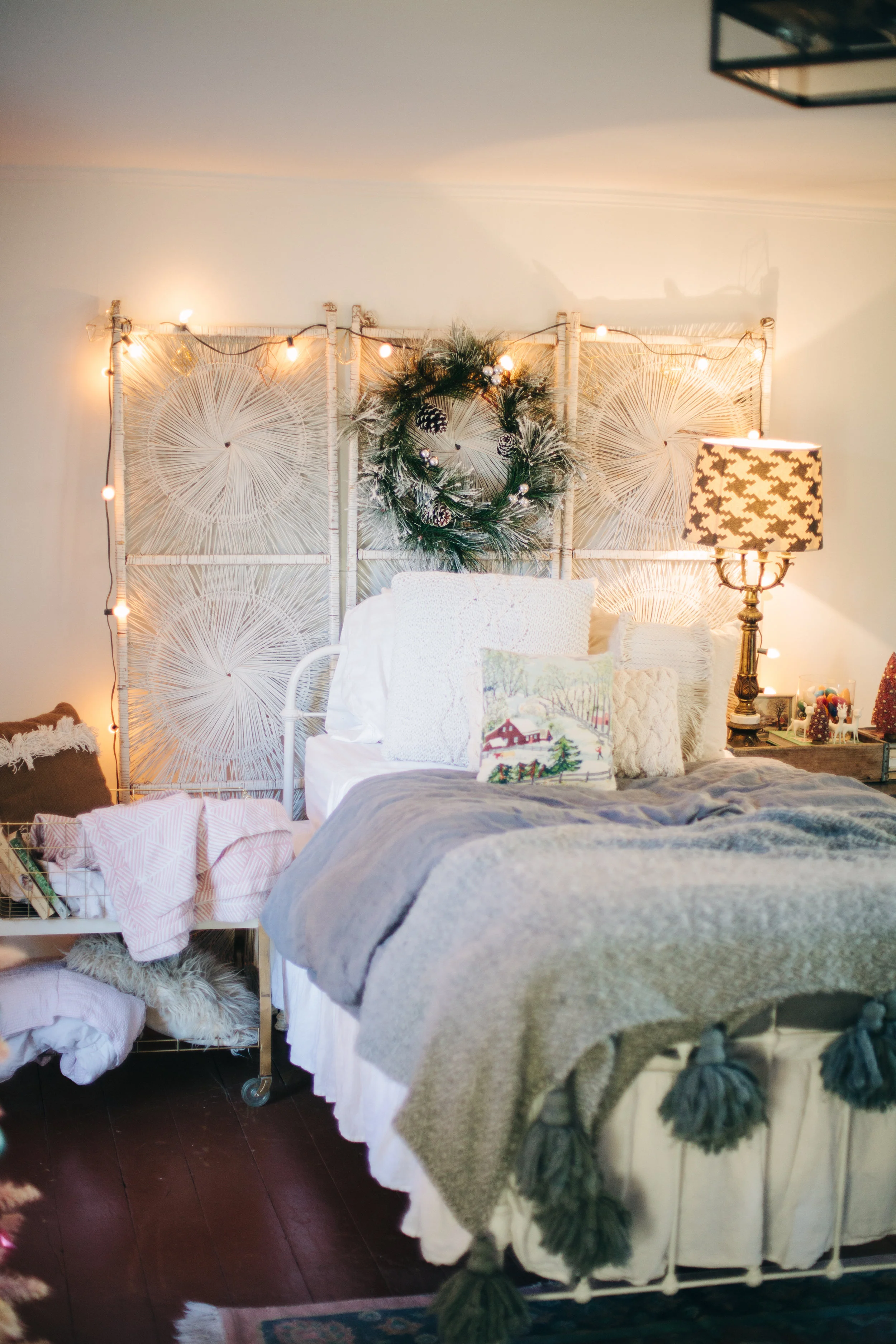 Our little guest bedroom is one of my favorite rooms to decorate for the holidays. I love being able to pile on the pillows, throws, and make the space feel super cozy and inviting. I haven't really gotten around to finalizing the decor in here and besides painting the walls and updating the light fixture, not much has changed since we moved in. We still would like to sand up the painted floors to see if we could restore the wood underneath, but for now I am working with the brown floors (at least it's not carpet!). Since the color scheme has stayed pretty neutral in here, I added some pops of pastel for Christmas; mostly because I just HAD to find somewhere to put my pink flocked tree! Over the years I have collected a lot of little pastel vintage Christmasy trinkets and this seemed like the perfect room for them. I mixed in lots of creamy knit pillows and gray tones too so that the pastels weren't too overpowering and juvenile feeling. The room felt a little bare before but with all the Christmas decorations it instantly feels more cozy + complete- who wants to come stay?!