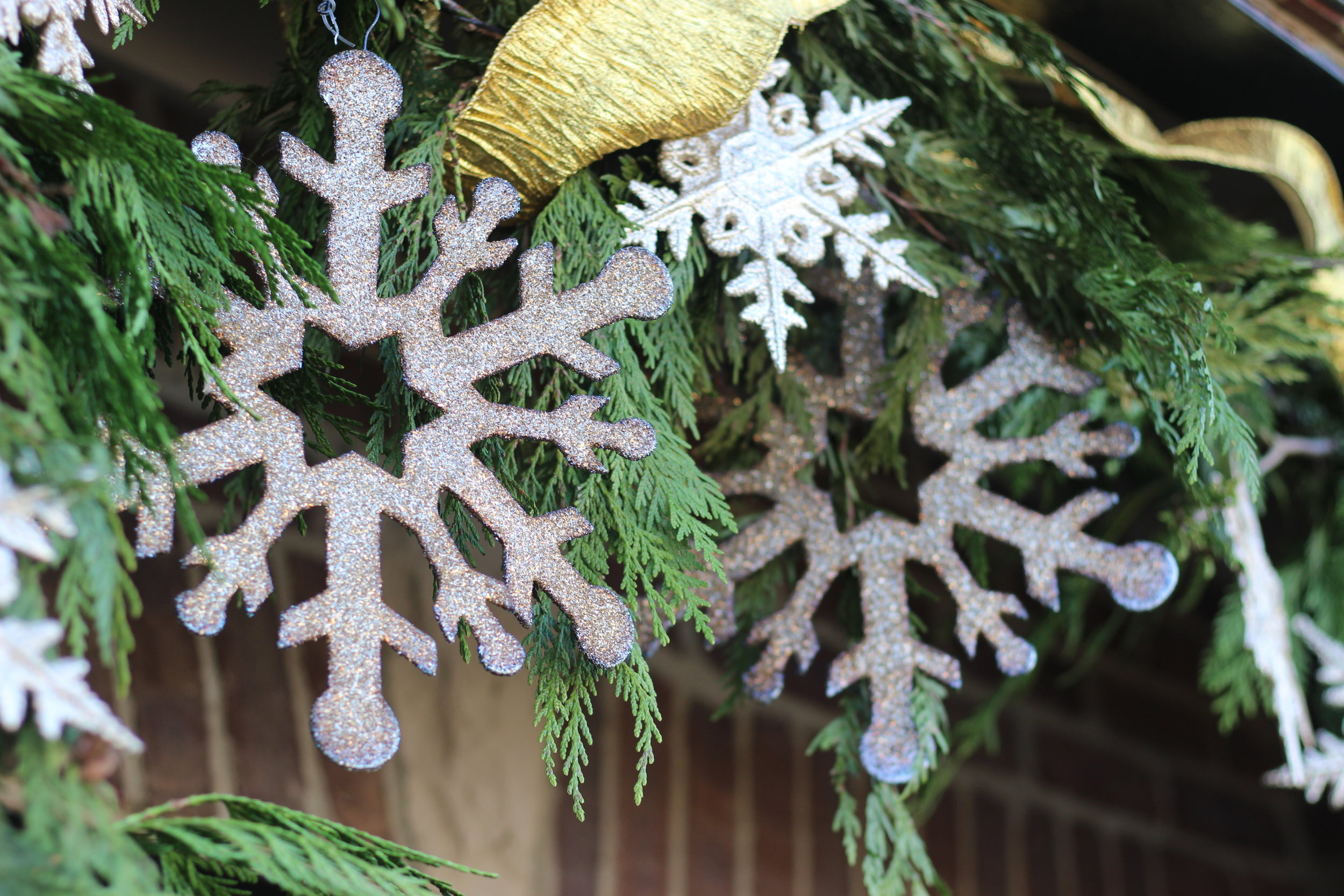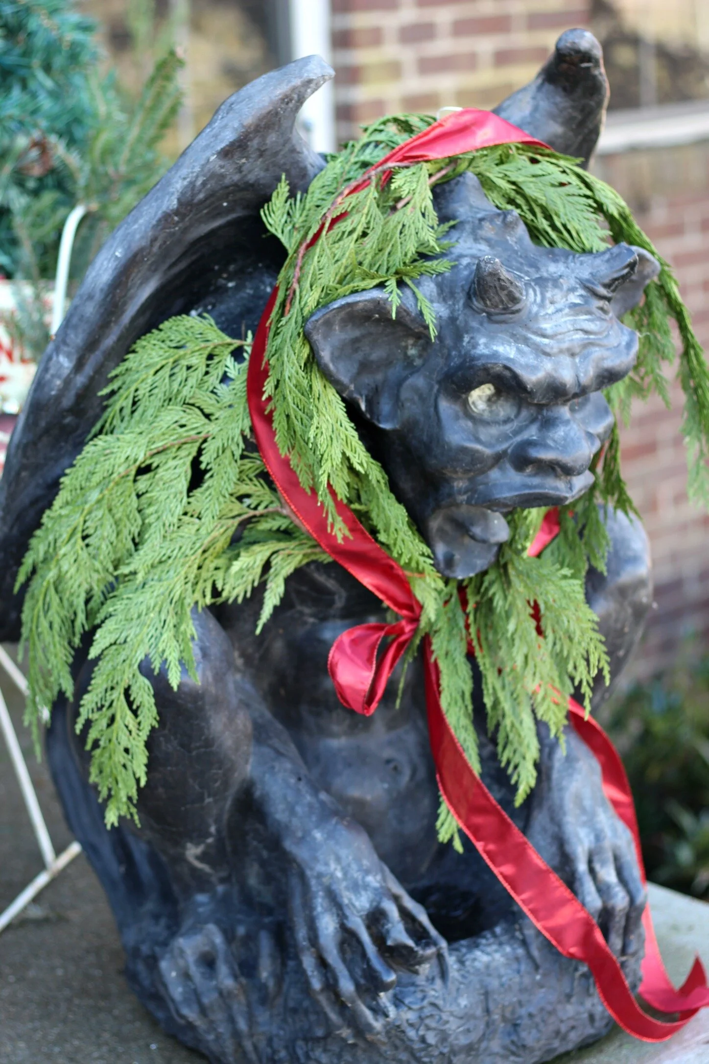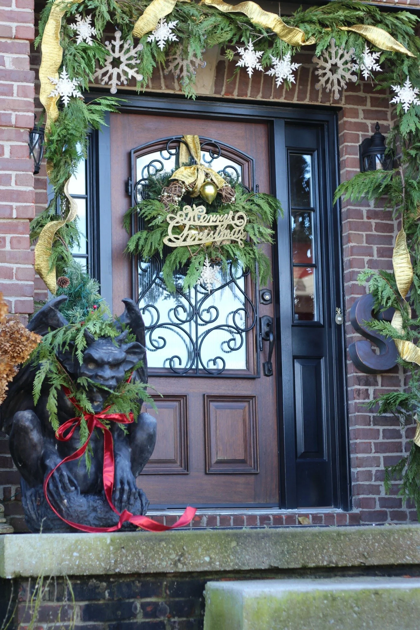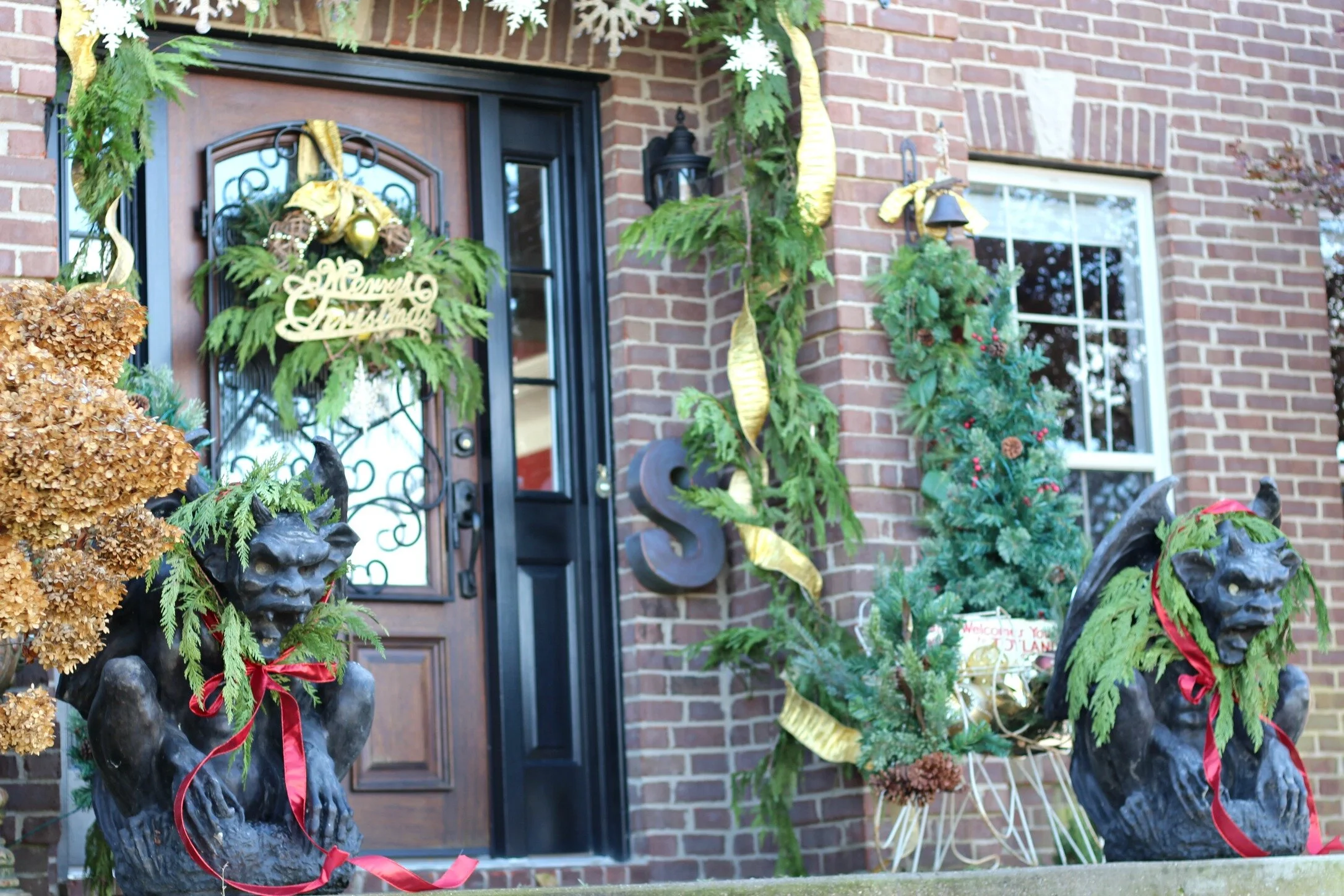 Yesterday I completed another holiday decorating project for a wonderful client who had the most unique and cool style. I love when clients have a very specific design style that I can work with, and this client's home was an eclectic mix of beautiful antiques, kitschy vintage, and gothic elements. She had some great vintage pieces for me to work with on the porch including an old metal sleigh, ornaments, and giant glittered snowflakes. You also may notice our two friends, giant antique gargoyles, who sit on the edge of the porch watching over anyone who may enter. I used many of her ornaments to create a custom wreath with lots of fresh greenery to make it super dramatic (I thought any porch with gargoyles calls for the most dramatic of decor!). I also knew I wanted to use the giant glitter snowflakes to create an over-the-top draped entry above the doorway. I began by draping two layers of fresh cedar greenery from Home Depot and then placed the snowflakes throughout at different heights. I finished by weaving in an extra wide, shiny gold ribbon for even more drama. I also piled some fresh greenery into the sleigh with a collection of gold ornaments and a small pre-lit tree set in the back for some height. On the other side of the porch I balanced it by placing the other pre-lit tree with an old concrete pedestal planter (also one of the client's items) filled with greenery and some gold ornaments. Last but certainly not least, the gargoyles just HAD to have a little festive touch. So I used wire and some greenery to create little wreaths around their necks and secured it with a bow! I think the finished design is a perfect mix of this client's favorite styles and also super glamorous and beautiful! If you need help with your holiday decorating, or any kind of decorating projects, just fill out the form below to set up a consultation (or click here for more info)!