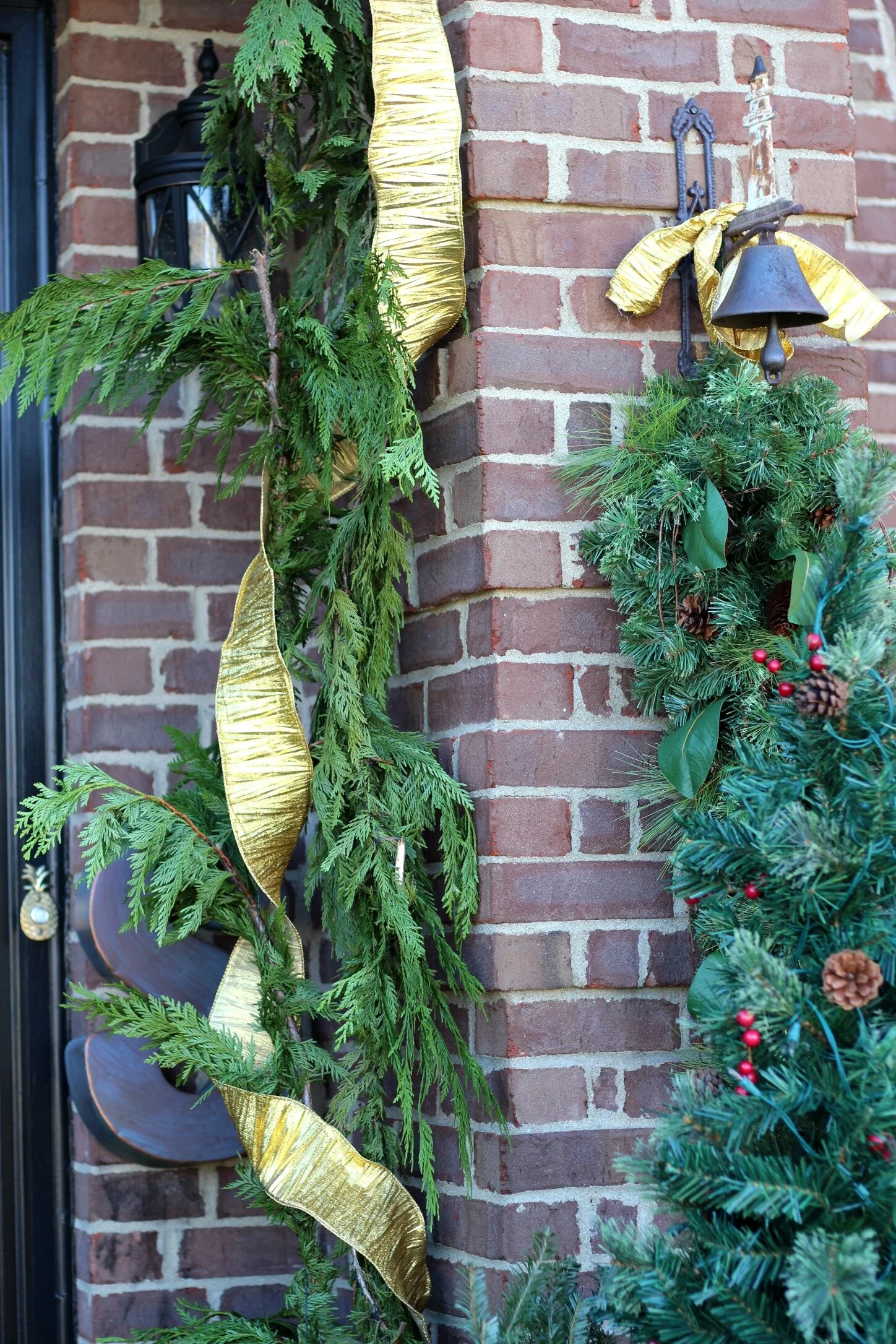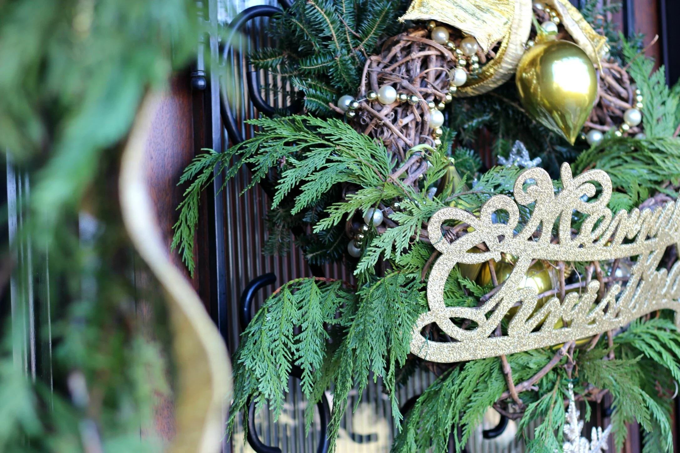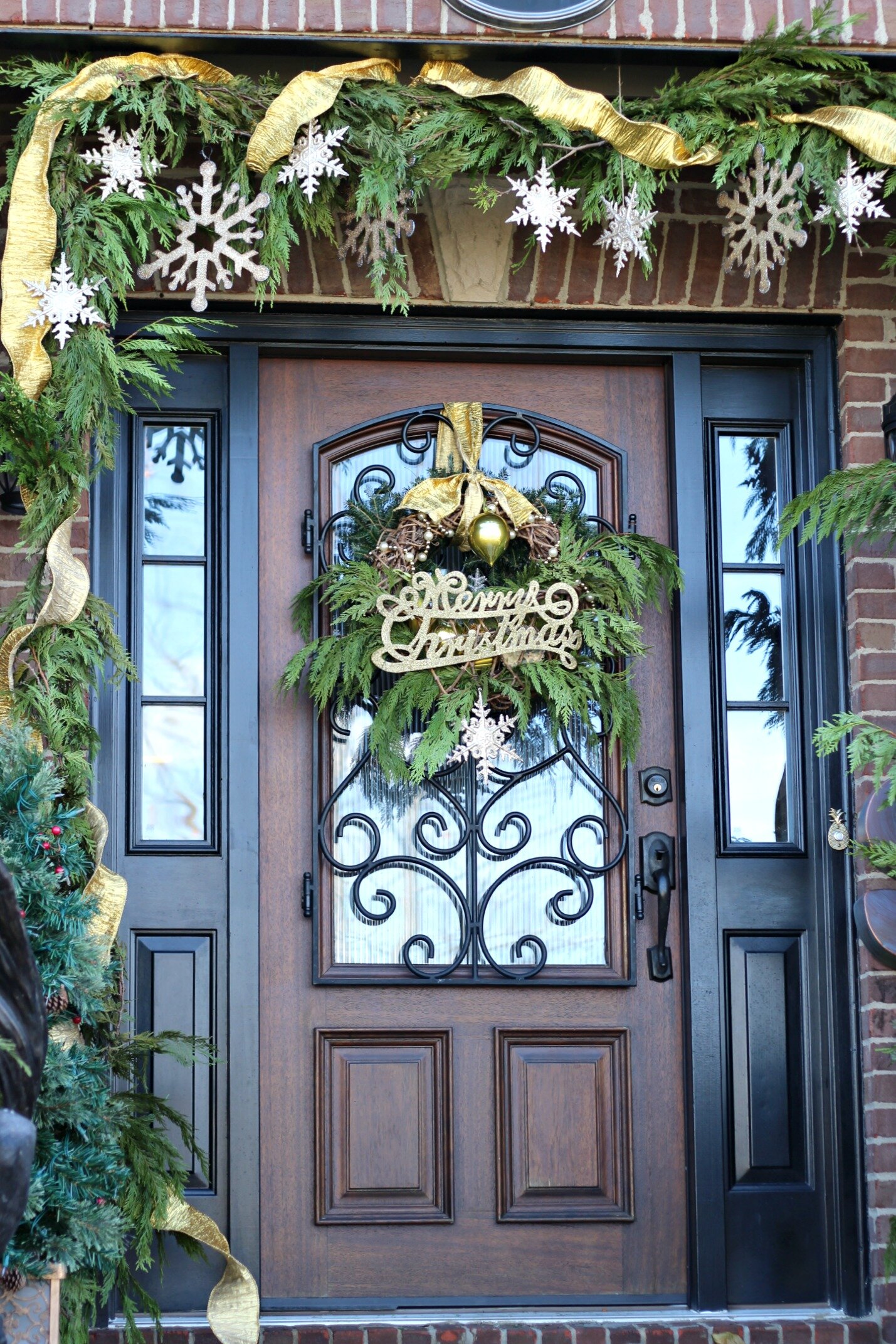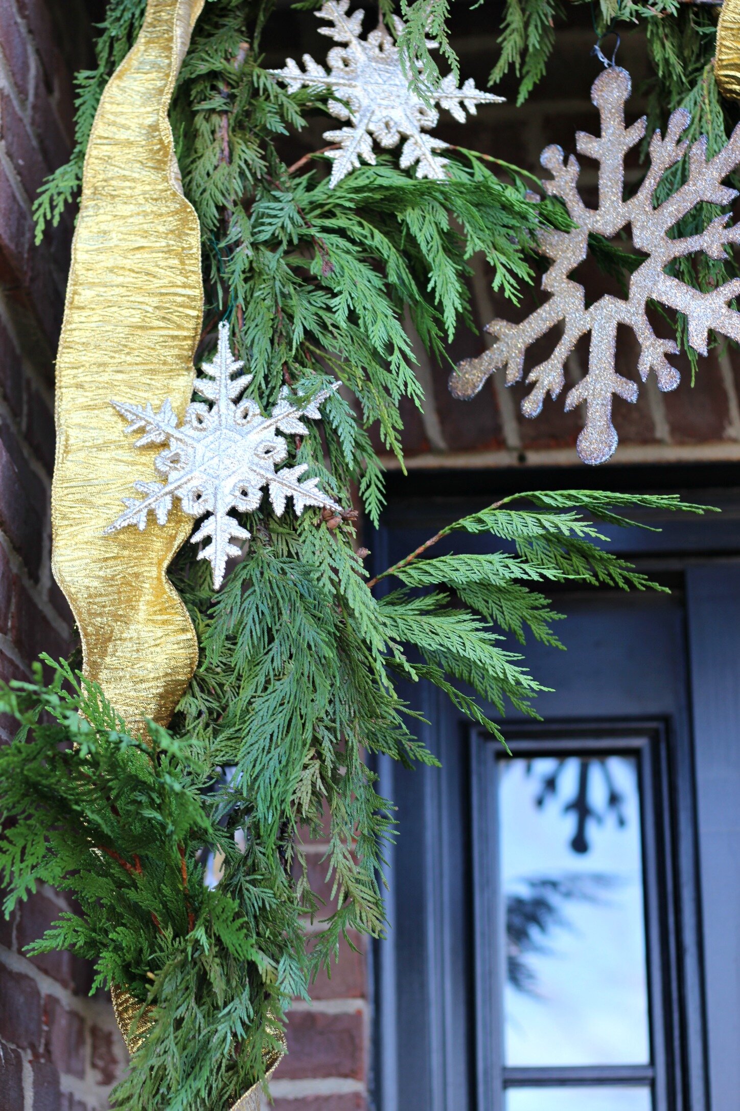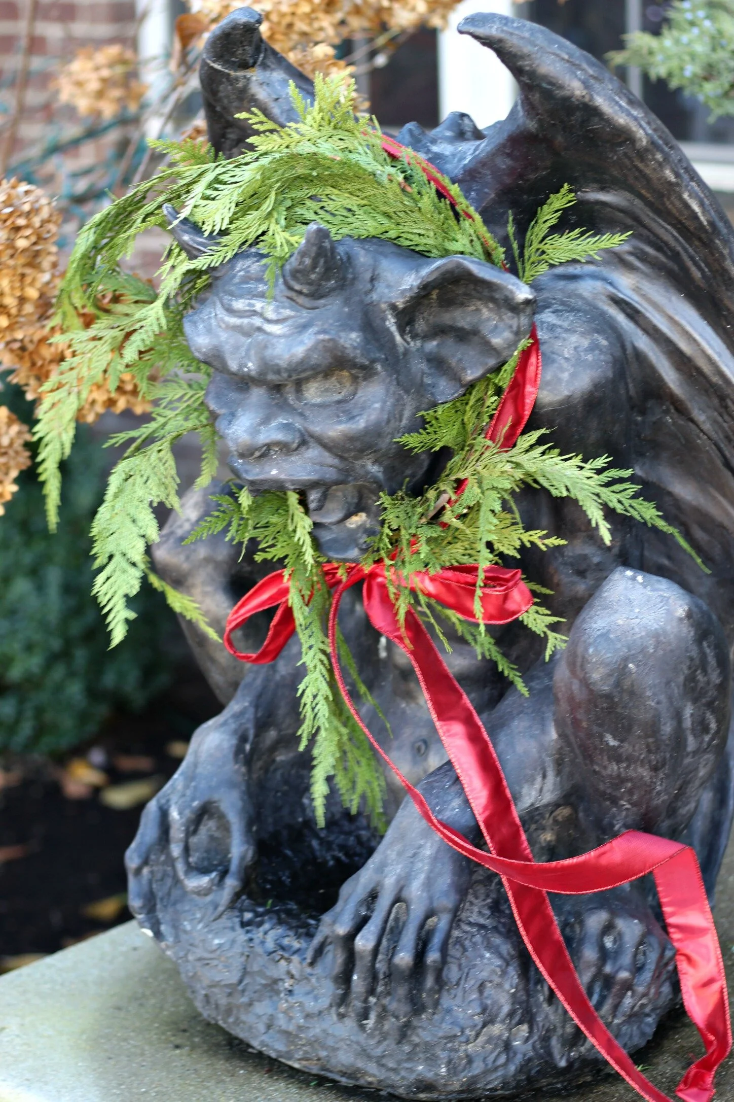 Yesterday I completed another holiday decorating project for a wonderful client who had the most unique and cool style. I love when clients have a very specific design style that I can work with, and this client's home was an eclectic mix of beautiful antiques, kitschy vintage, and gothic elements. She had some great vintage pieces for me to work with on the porch including an old metal sleigh, ornaments, and giant glittered snowflakes. You also may notice our two friends, giant antique gargoyles, who sit on the edge of the porch watching over anyone who may enter. I used many of her ornaments to create a custom wreath with lots of fresh greenery to make it super dramatic (I thought any porch with gargoyles calls for the most dramatic of decor!). I also knew I wanted to use the giant glitter snowflakes to create an over-the-top draped entry above the doorway. I began by draping two layers of fresh cedar greenery from Home Depot and then placed the snowflakes throughout at different heights. I finished by weaving in an extra wide, shiny gold ribbon for even more drama. I also piled some fresh greenery into the sleigh with a collection of gold ornaments and a small pre-lit tree set in the back for some height. On the other side of the porch I balanced it by placing the other pre-lit tree with an old concrete pedestal planter (also one of the client's items) filled with greenery and some gold ornaments. Last but certainly not least, the gargoyles just HAD to have a little festive touch. So I used wire and some greenery to create little wreaths around their necks and secured it with a bow! I think the finished design is a perfect mix of this client's favorite styles and also super glamorous and beautiful! If you need help with your holiday decorating, or any kind of decorating projects, just fill out the form below to set up a consultation (or click here for more info)!