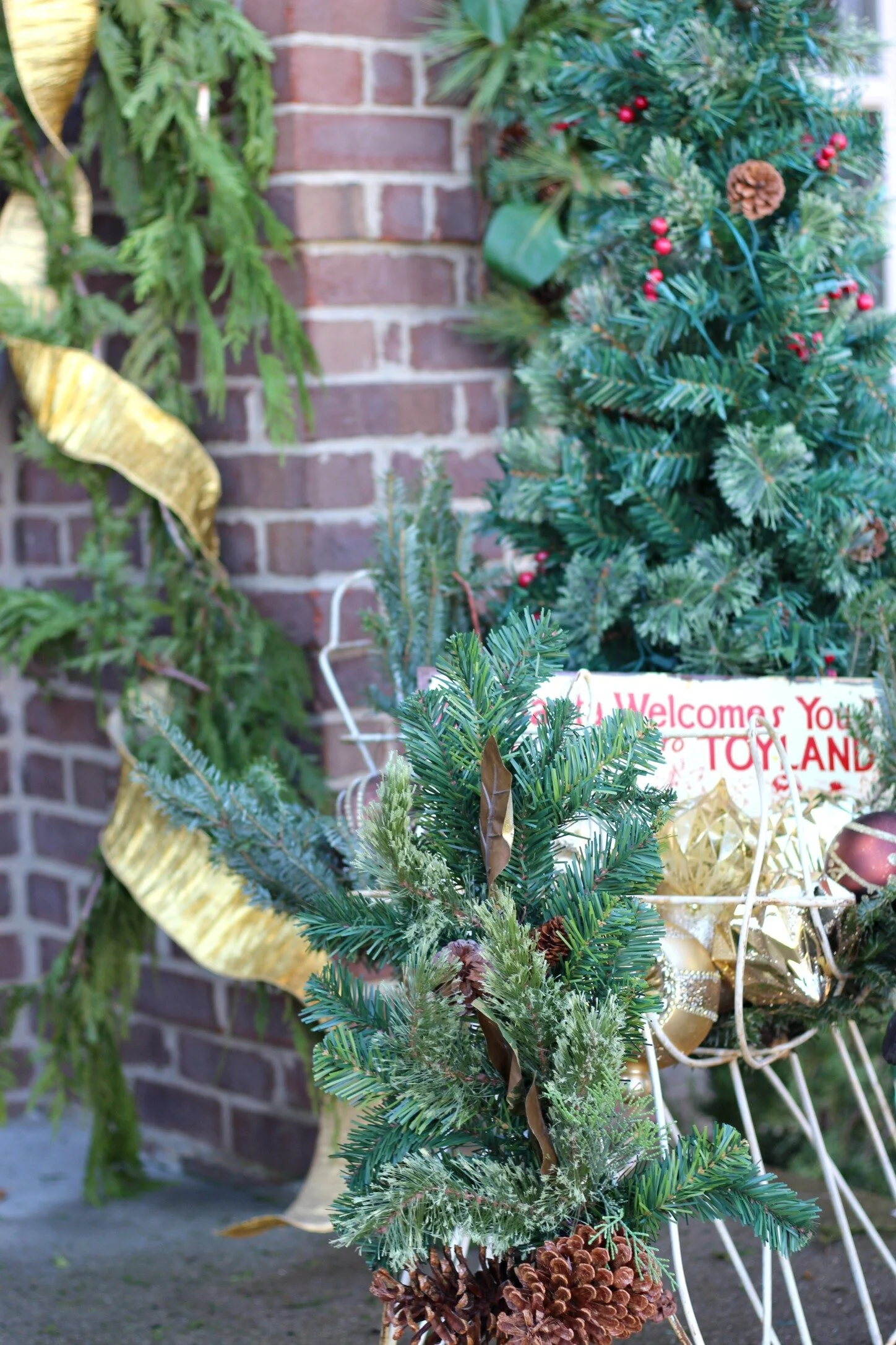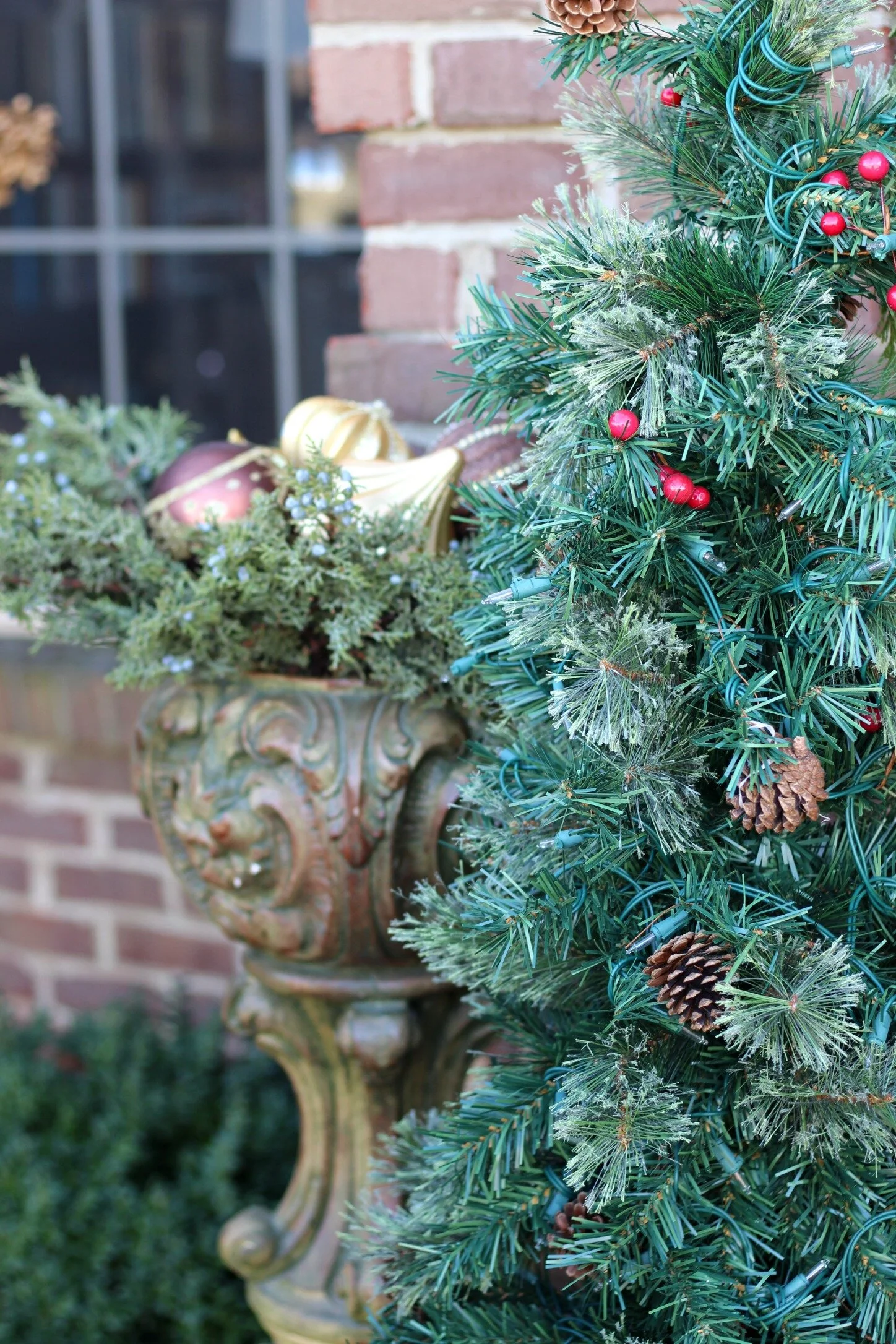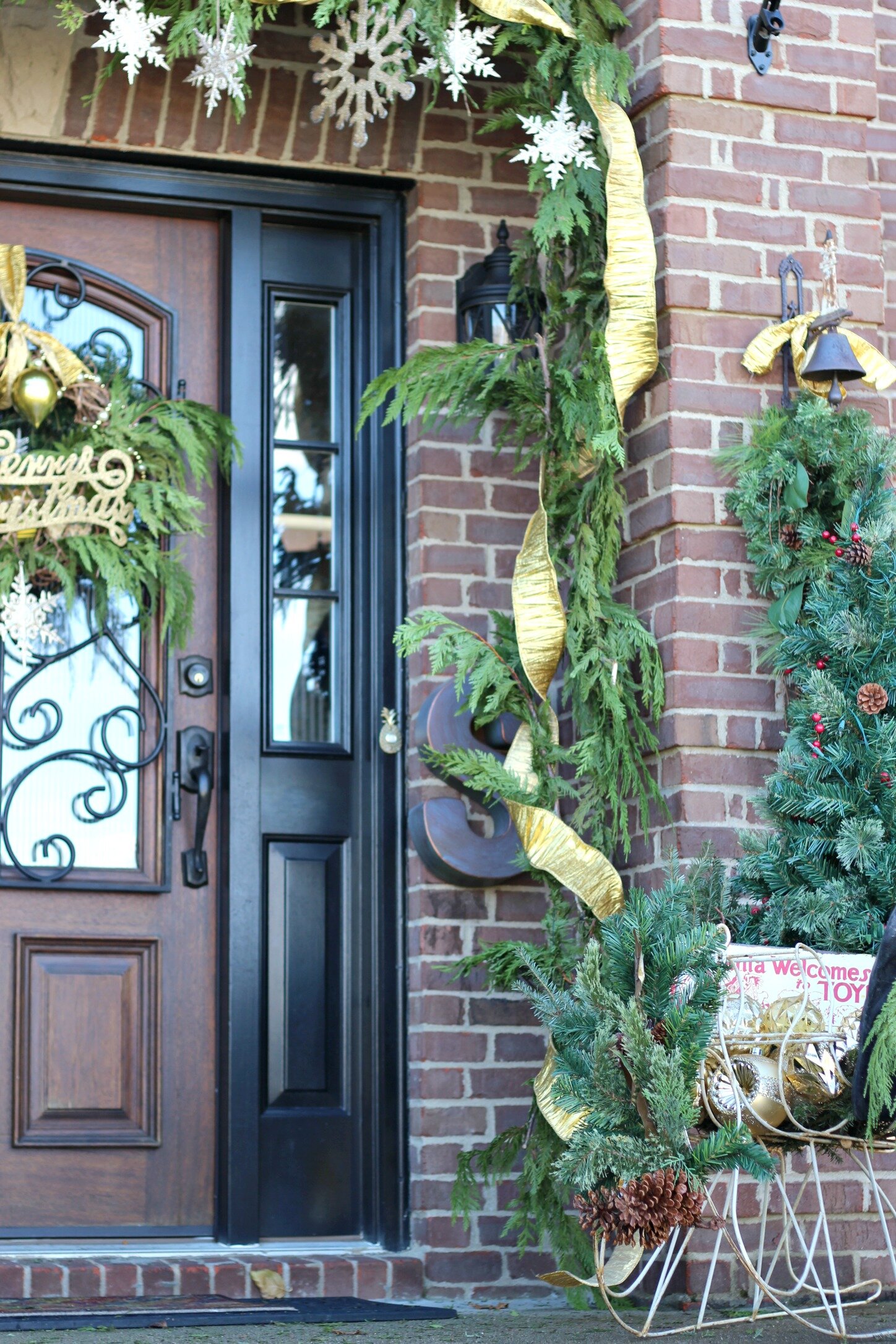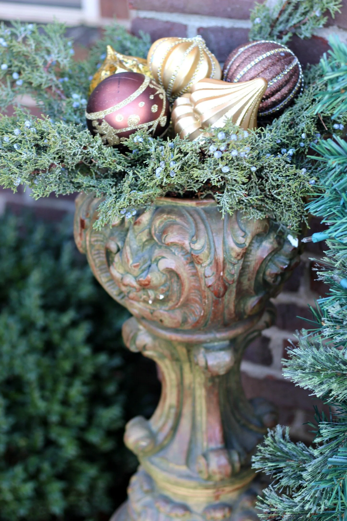 Yesterday I completed another holiday decorating project for a wonderful client who had the most unique and cool style. I love when clients have a very specific design style that I can work with, and this client's home was an eclectic mix of beautiful antiques, kitschy vintage, and gothic elements. She had some great vintage pieces for me to work with on the porch including an old metal sleigh, ornaments, and giant glittered snowflakes. You also may notice our two friends, giant antique gargoyles, who sit on the edge of the porch watching over anyone who may enter. I used many of her ornaments to create a custom wreath with lots of fresh greenery to make it super dramatic (I thought any porch with gargoyles calls for the most dramatic of decor!). I also knew I wanted to use the giant glitter snowflakes to create an over-the-top draped entry above the doorway. I began by draping two layers of fresh cedar greenery from Home Depot and then placed the snowflakes throughout at different heights. I finished by weaving in an extra wide, shiny gold ribbon for even more drama. I also piled some fresh greenery into the sleigh with a collection of gold ornaments and a small pre-lit tree set in the back for some height. On the other side of the porch I balanced it by placing the other pre-lit tree with an old concrete pedestal planter (also one of the client's items) filled with greenery and some gold ornaments. Last but certainly not least, the gargoyles just HAD to have a little festive touch. So I used wire and some greenery to create little wreaths around their necks and secured it with a bow! I think the finished design is a perfect mix of this client's favorite styles and also super glamorous and beautiful! If you need help with your holiday decorating, or any kind of decorating projects, just fill out the form below to set up a consultation (or click here for more info)!