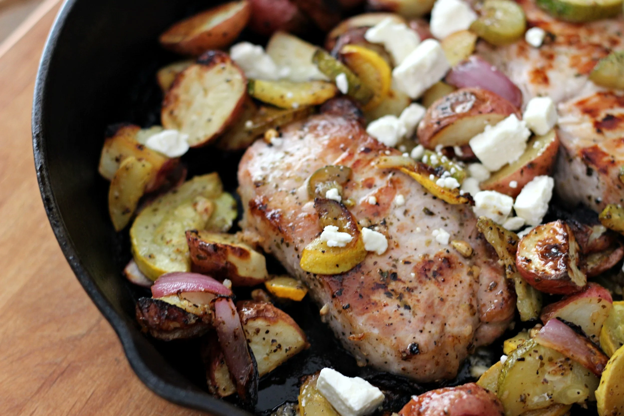 My husband's favorite dinner- he would seriously eat pork for every meal! This is a super easy recipe that you can put together in just a few minutes, marinate during the day, and then toss in the oven just in time for dinner. The fresh, lemony marinade makes both the vegetables and porkchops SO flavorful and keeps the porkchops incredibly moist inside while the outside gets just a little charred.