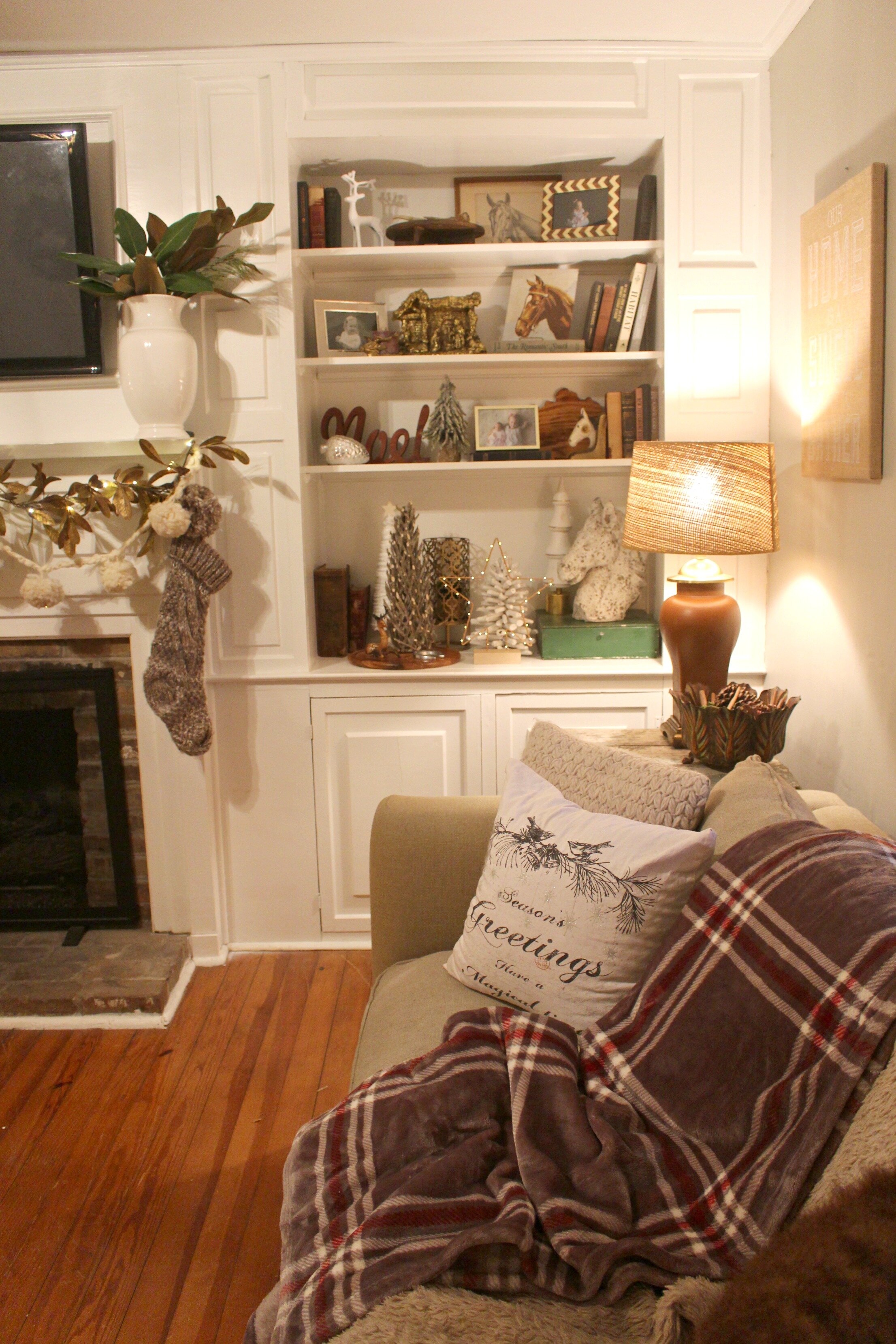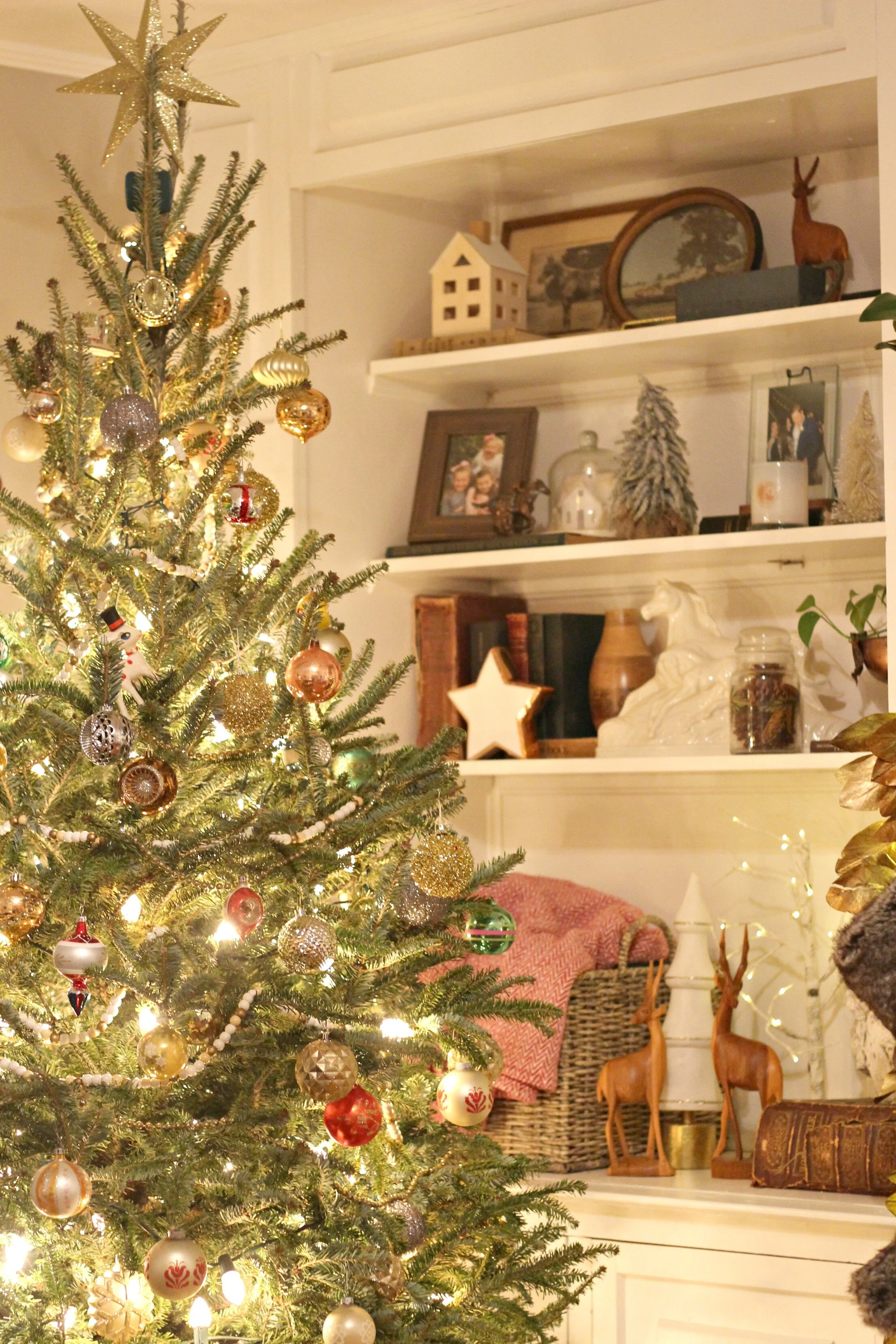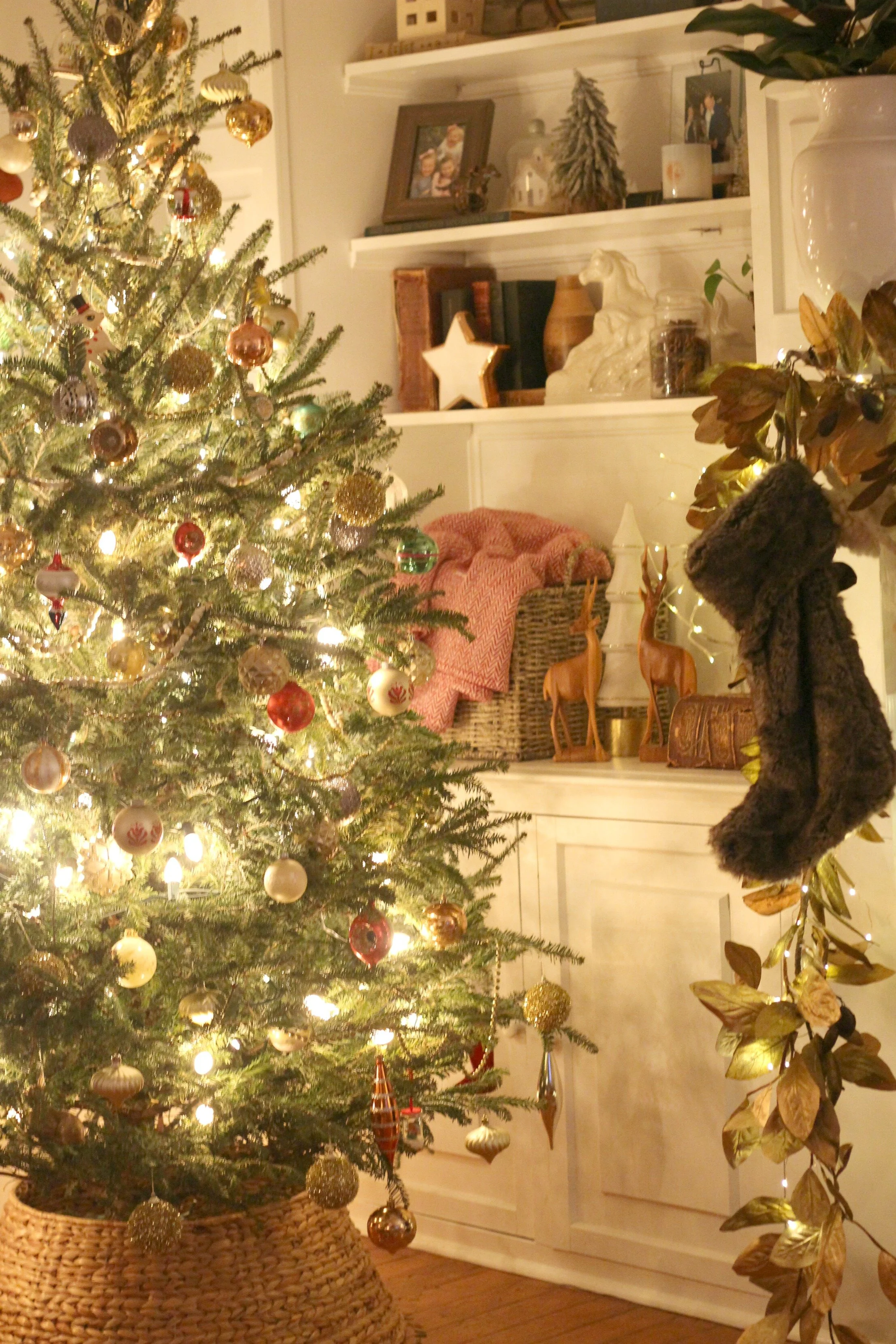 I'm wrapping up our holiday home tour with the center of our home: the living room. We spend the most time in this space so it's important that the decor is comfortable and cozy, but still special and beautiful at the same time. I always like to keep the living room decor semi-traditional and pretty neutral. I use my most favorite vintage ornaments on this tree every year and lots of greenery, cozy stockings, faux fur, and of course lots of gold! I loved having these built-in bookshelves to style this year and had no problem filling them up with a mix of vintage and new trinkets and treasures.