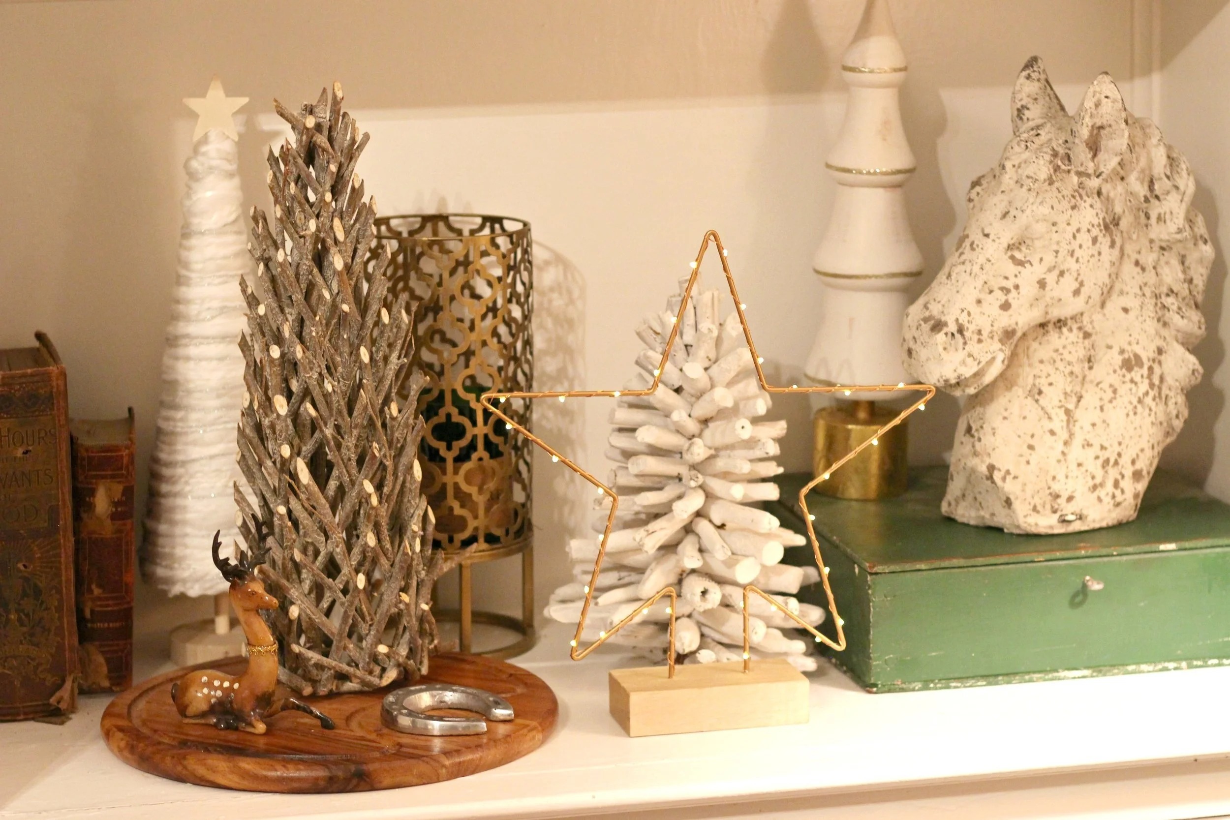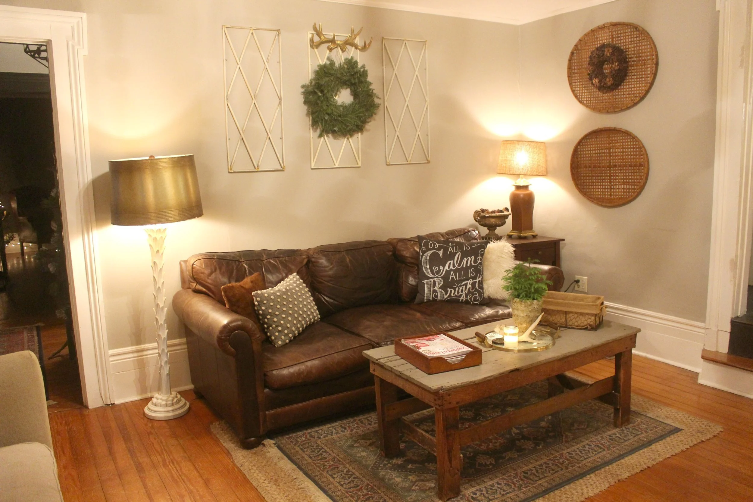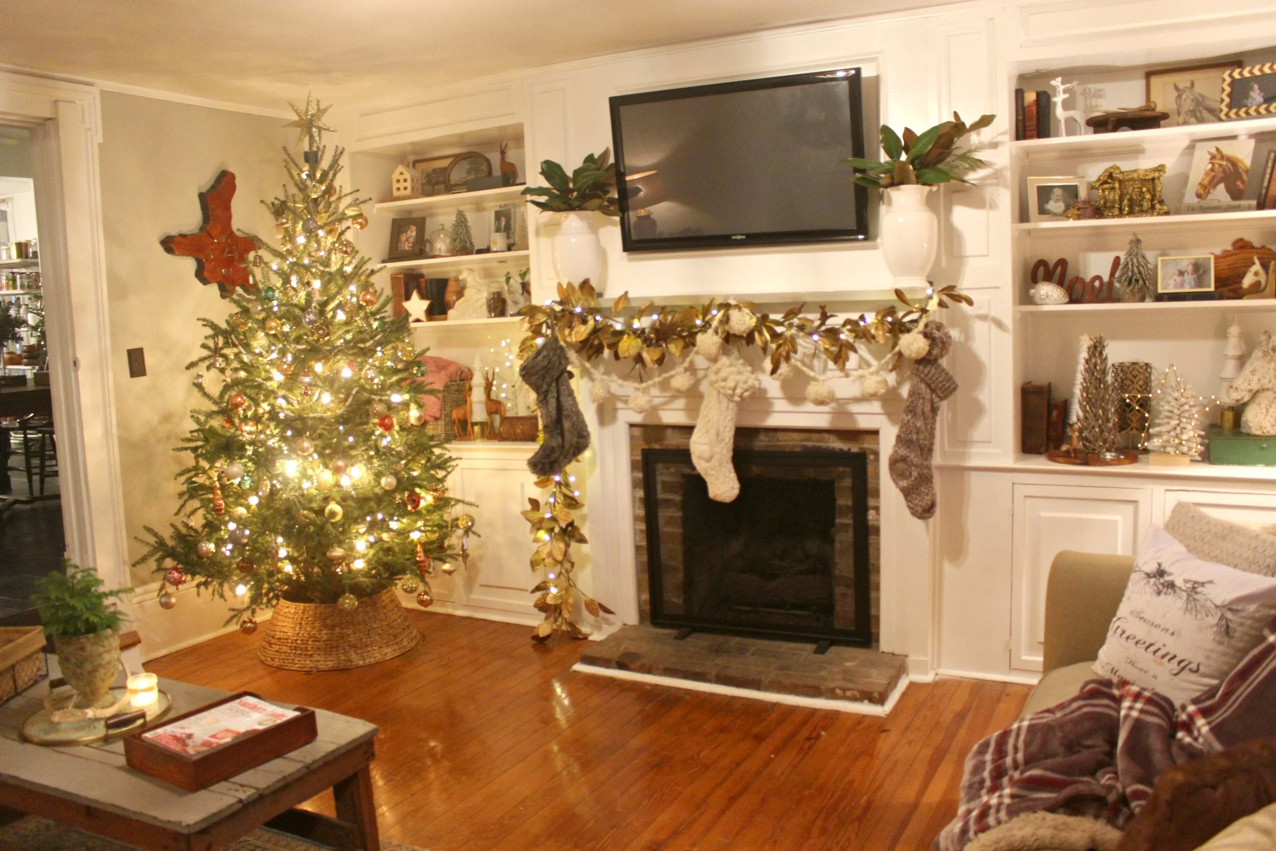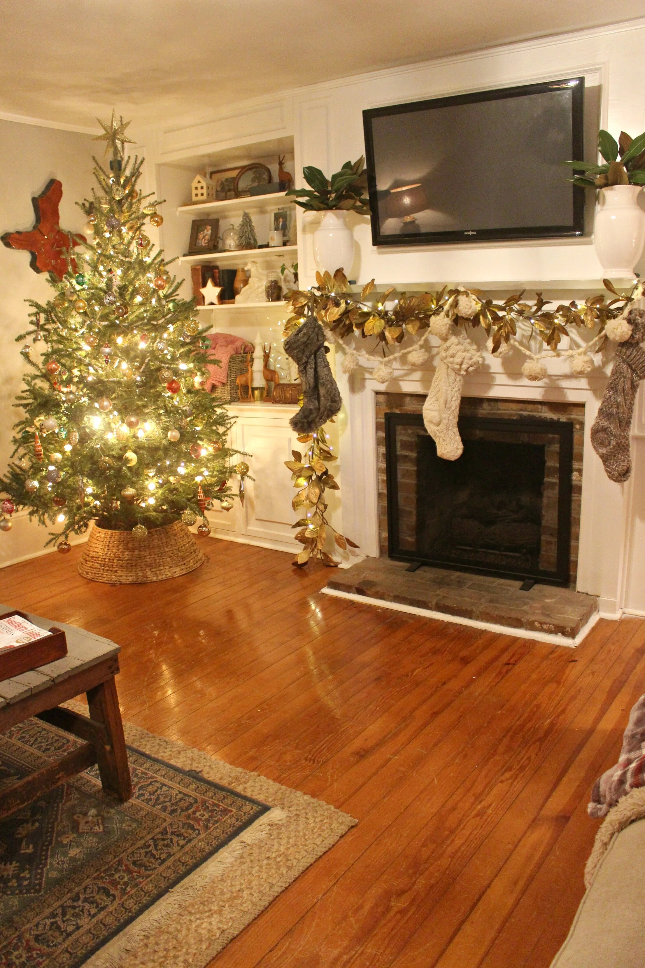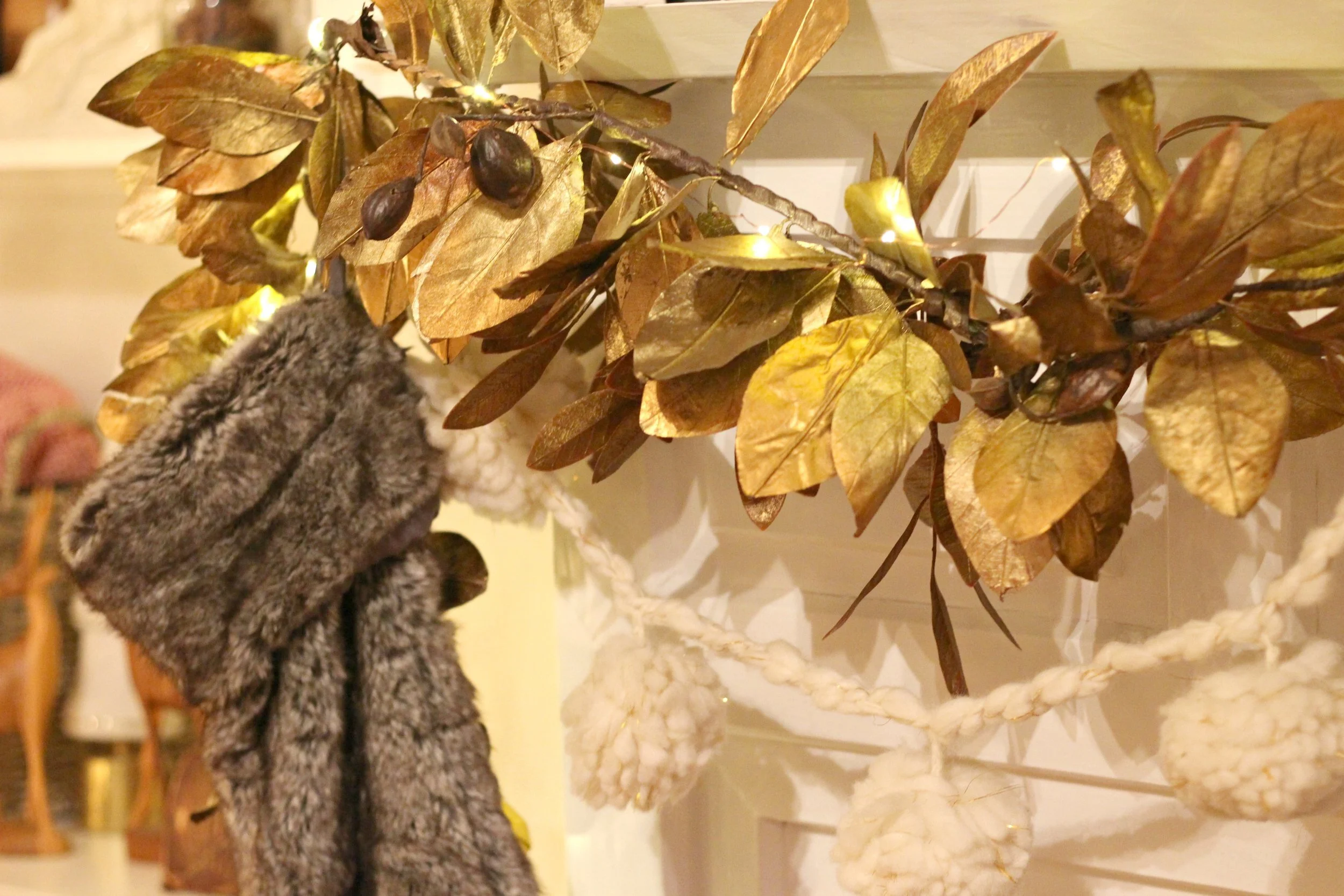 Probably my favorite element of the room is the mantle decor. I used three different gold magnolia garlands draped together off to one side and added wire twinkle lights on top. I have found all these magnolia garlands at different times while thrifting and I seriously use them all year round all over my house (some of my favorite decor pieces ever!). I layered the magnolia garland with a draped pom-pom garland on top and then chunky knit and faux fur stockings.