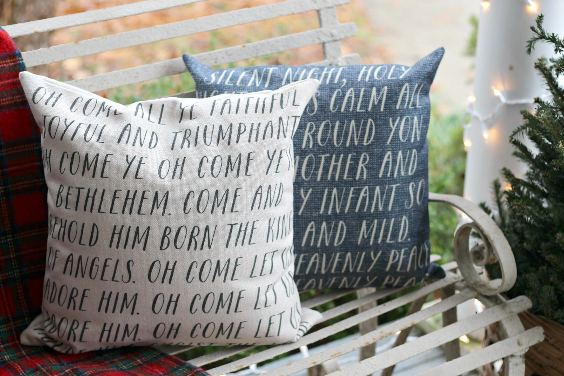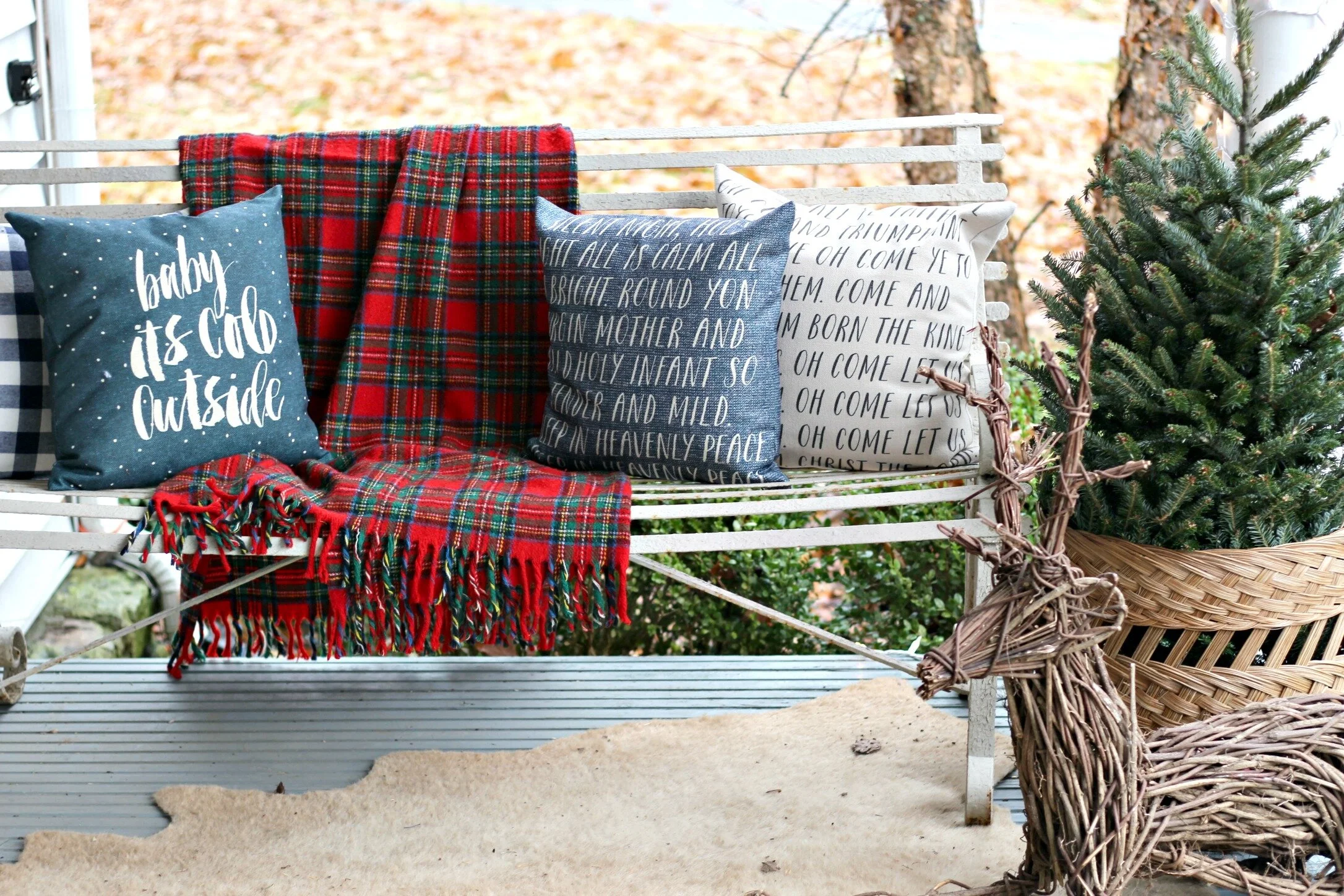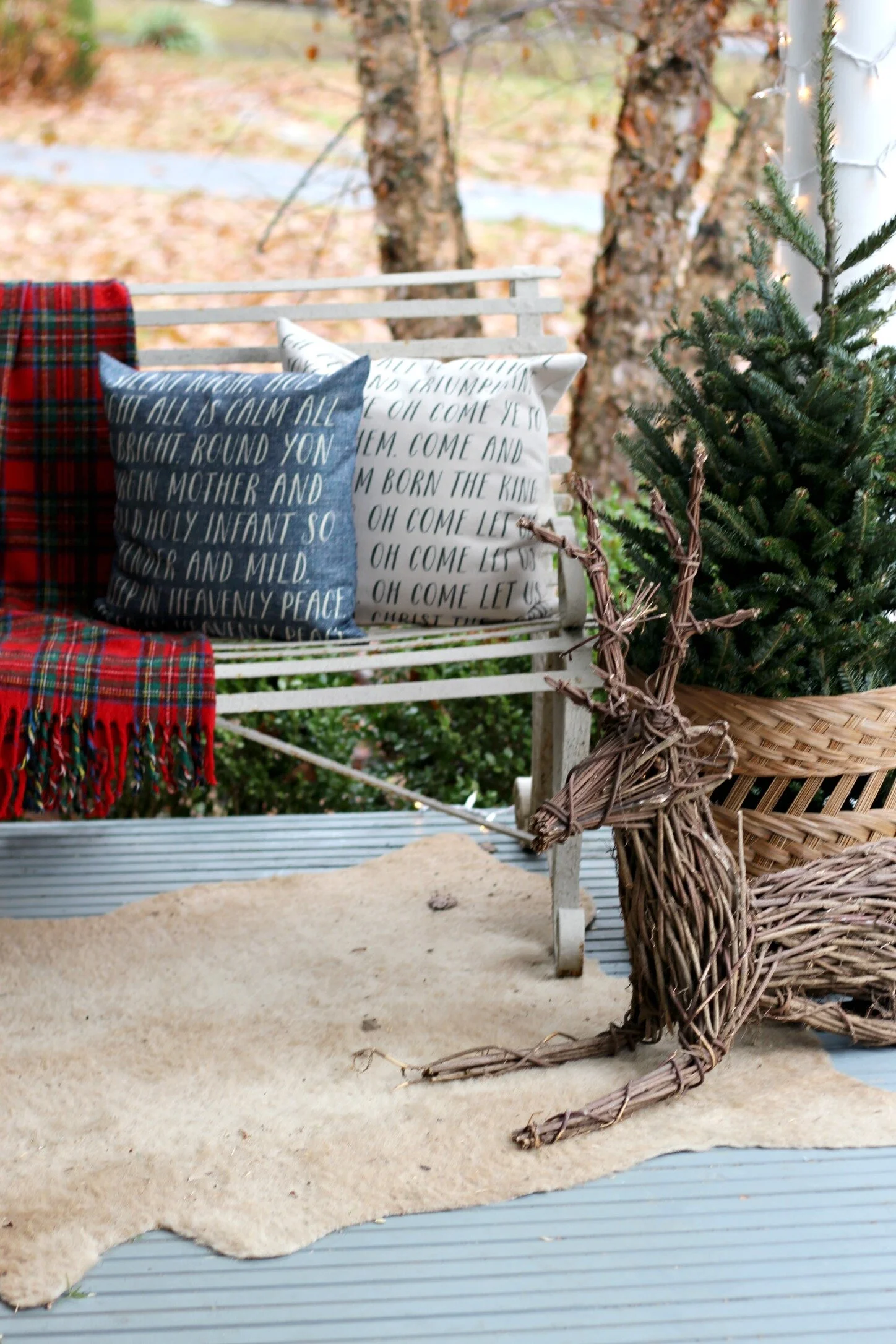 On the front door I layered my favorite gold leaf wreath over a fresh boxwood wreath from Trader Joe's. Layering wreaths is one of my favorite tricks for creating more of a custom look without spending a lot of time or money. I used fresh garland to drape around the door and staircase leading up to the porch too. On each window, I hung a simple fresh wreath too from Home Depot (these go on sale every year on Black Friday, so I always stock up then). I added some holiday cheer to our bench with some Christmas quote pillows from our shop and a bright vintage plaid blanket. I love how a mini fresh Christmas tree looks nestled inside a vintage basket, especially tucked behind a vintage twig reindeer (below).