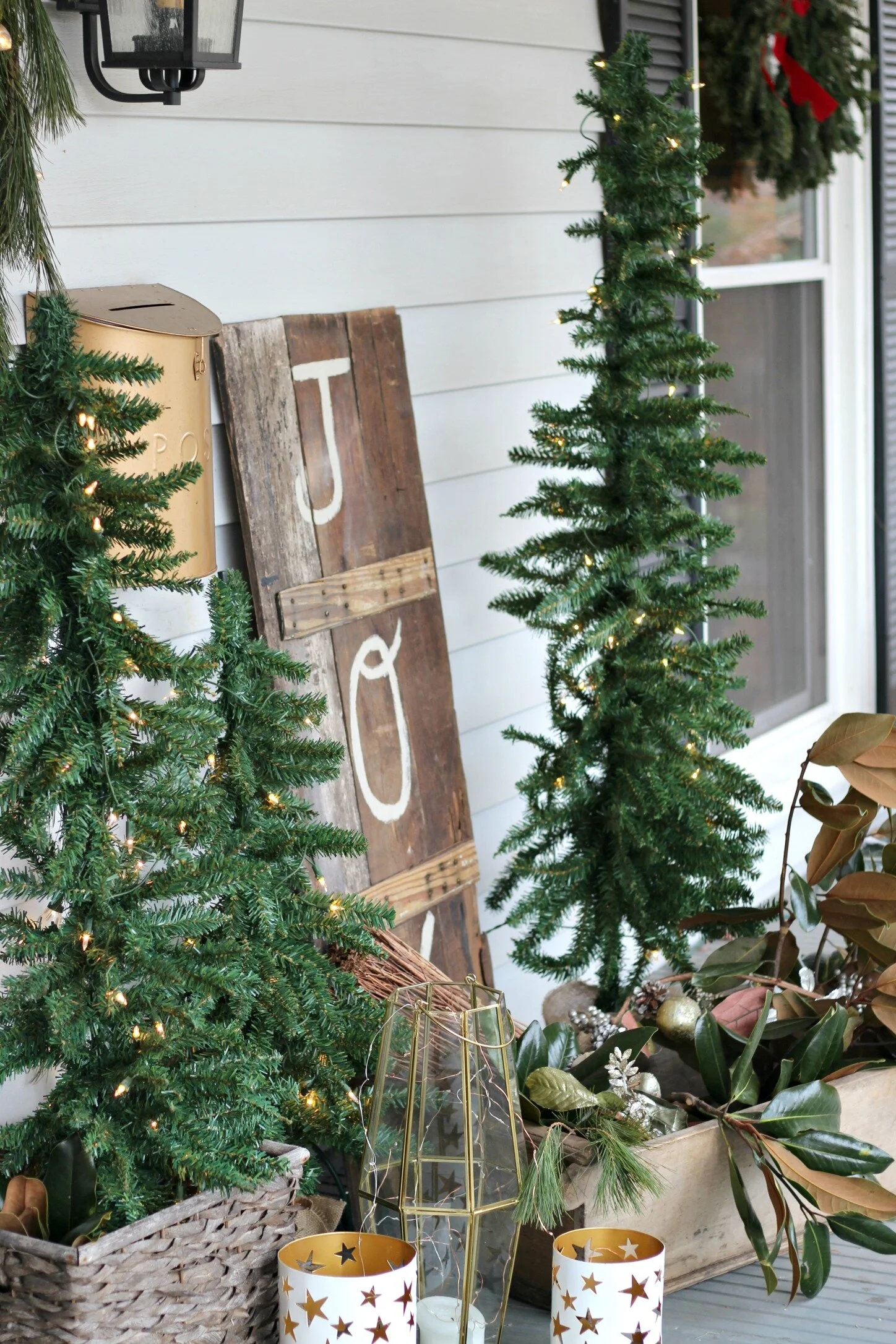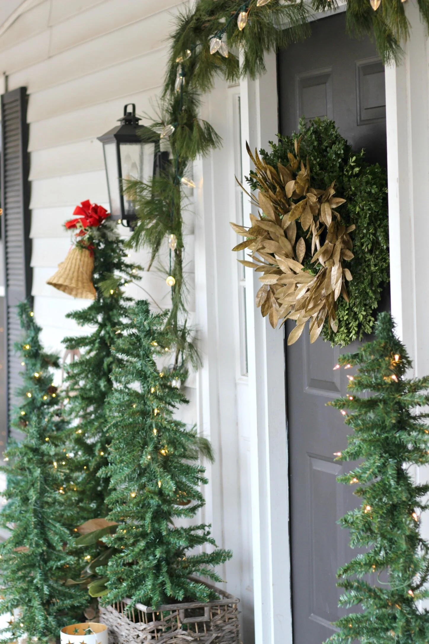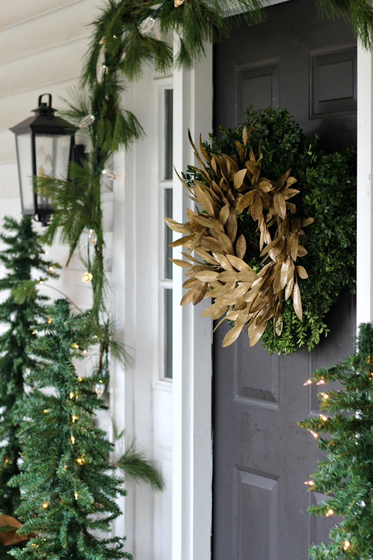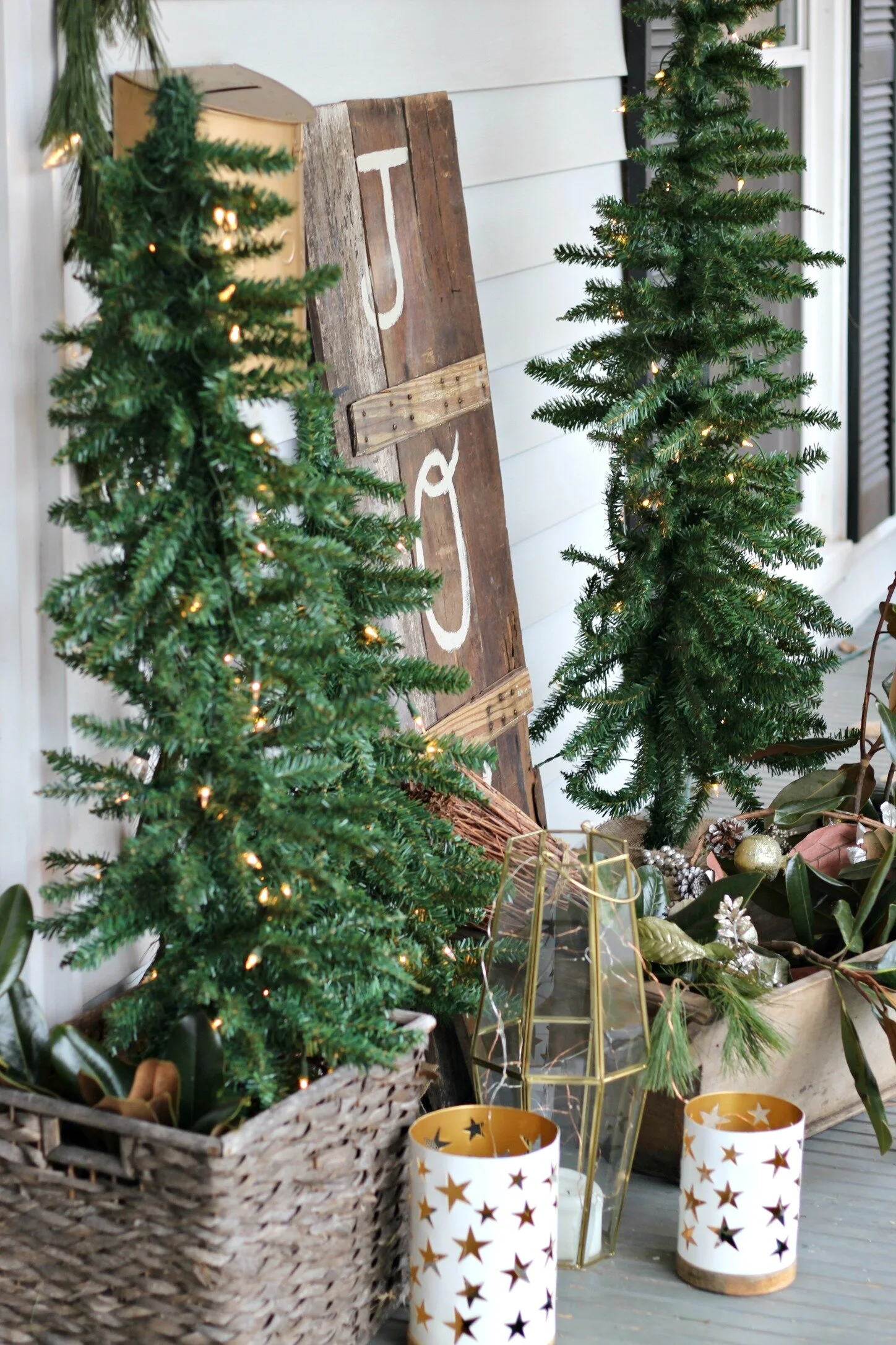 I still have to pinch myself when it comes to decorating our front porch, because I just can't get used to having SO much great space to deck out! We lined the roof lines on the front of our house with lights as well as the columns and staircase on our porch. My favorite element of the porch is the collection of trees and lanterns on each side of the front door. I clustered lots of different sized twig trees, placing some in old buckets or baskets. The trees I used were all pre-lit and came in a 3-pack from Big Lots (all slightly different heights). These were on sale for only $25 for the set of 3 on Black Friday, so I purchased two sets for the porch. Big Lots always seems to have great deals on basics like this for Christmas decorating on Black Friday and these are some of my favorite finds ever from there. I will be able to use them for years to come inside or out. I also used lots of various gold lanterns that I had been collecting from Homegoods + Target throughout the year (and usually used on our side porch) filled with battery-powered twinkle lights for some extra sparkle.