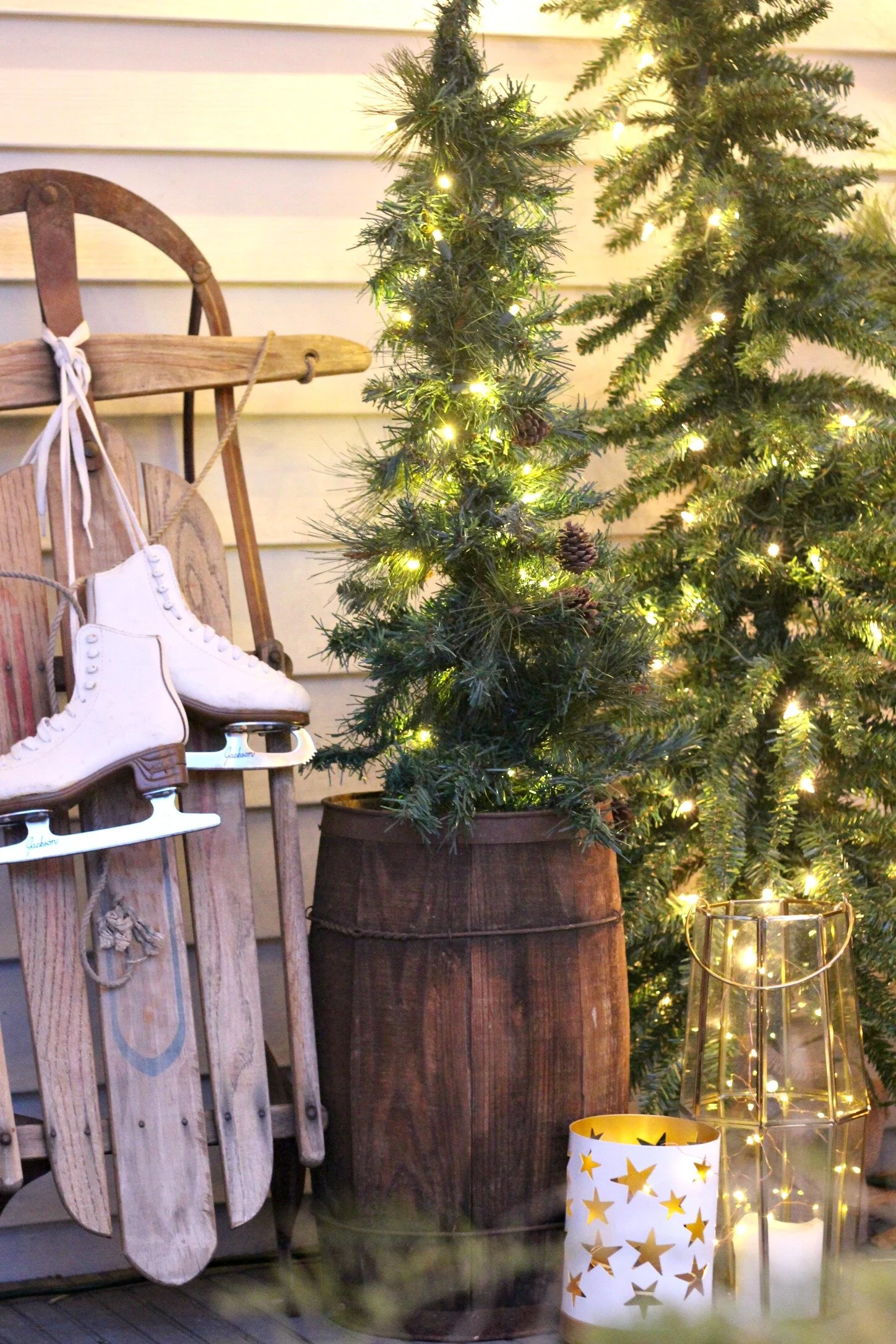I always use my barnwood "JOY" sign on the porch too for Christmas. It is double sided with "FALL" written on the other side so that I can use it throughout both seasons. In front of it I placed a giant wooden trough filled with magnolia branches, fresh greenery, and sticks. I used this same wooden trough for my fall porch too but filled with pumpkins and gourds instead. On the other side of the porch I also added a vintage sleigh and ice skates leaning beside the trees. Vintage sleighs are something that is super easy to find while thrifting or at antique shops, and are perfect for decorating inside or outside your home (and they can stay out all winter even past Christmas!).