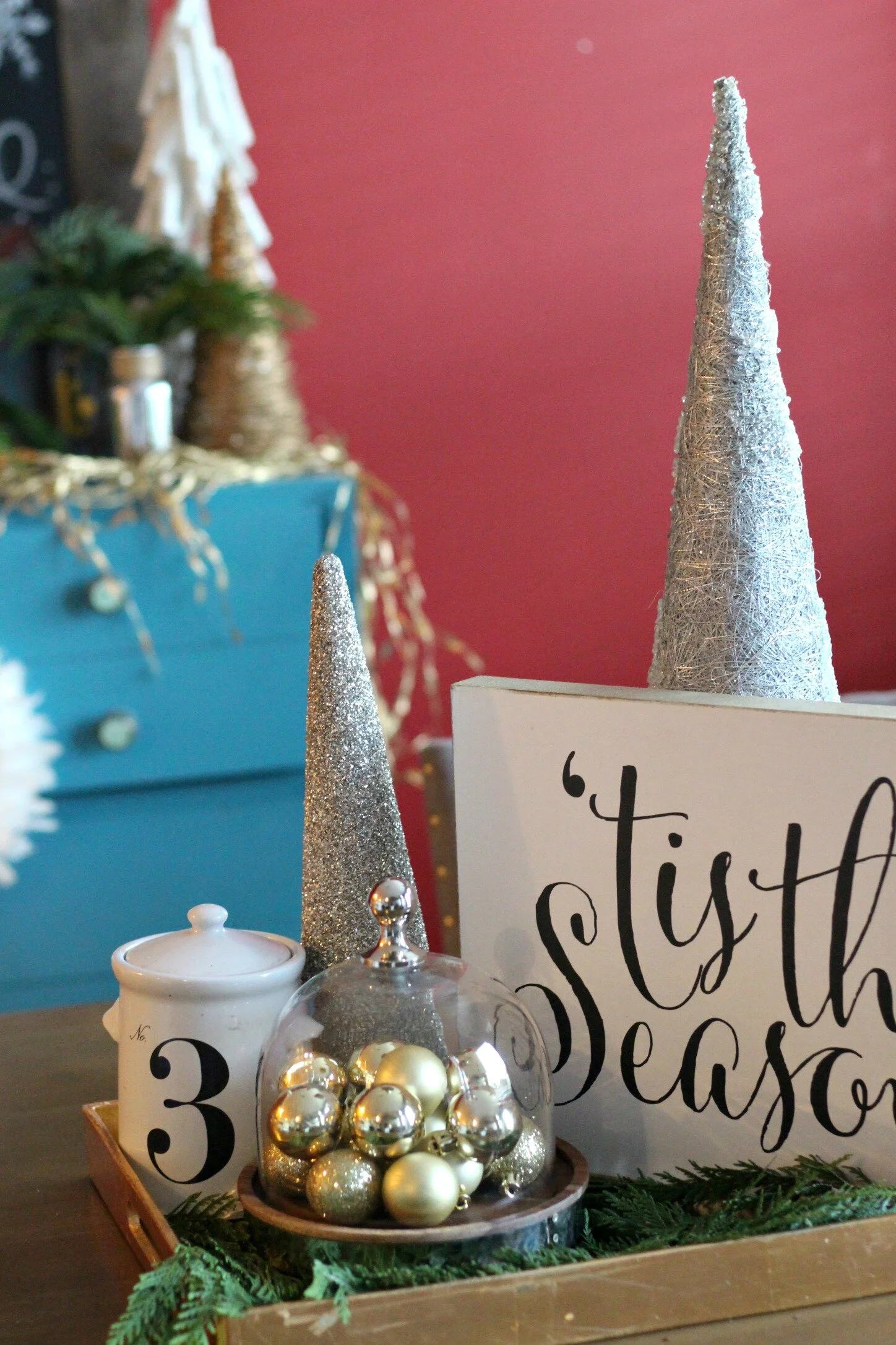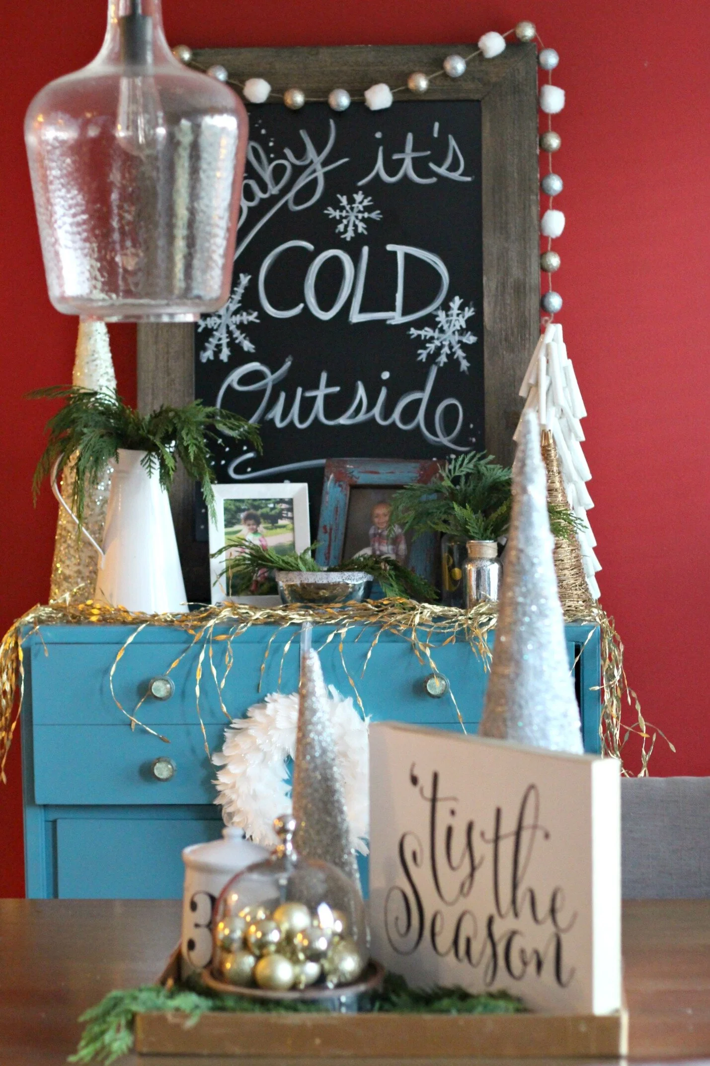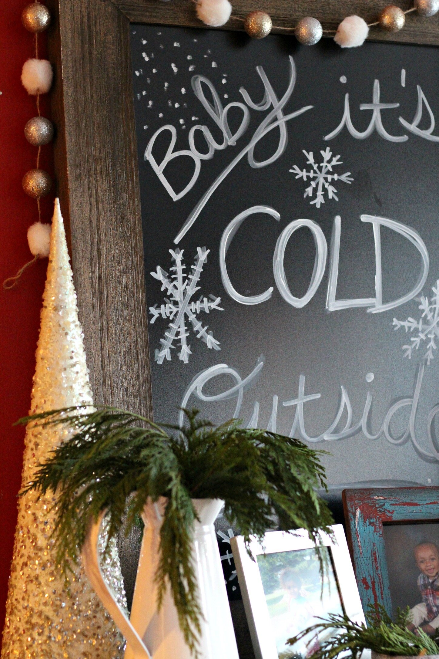 Last week was full of holiday decorating appointments and I'm excited to share some peeks of a few of them this week! This client wanted their front porch and dining nook decorated for the holidays. She also wanted some new artwork or wall hanging for above the turquoise piece that was a little more holiday themed. We decided to go for a large chalkboard, since she would be able to use it even after the holidays by just changing out the artwork! I found the chalkboard at Hobby Lobby for 50% off (sales rotate at Hobby Lobby so these are usually on sale every other week).