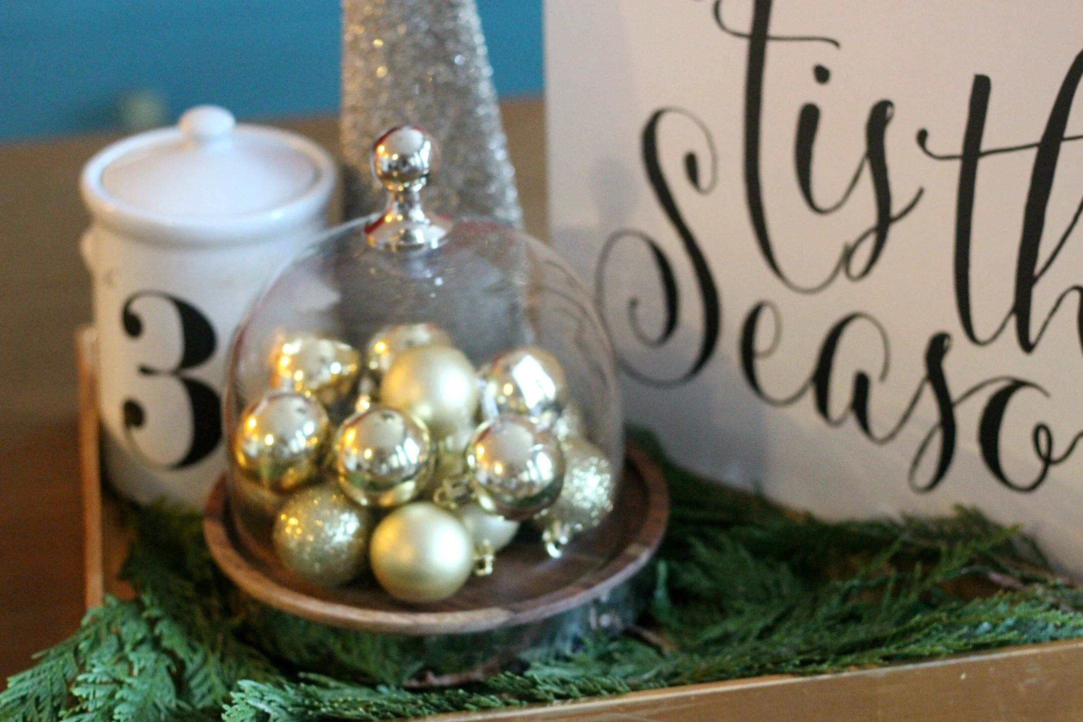 I was able to duplicate artwork for the chalkboard from an inspiration picture that my client sent me (see below). Most of the other accessories used were items that she already owned and leftovers from the rest of her Christmas decorating. Thankfully all the items went together perfectly and I was able to pull together some cute vignettes with them. The only things that I purchased to add was the fresh greenery, and glass cloche (which I added ornaments inside of). She had lots of cute little jars and bottles which I made a little more festive just by adding a couple sprigs of greenery inside. Since there's already some pops of color in this space, I loved having the mostly white + neutral Christmas decor in this area!