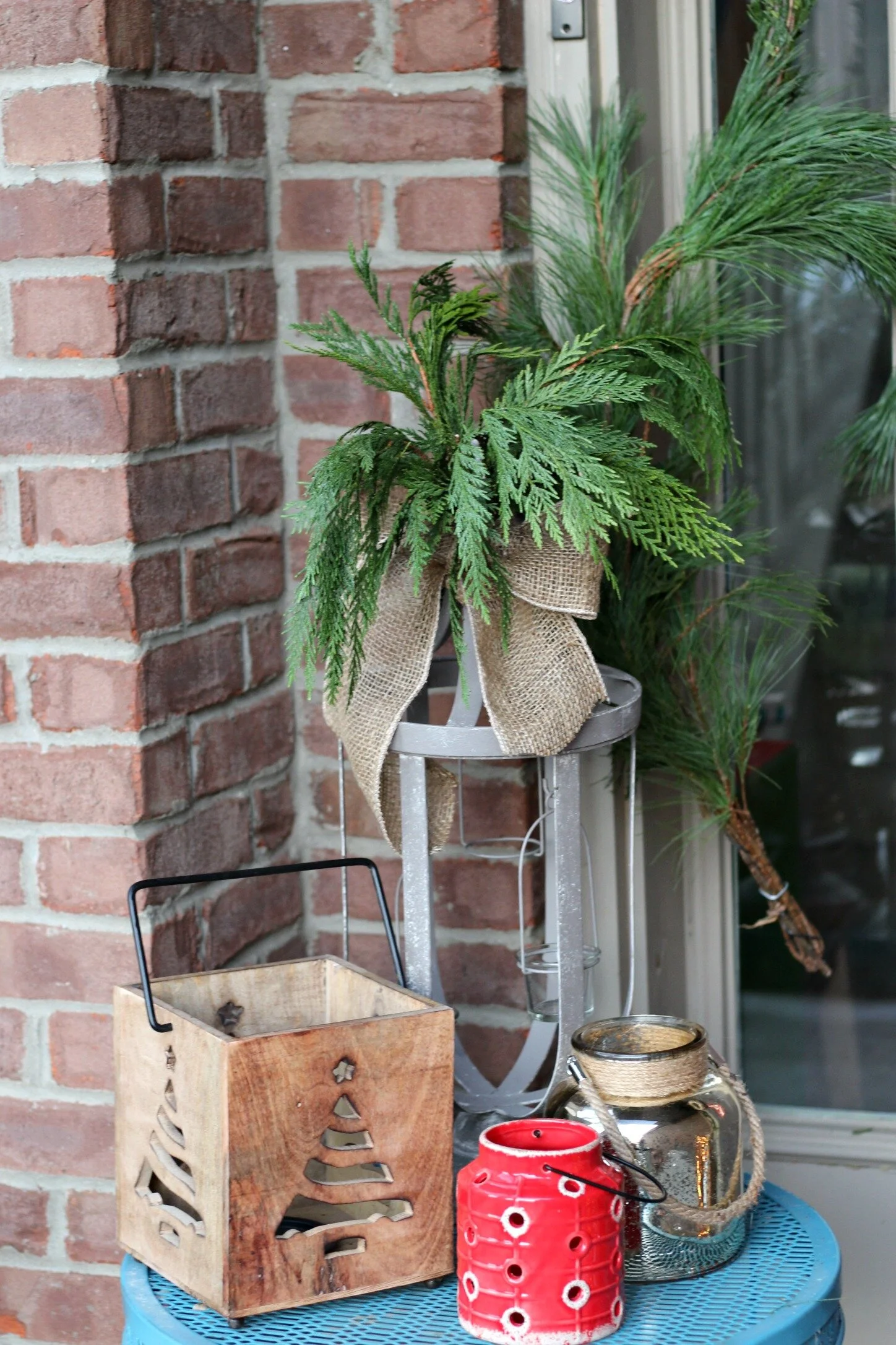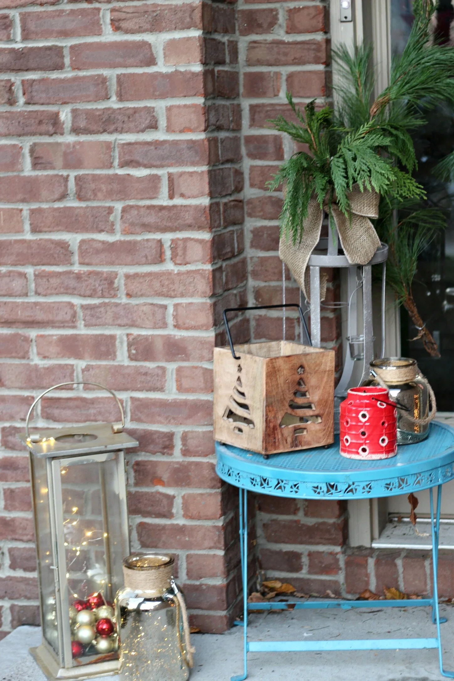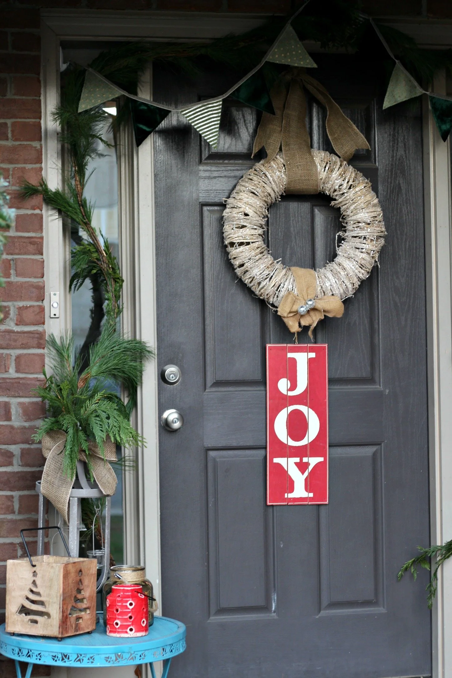 She also had some cute items to work with for the porch, including some wreaths, lanterns, and the "JOY" sign. I thought the sign would be a cute pop of color on the door so I attached it to the wreath to hang from the bottom. I also used another extra wreath she had and layered it on top of a fresh wreath to make it more substantial. I added extra wide burlap ribbon to both of the wreaths to tie everything together. We knew we wanted to use lots of lanterns and cluster them together. I filled the largest lanterns with some shatter-proof ornaments and then used battery operated twinkle lights inside them too. Above the door I hung a simple swag of fresh greenery and added a cute little banner garland on top from Target. The finished look is super simple and cheerful and definitely matches the decor inside of the house too! If you would like more information about our decorating services, it's not too late to add some festive touches to your home! Fill out the form below to set up your own consultation!