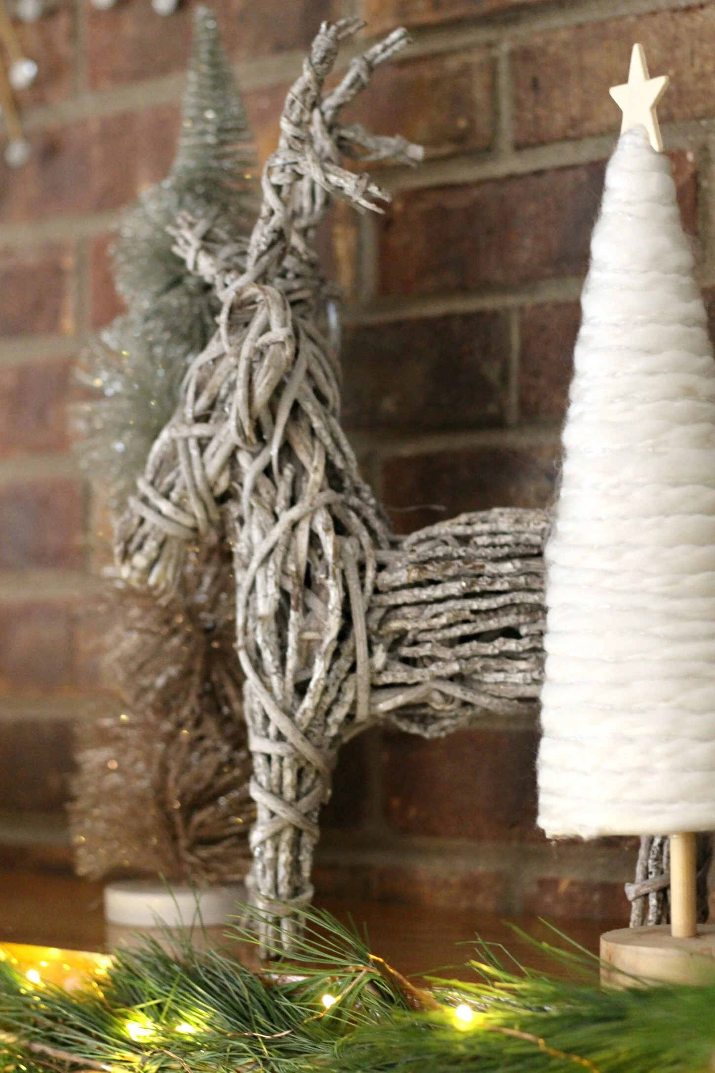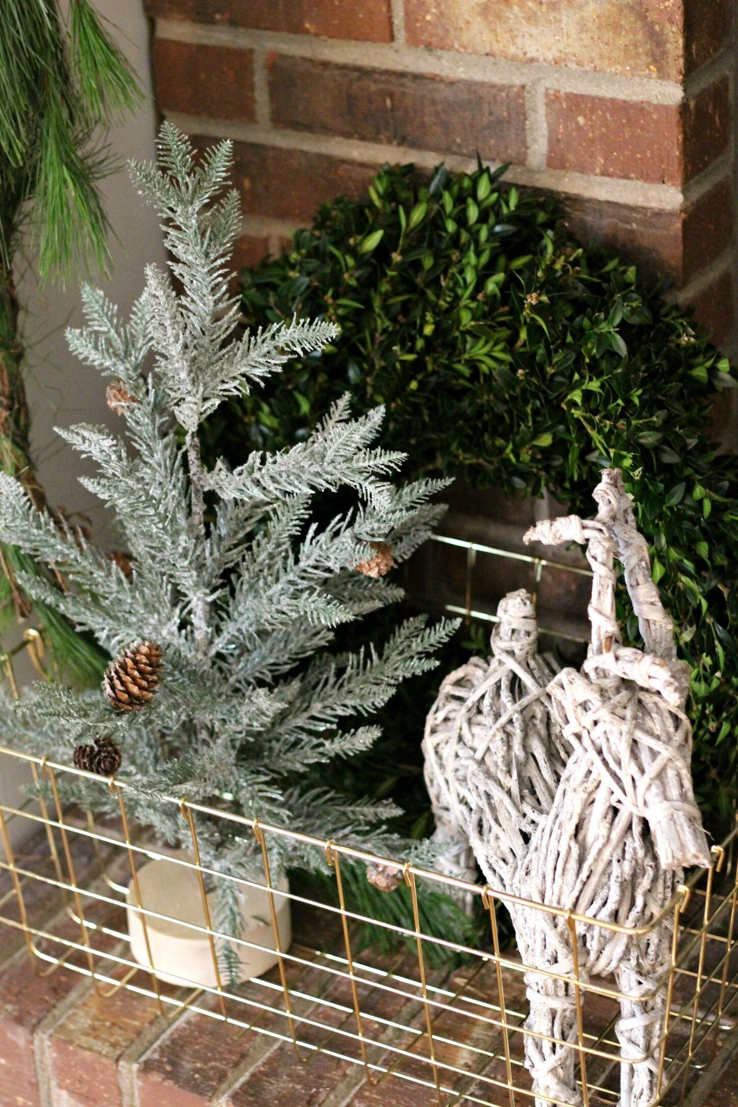 I filled the rest of the mantle with a mixture of different mini trees, a distressed wood wreath, and white-washed deer. I usually play around with these arrangements to try to find the perfect balance on each side. On the ledge below the mantle I placed a gold metal basket filled with a boxwood wreath (also from Trader Joe's), another deer, and small tree off to one side. I love to use baskets on fireplace ledges to help them look less bare. You can fill them a mixture of firewood, blankets, pinecones, or greenery. I also added a few little touches to the shelves beside the fireplace to keep the eye moving across the space (all those items are from Michael's).