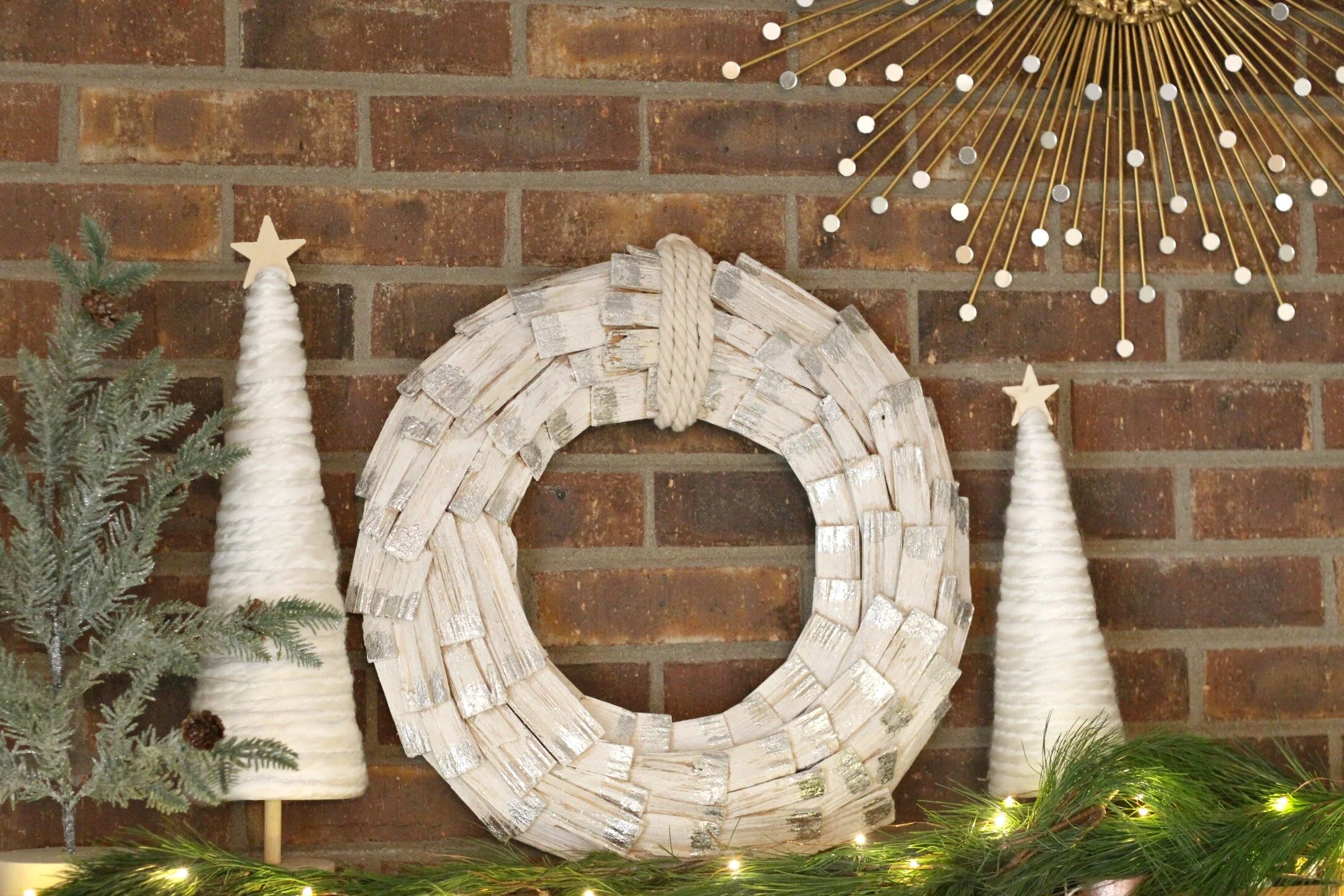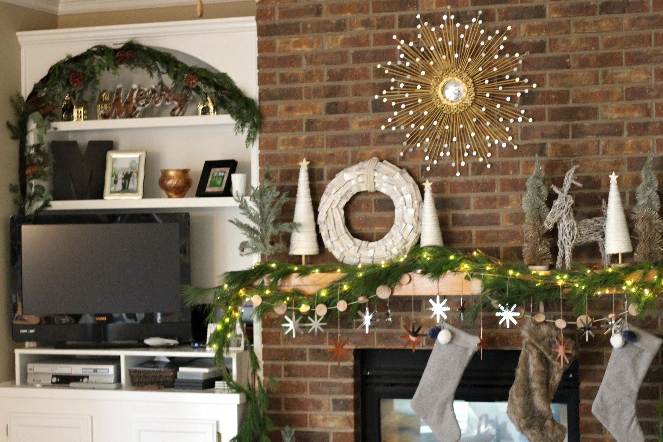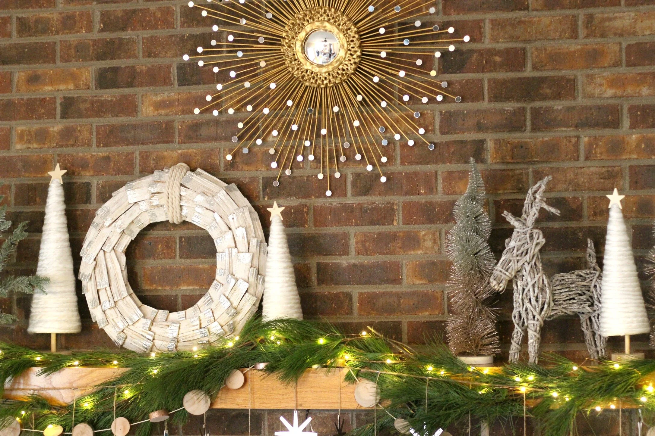 I was able to find most of the decorations at my favorite place, Target, which always has the best selection of unique, modern Christmas decor. I love the mix of more rustic materials (woodgrain, fresh greenery, and white-wash) with super glitzy and glam elements (like her starburst mirror, glittered trees, and mirrored snowflake garland). My favorite feature is the super modern layered garland: I topped a fresh pine garland (from Trader Joe's) with two different unique garlands from Target. I chose some simple wool and faux fur stockings too which I tucked into the garland off to one side.