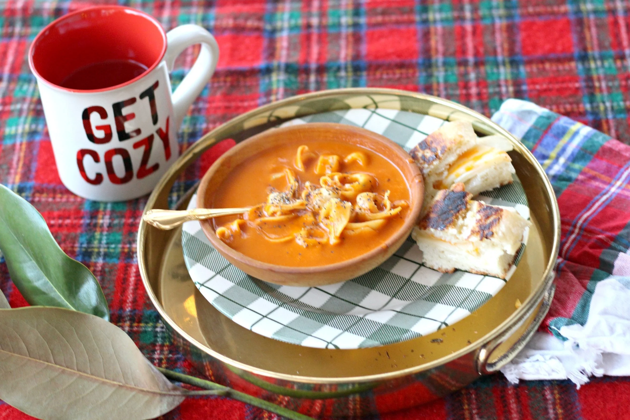 With the rush of the holidays, I don't think I've seriously been to the grocery for more than a few things at a time for over a month!  I hate not being on my usual schedule of shopping for the week on Sunday or Monday but I do think that sometimes you save money, and waste less food when you shop for just one meal at a time.  Trader Joe's is always my go-to for quick, easy meals whether it's their frozen pizzas, soups, or salads.  One of my favorite items that they have has always been the tomato and roasted red pepper soup!  It has the same classic taste of tomato soup but with a little deeper flavor and subtle spice of red peppper- so good! To make an easy meal of it, I grab some tortellini to add to it (I used cheese for this recipe but you could use any flavor!).  It's such a perfect cozy comfort meal for winter and takes less than 10 minutes to make- you can't beat that!  I love to serve it with a side of grilled cheese or you could add some cooked ground beef, pork, or sausage to it, to make it more hearty like a chili.  Get all the instructions and ingredients below!