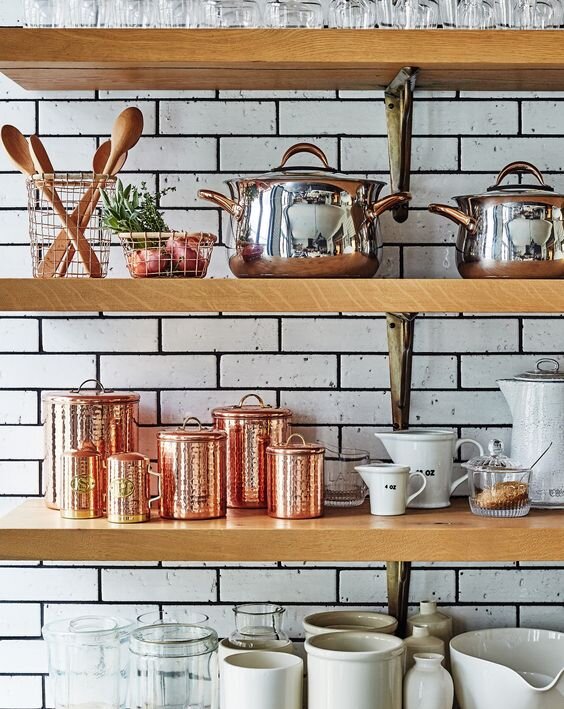 I loved this picture because the layout of the back wall is very similar to how we are going to set up our kitchen. I also love the light fixtures, especially the ones mounted over the open shelving (I'm hoping to also do this on our big open shelf wall).