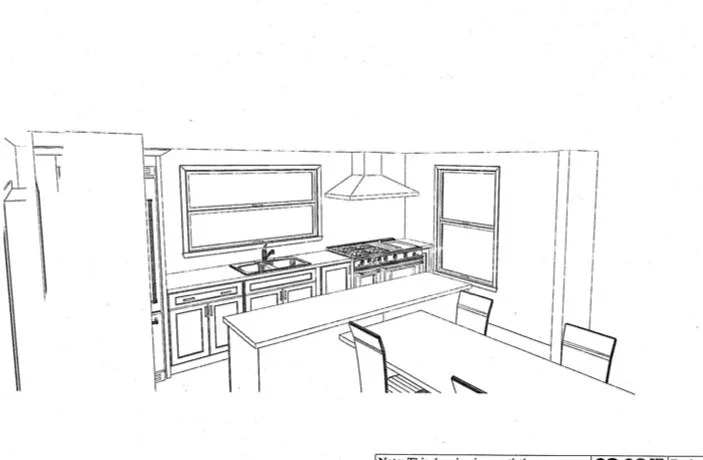 This back wall will hold most of our appliances and cabinets. The kitchen sink will stay where it is but be replaced with a stainless farmhouse sink and new industrial-look faucet. We will have a very tall stainless fridge on the left side, dishwasher beside it, and a large stainless range and hood on the far right side. Whatever backsplash is visible will be covered in white subway tile with dark grout. We will have lower cabinets only and they will be dark gray and the countertops will be a light stone (we are still deciding on the exact material). We are going to get as big of an island as we can possibly fit and hopefully be customizing it out of an antique furniture piece with reclaimed wood top. There will be two pendant lights over the island and some can lights in the ceiling above. The floors are going to be a dark slate tile that will continue into the hallway beside the kitchen and into the mudroom. Here's a mock-up of what the back wall will look like: