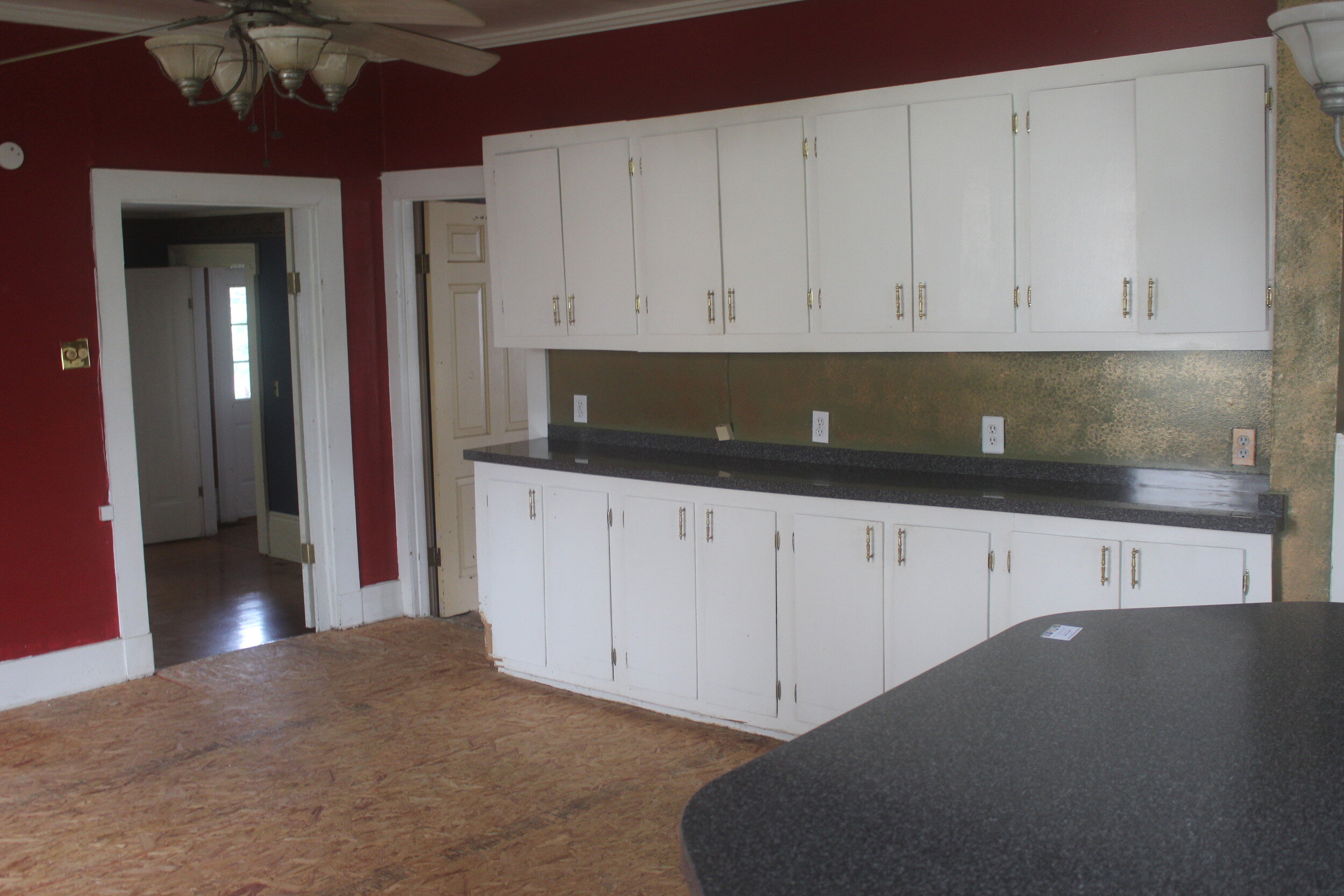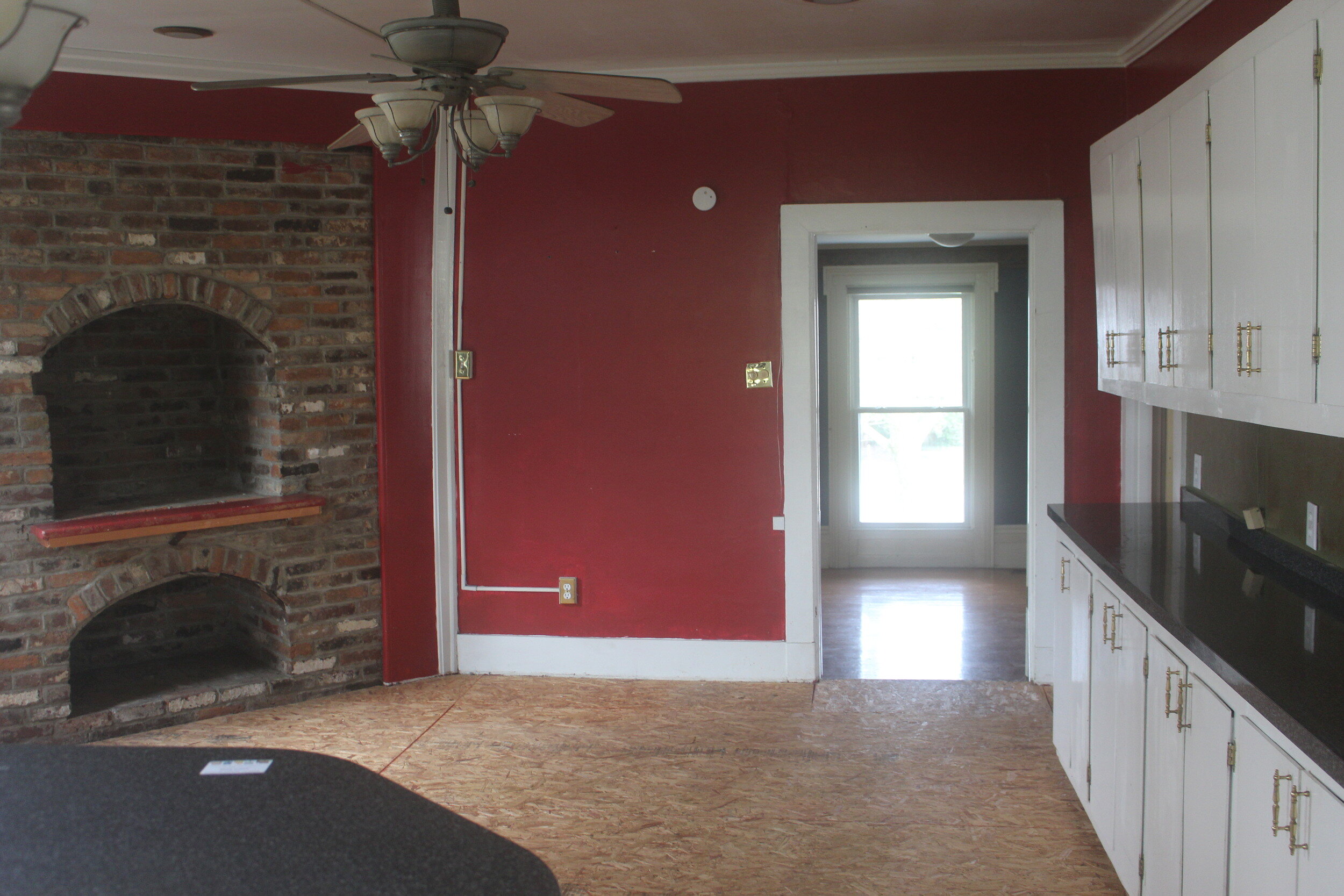 Above you can see a picture of the other side of the room. The cabinets on the right are all being removed. This entire wall will also be covered in white subway tile with dark grout and there will be industrial floating shelving covering the entire upper part of the wall. On the lower half, we are putting my vintage 1940's white fridge on the far left side and a long, counter-top height rustic workbench I have on the right side. I'm picturing the open shelving being built around these pieces so it all looks like one unit. The ceiling fan and exposed wires will all be removed and we will put a big table in front of the fireplace. We are going to remove all of the awkward molding surrounding the fireplace in hopes that there is more brick behind it.