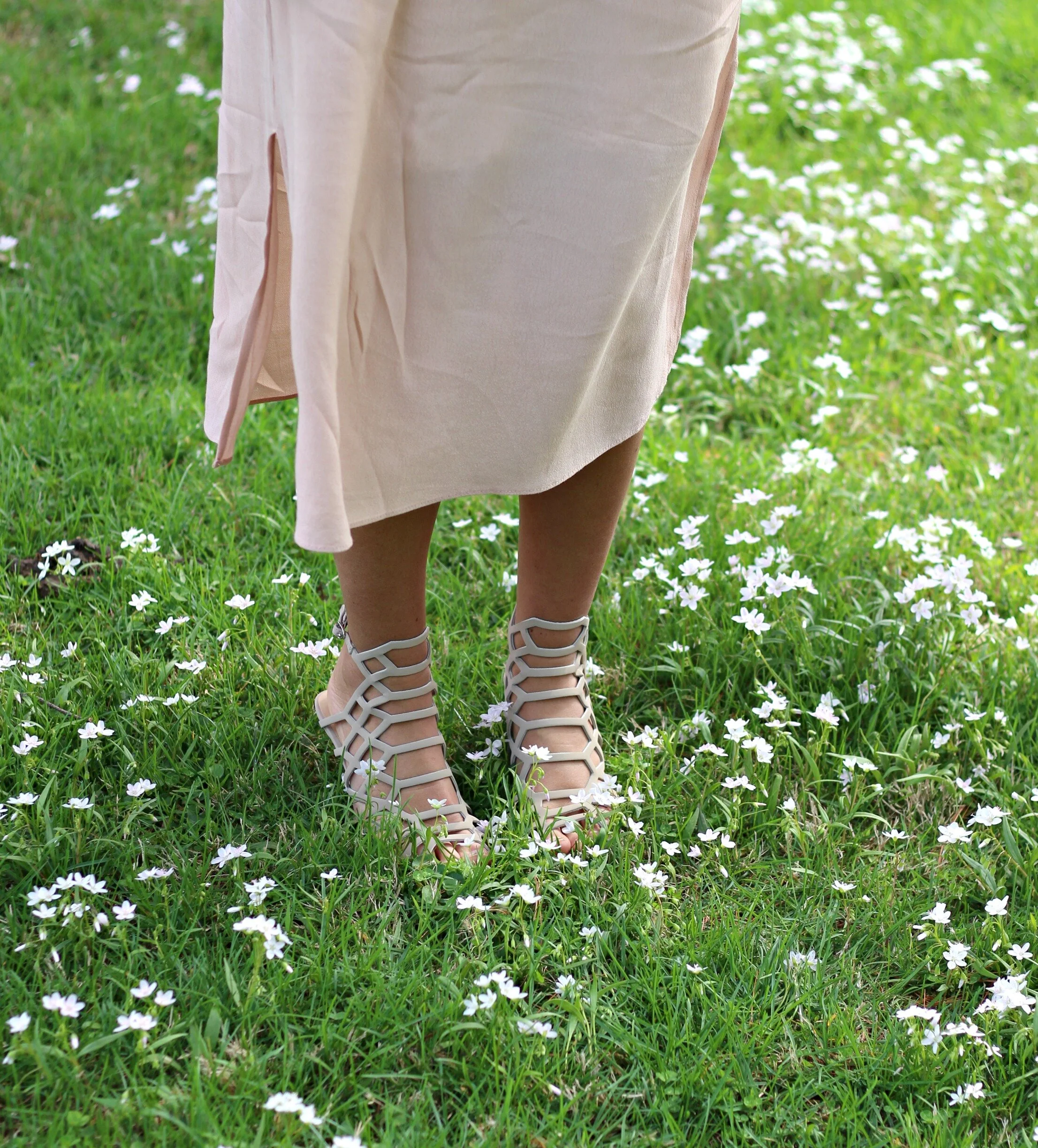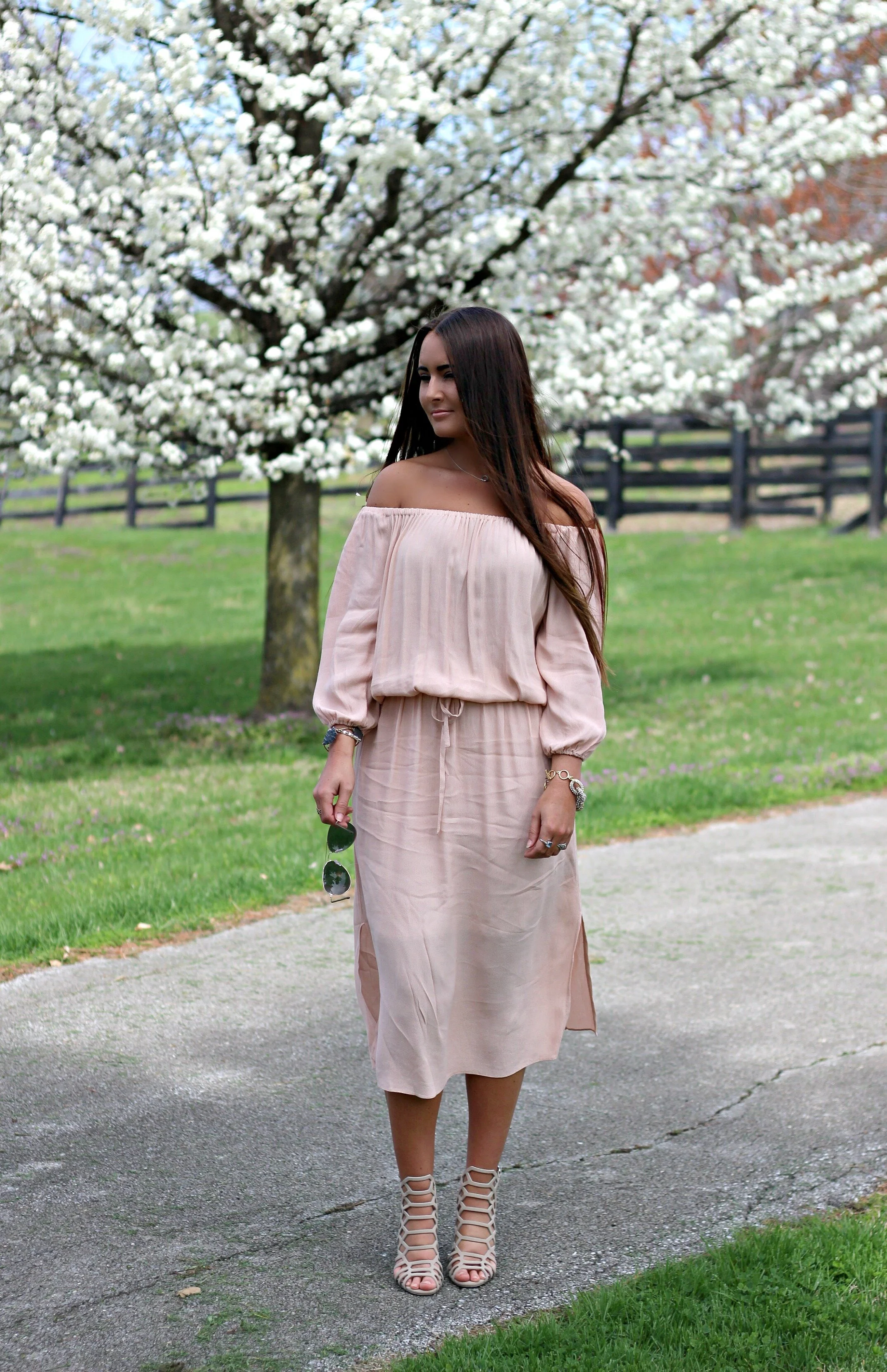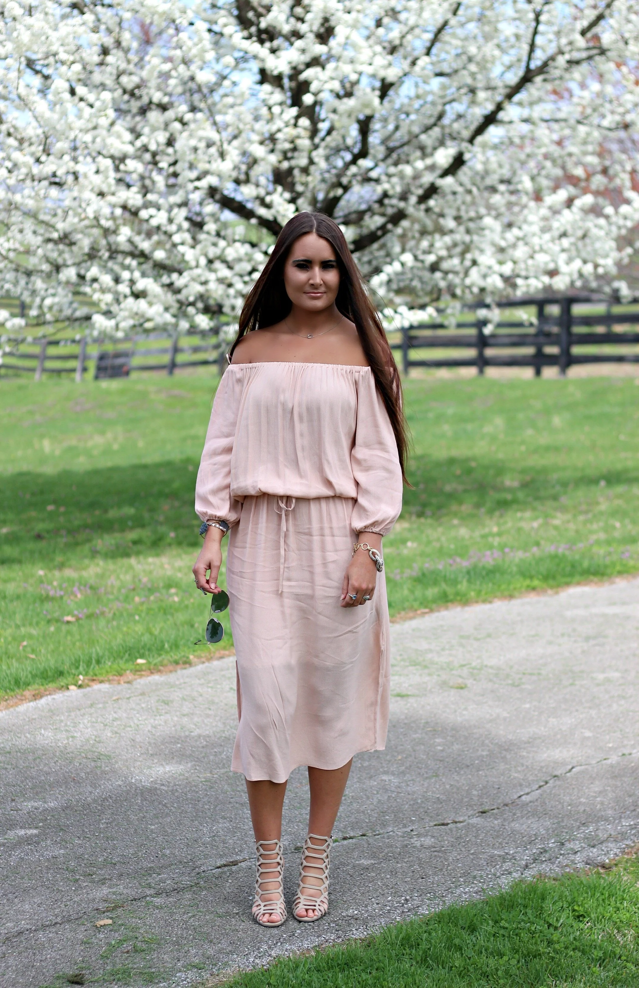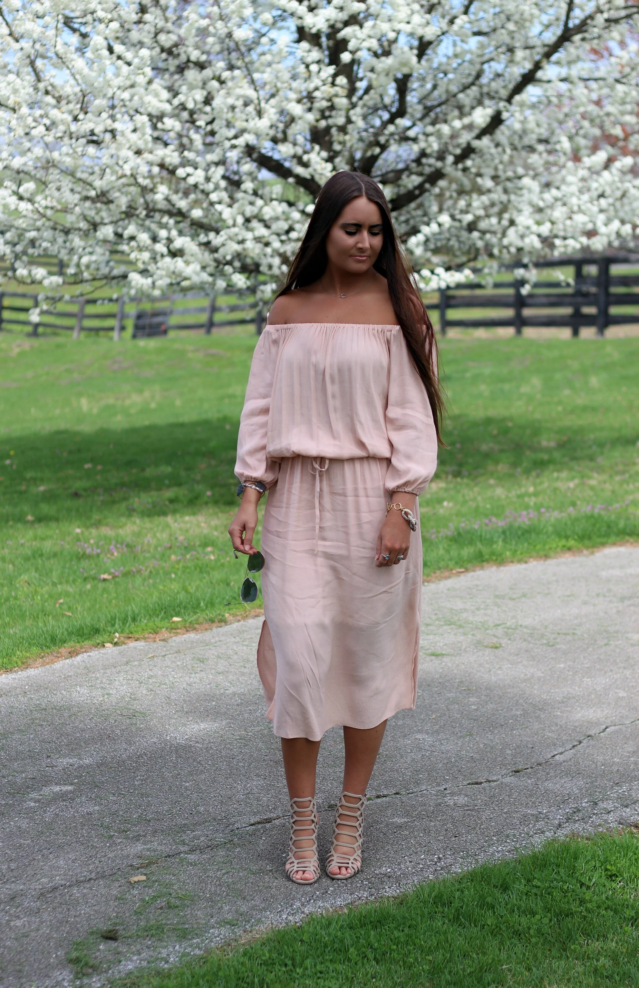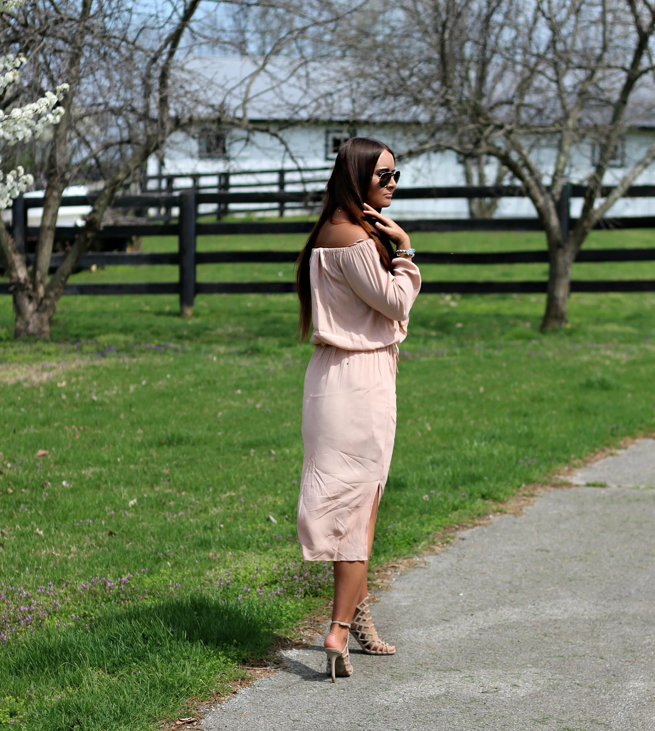 Happy Easter! I hope everyone enjoyed the beautiful weekend and warm spring weather! I love seeing everyone dressed in their Sunday best and Easter egg pastels for the holiday. Growing up we always got special outfits for Easter Sunday, usually with coordinating hats, lacy socks, and white shoes. Even though I may have ditched the hat and lacy socks (for now), I still love picking out a special outfit for Easter every year. I have been avoiding Target for the last two months trying to save money, but made the mistake of venturing in for paper towels. Of course you have to parooze the clothes on the way to the paper towels, and I got sucked in to trying on a cart full of stuff! Target's newest collaboration with Who What Wear is amazing and has so many classic basics and minimal pieces for spring. This pale pink off-the-shoulder dress was just one of the many pieces I fell in love with, and has such a versatile silhouette and style. I can see myself wearing this with flats to the farmer's market, over a bathing suit to the pool, or even dressing it up like in today's look. My favorite part of the outfit though are these super modern cut-out design heels that are also from Target. They are a perfect nude shade so they go with everything and add a little edge to any outfit. Needless to say, Target got me again and I did not make it out with just my paper towels- but has any woman ever made it out of Target with JUST paper towels (ESPECIALLY when there's a shoe sale)?!?