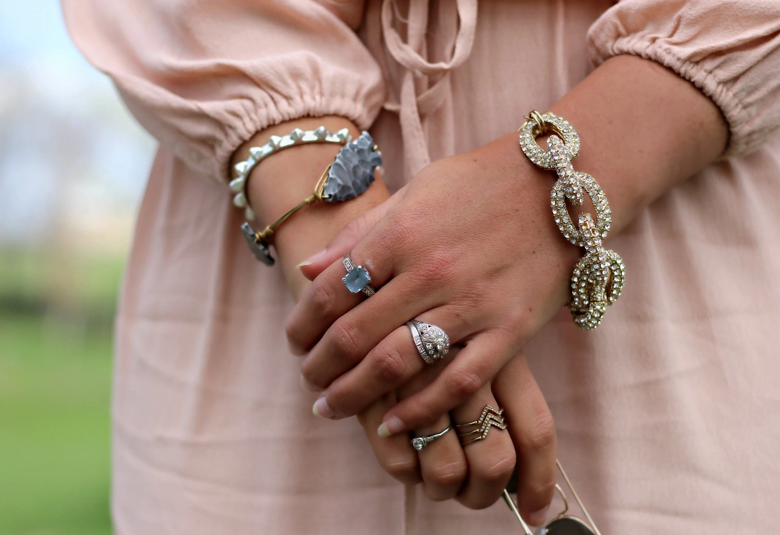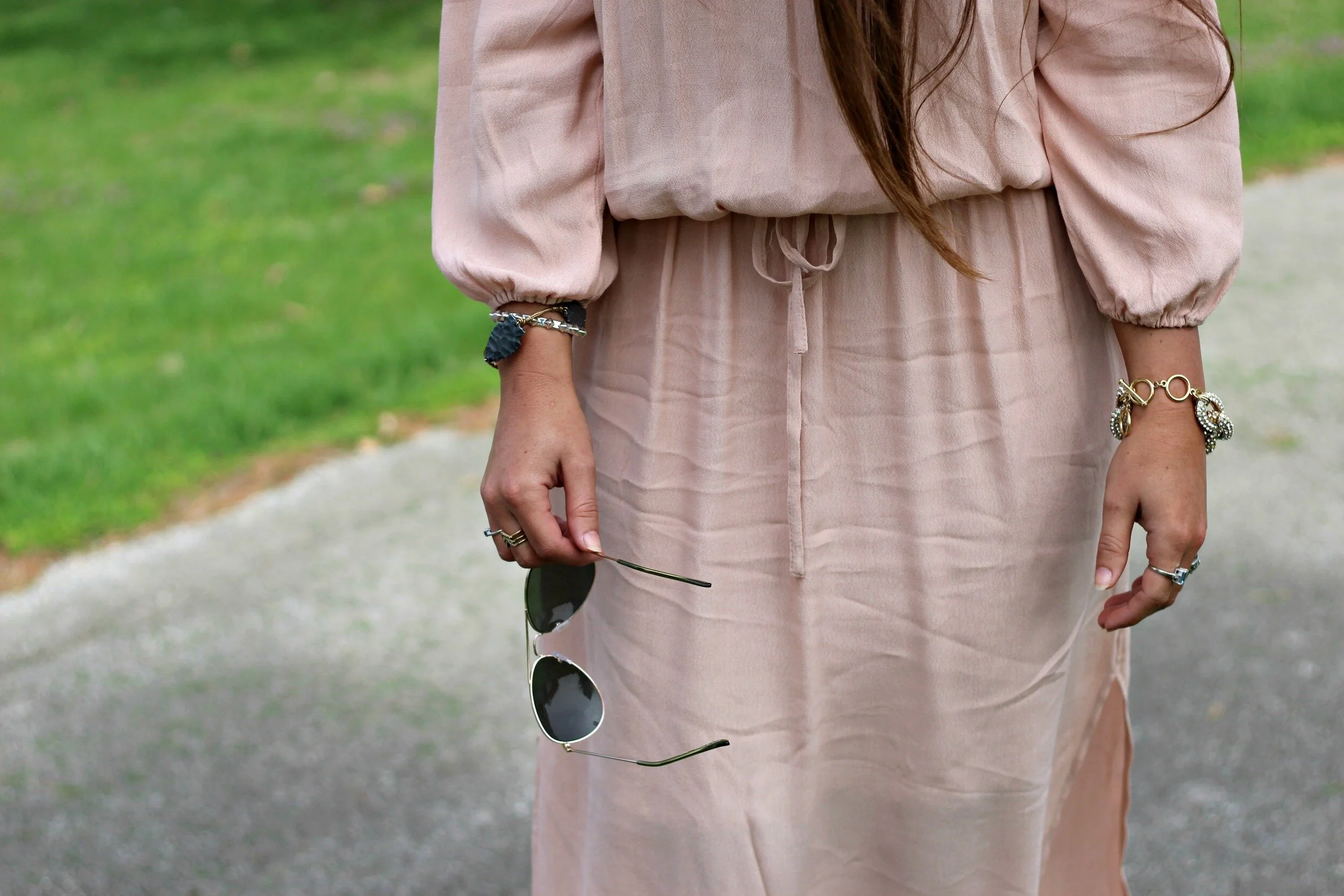 Blush off-the-shoulder dress: Who What Wear for Target | Cut-out heels: Target | Pave Link Bracelet: Target | Arrowhead bracelet: Bourbon + Boweties | Necklace: Zales (old- similar here)