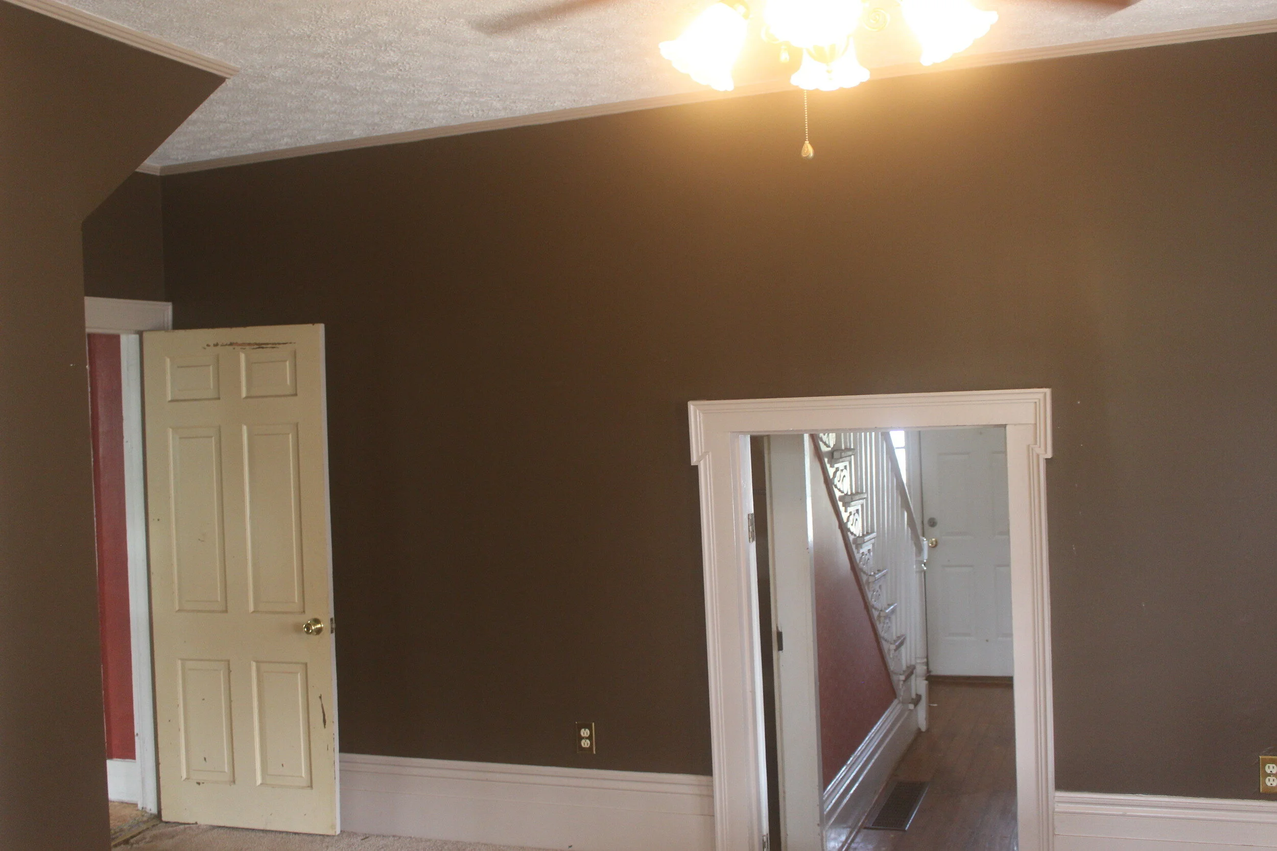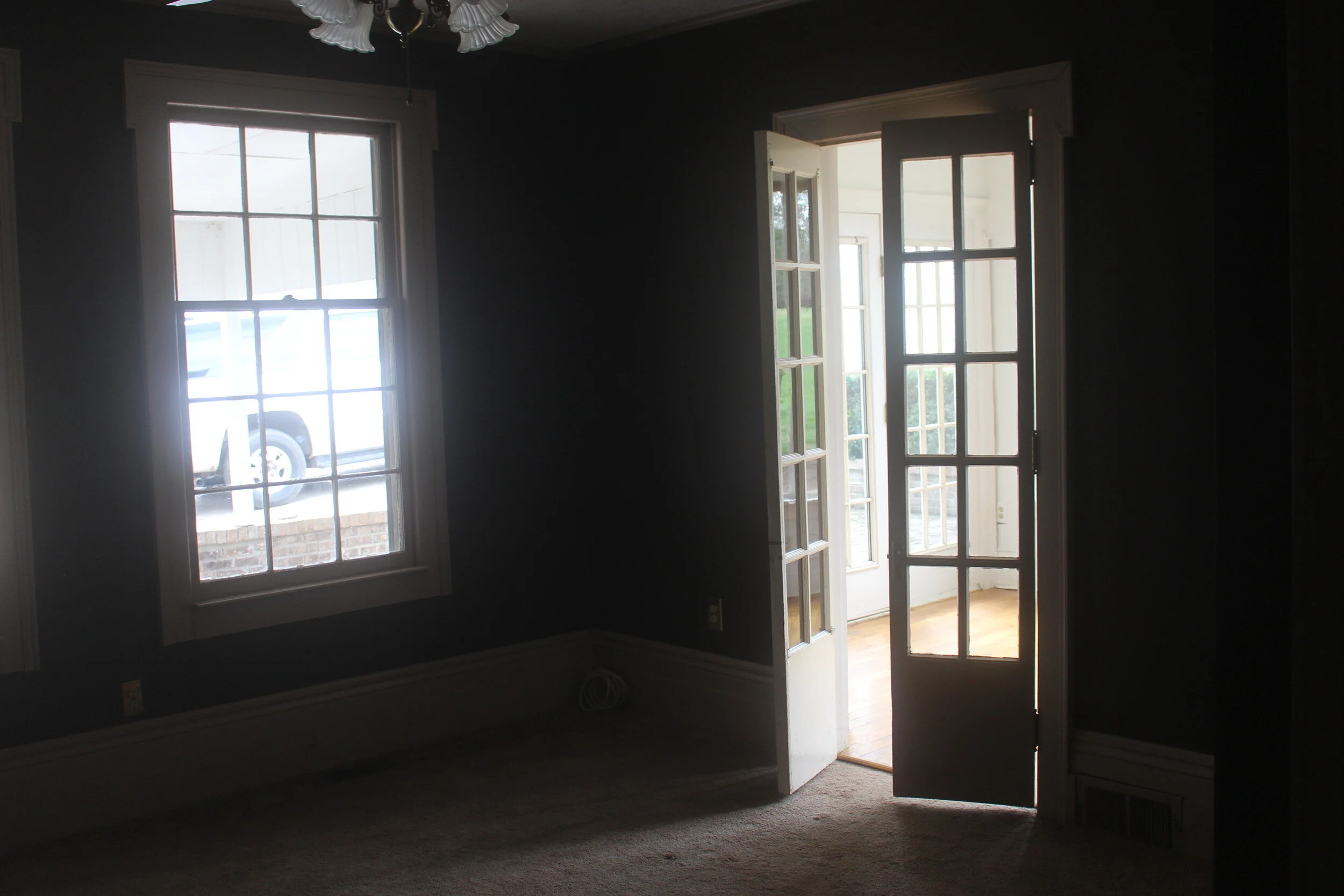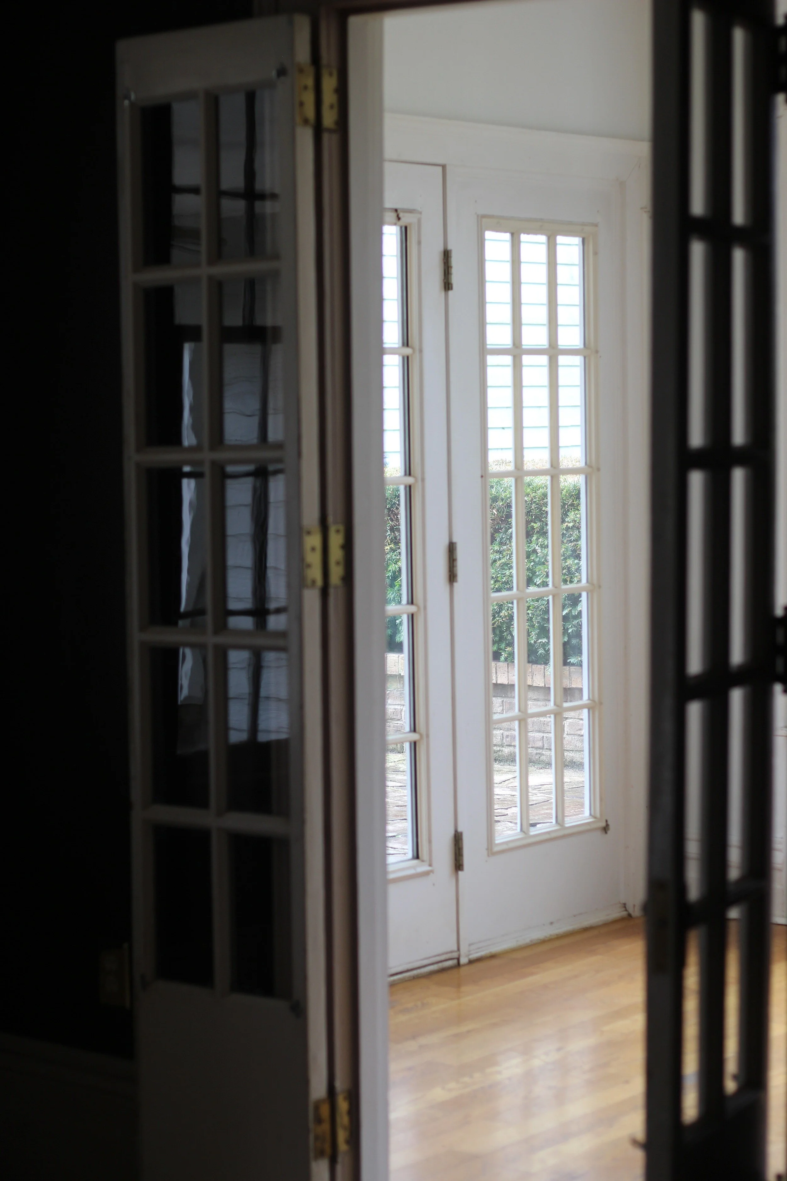 As you can see in this photo, there is an awkward third door that leads into the front entryway of the house. This strange low doorway seems to be a result of maybe adding on to the house, or perhaps it was just always that way as older homes tend to have quirks like this. Either way, we have decided we don't need the doorway and it just looks distracting, so we are going to close it off and just make it a regular wall.