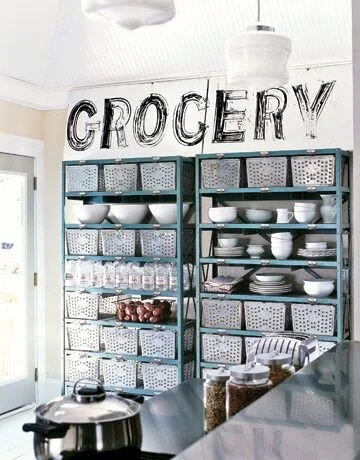 I would love to find some unique storage pieces like those metal bin shelves for our pantry. This pantry has such a dramatic contrast between the dark walls and light floors that I love.