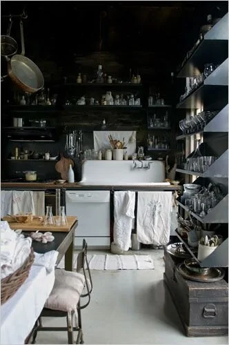 Here's the doorway from the kitchen into the pantry. I may be more excited about this room than any other room of the house! It will be like a mini market with tons of shelves that I can style and extra prep space for us when we are entertaining. It will also give me room to finally have my extensive collection of vintage dishes, serving pieces, tablecloths, glassware, etc. all in one place where I can see them. The overall style of this space is similar to our French industrial farmhouse kitchen- here's some of my inspiration photos for the design: