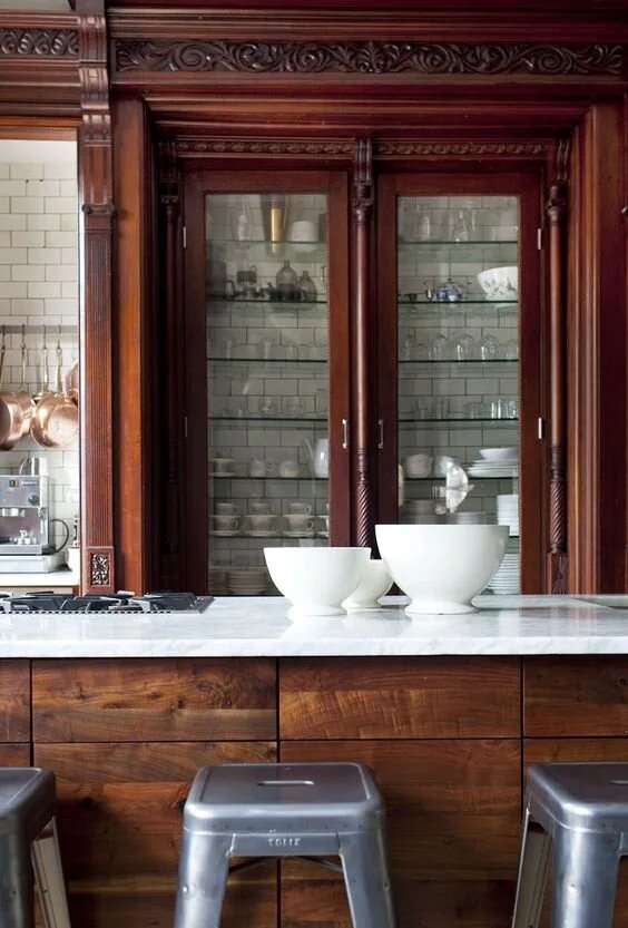 I love this beautiful built-in with glass doors. We will not be able to do anything this fancy right away, but I'd love to eventually have something like this across one of the walls. The prep table in the middle of the space is also what we are picturing for the layout of the room.