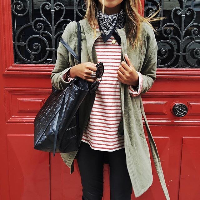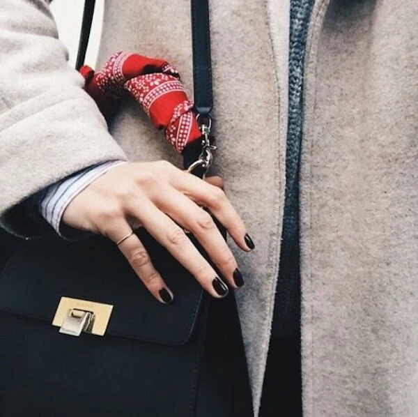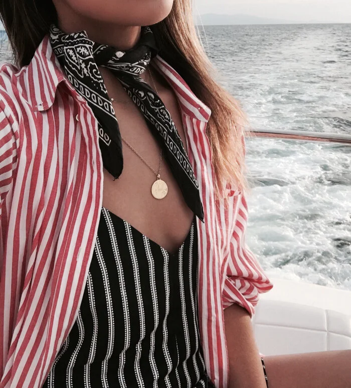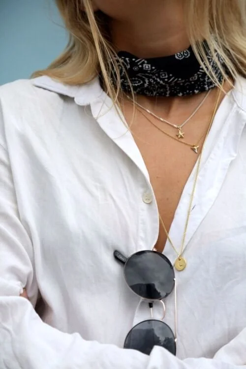 Scarves were one of the first vintage items I started collecting. At the time vintage clothes were not yet popular, so scarves were something that were affordable and easy for me to find (and my junior high self loved wearing them as headbands). I've always kept my stash of vintage scarves because they go in and out of style over the years, and there's always a "new" way to wear them. This spring one of the latest trends is the "neckerchief," and cute little scarves and bandanas are popping up everywhere again. I love how this trend hearkens back to the 1950's-60s, when every lady had a scarf accessory around her neck or head. You can update the look by layering some longer, dainty necklaces with your neckerchief, or try something super unique like wrapping it as a cuff around your wrist or around your purse. The best part is that this is the one must-have accessory that everyone can afford! We just got in a brand new stock of classic bandanas in navy, red, white, and gray all just $5 each. I've added the shop link at the end of this post, but first check out my favorite ways to wear the bandana below!
