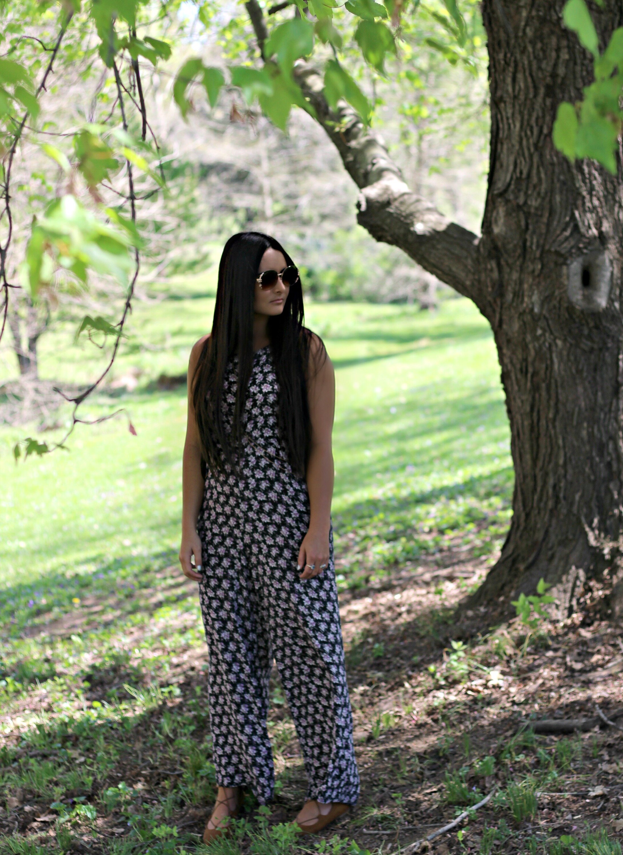 This week I have been stalking Instagram non-stop for photos from my favorite fashion event of the year, Coachella. Coachella is a giant annual music festival in California that has transformed into a total fashion event, attracting just about every celebrity, model, and fashion blogger from all over the world (think modern-day Woodstock). The best part of the outfits here is that there are truly no rules- everyone goes all out and takes risks with their outfits. I also love it because there are SO many vintage trends that are constantly popping back up, from all out hippie garb to 80's styles to 90's grunge. You can get away with wearing just about anything and pile on as many accessories, braids, and as much fringe as you want! I am constantly dreaming up my festival wardrobe, and even though I may never attend Coachella, I am still inspired by the trends there and can incorporate them into my daily wardrobe. This vintage floral halter jumpsuit I snagged from local vintage shop, Fox House Vintage, is the perfect festival statement piece (and also comfortable and cool enough to wear all day). I paired it with my favorite lace-up flats from Target, a simple gold body chain, and hippie-esque round sunglasses. To me this outfit is the perfect toned-down version of festival style that you could wear everyday! What are you favorite festival trends this year?
