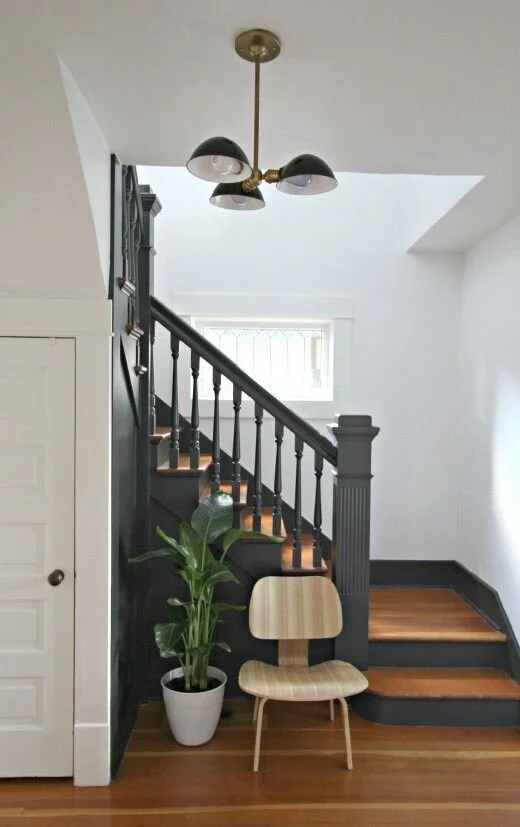 This is the photo that completely inspired me and kicked off my vision for this entryway area. I have decided to go bold and paint all the trim in our entryway/stairway dark charcoal gray (almost black). I love the way it looks and how it modernizes the traditional, "old house" style. The color I have chosen for the trim is Sherwin Williams "Iron Ore," and the walls will be Sherwin Williams "Pure White." I just can't wait to see how the paint transforms this area!