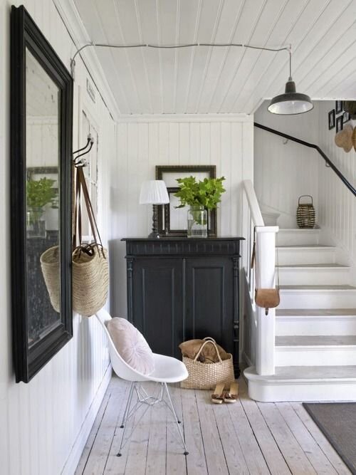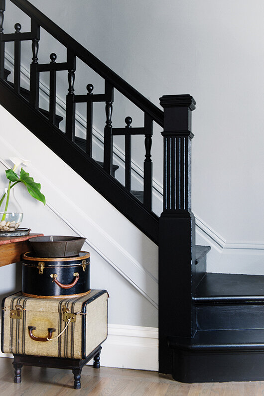 More black and white paint and I especially love the touch of vintage with the old suitcases near the bottom of the stairs.
