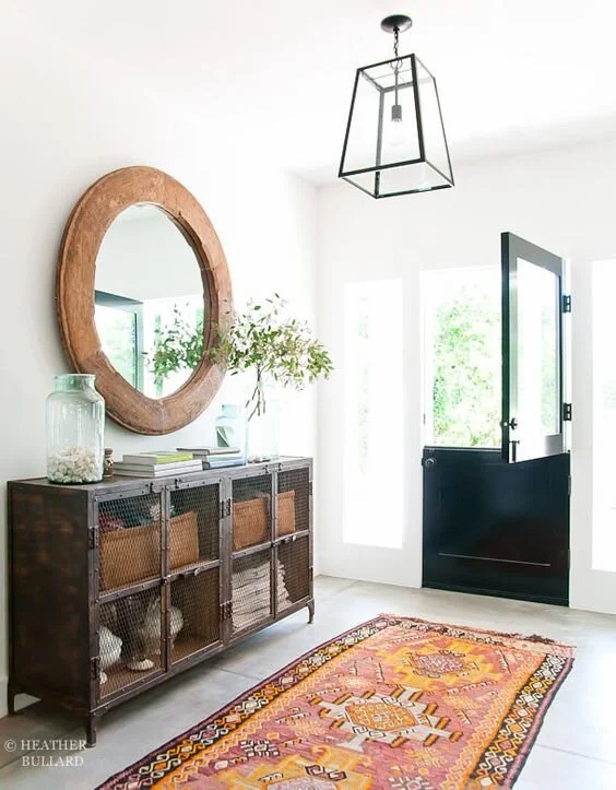 Another perfect modern and minimal light fixture and don't even get me started on that dutch door! I am DYING for a dutch door (they are SO expensive!). I think it would be perfect in the front entry overlooking Main Street. This will be a project that I will have to save up for for later. I also love the rustic look of this metal sideboard and the way they styled it for the entryway space.