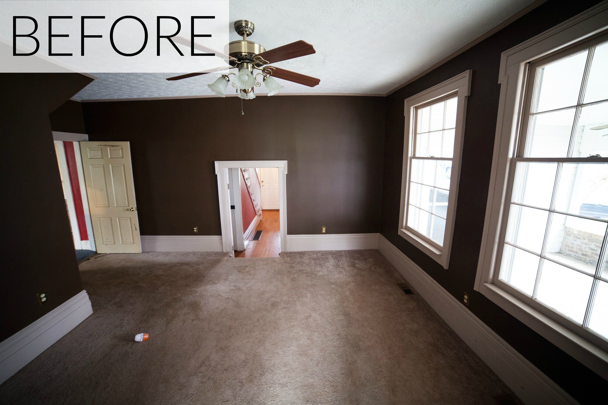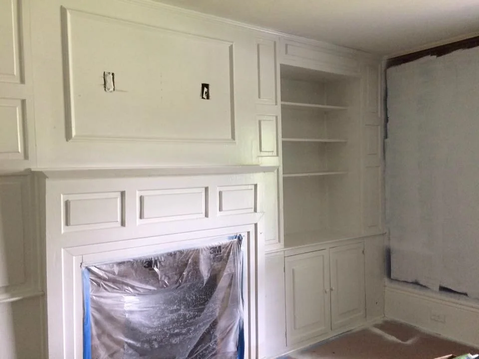 What a difference some white paint makes! You can't fully tell from the before picture, but these built-ins were just slightly off-white with old paint making them look a little dingy and dated. Our painters are painting all the trim and built-ins in this room with a spray gun (hence all the taped off and covered areas). It really makes the room so much lighter and these built-ins already look brand new! I'm hoping to also eventually paint just the back of these shelves a dark gray so that everything on the shelves will pop! This whole room (walls included) is going to be this same white (Sherwin Williams "Pure White"). I personally love all white spaces and I know this will be a perfect, neutral background that I will never get tired of. All our living room furniture is various tans, browns, and leather tones with lots of mixed textures so that will add plenty of warmth to the space.