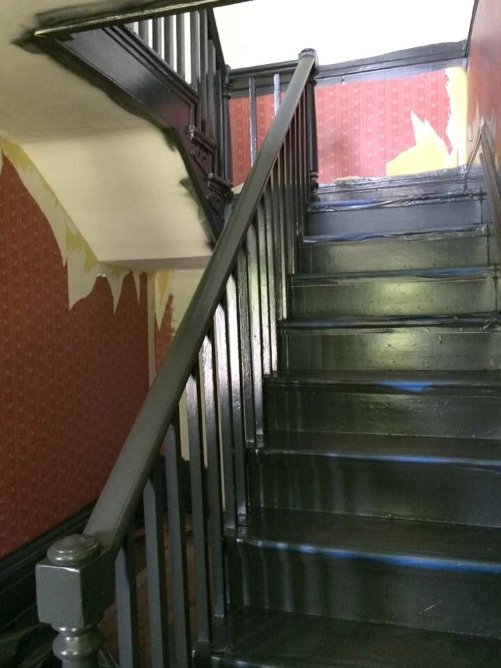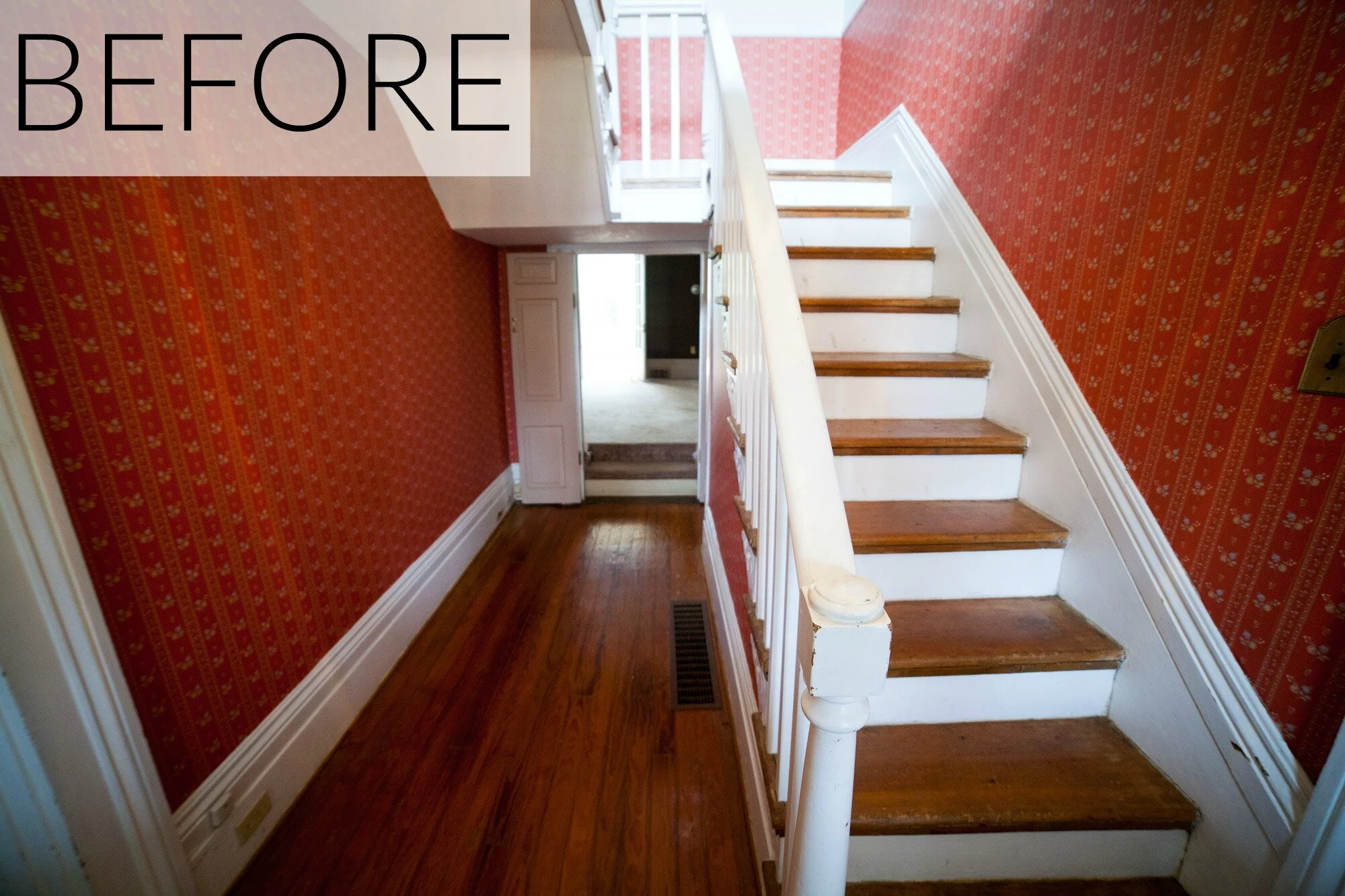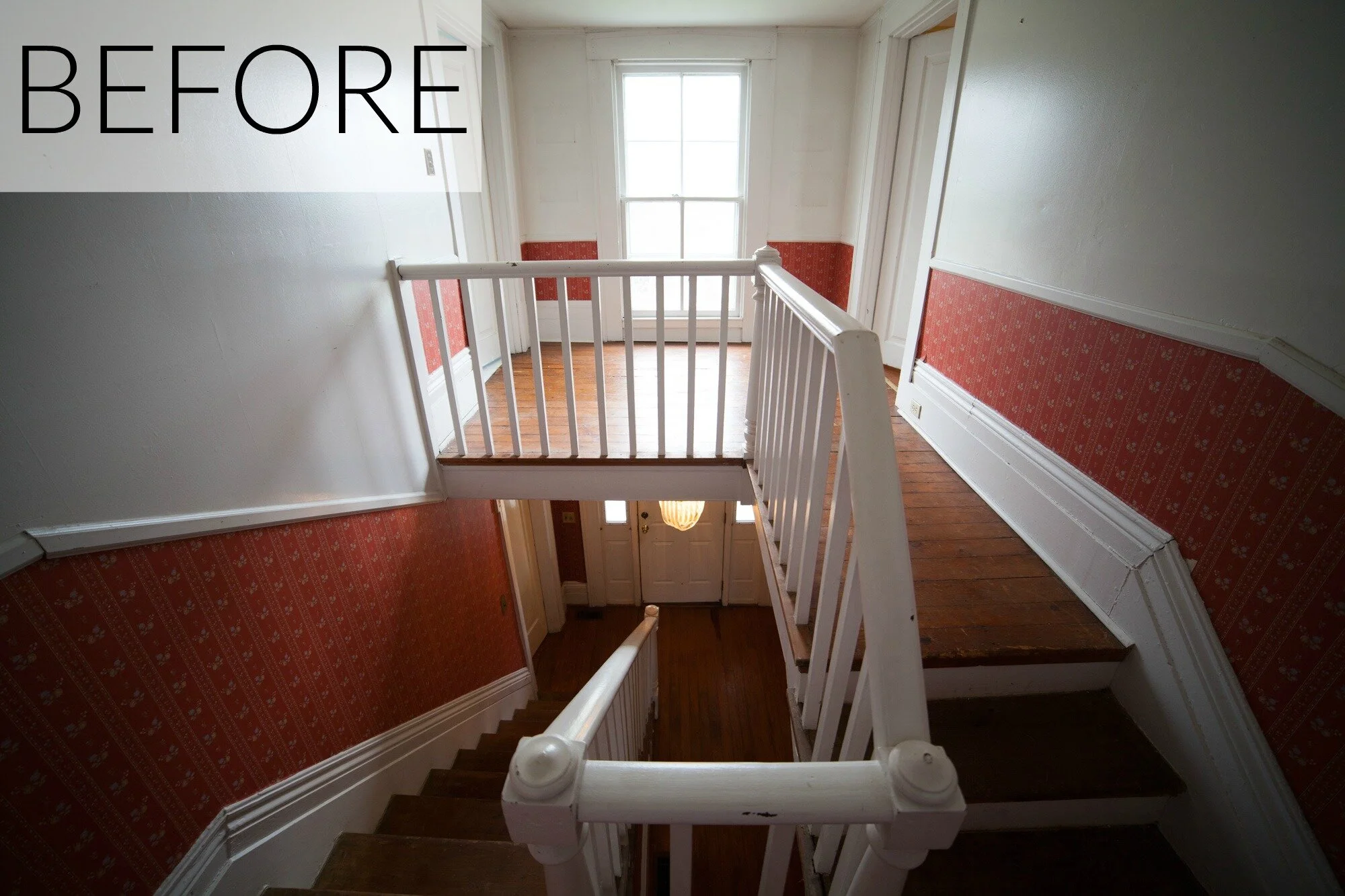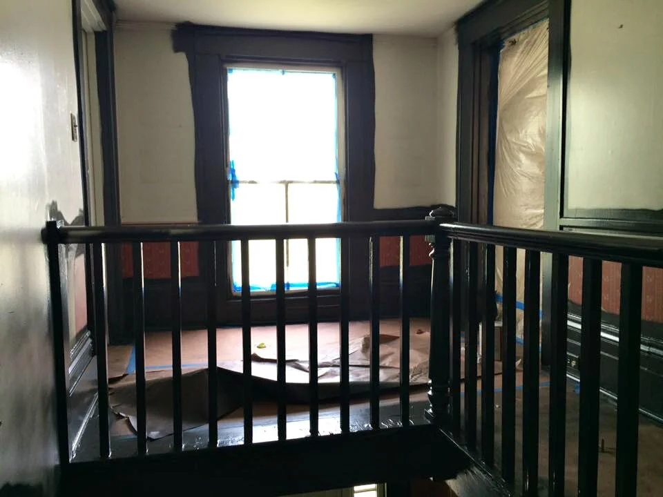 Yes, the dark trim is happening! They still have one more coat to go but I couldn't wait to show you all what it looks like! Remember all the wallpaper will be gone and the walls and ceiling will be all white. The top of all the stairs are also all taped off because we are keeping the original wood underneath. This paint color is Sherwin Williams "Iron Ore" and is the perfect dark charcoal gray- almost black. I love how bold it looks and the modern twist it puts on this space.