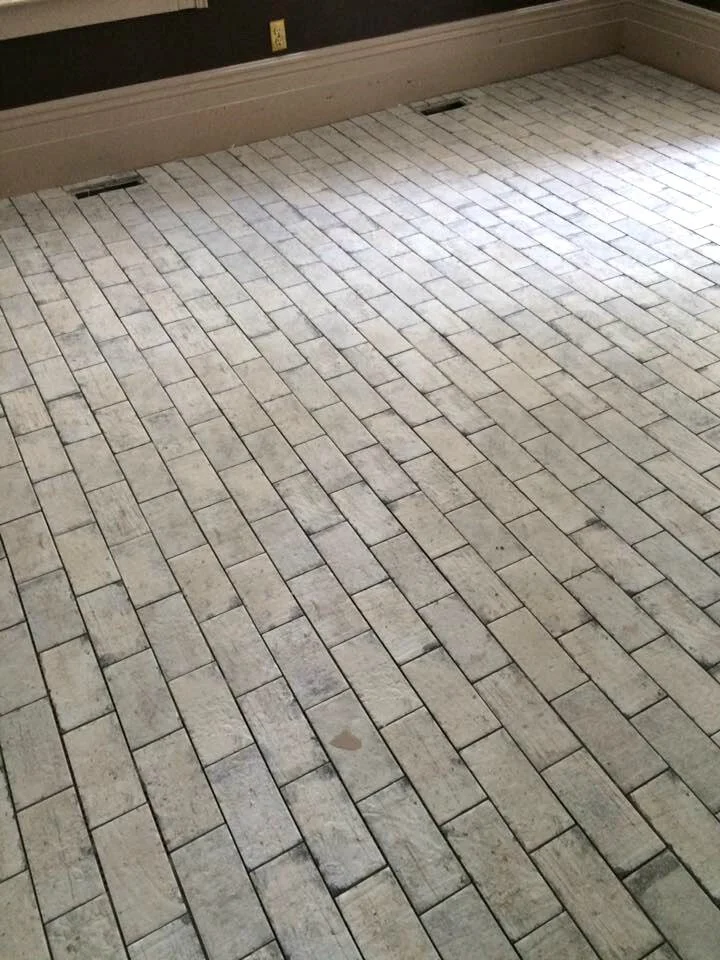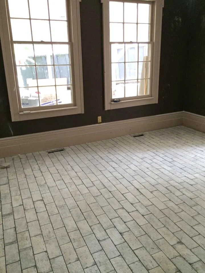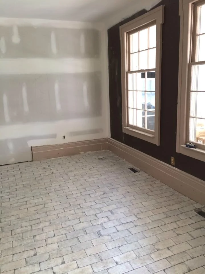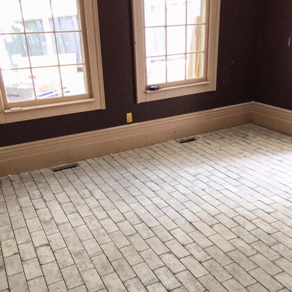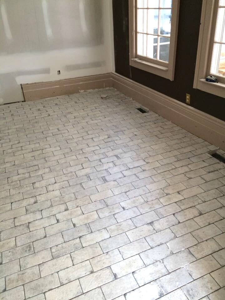 Probably the most exciting development of the week was the new floor in the butler's pantry. We wanted something unique and different for the flooring in this room and I LOVE this porcelain tile we picked out. It was hard to picture how it would look filling an entire room but it looks even better than I could have imagined! Next up in here is paint which will really make the entire space look complete.