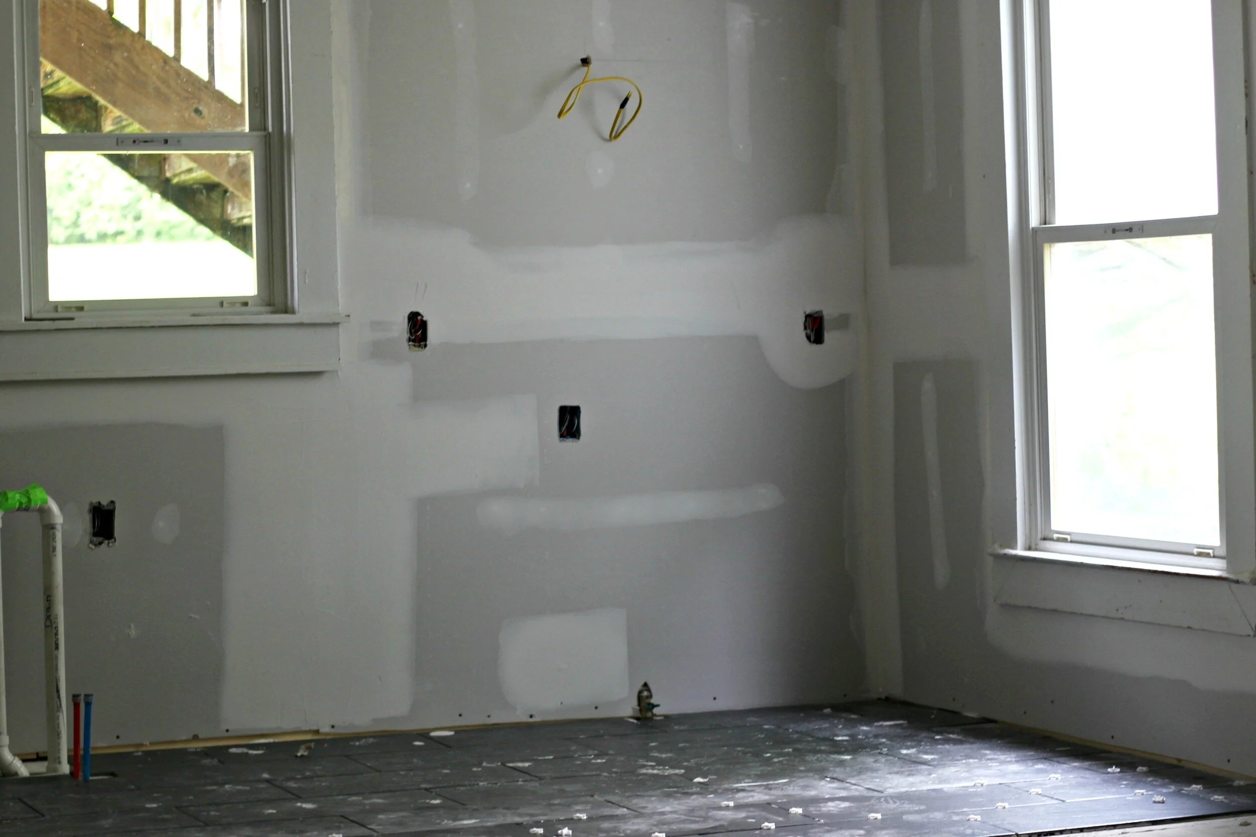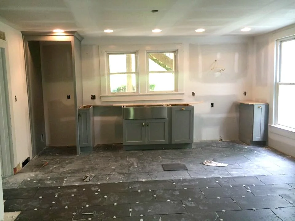 After demo, we basically re-plumbed the entire house and also repoured the foundation in the back half of the kitchen. At one point the whole back of the kitchen was a pile of dirt! Now everything is slowly being put back together. New drywall has been put up to cover all the holes from the plumbing and smooth out any rough patches. This week they will be painting all the trim and walls too to be bright white.