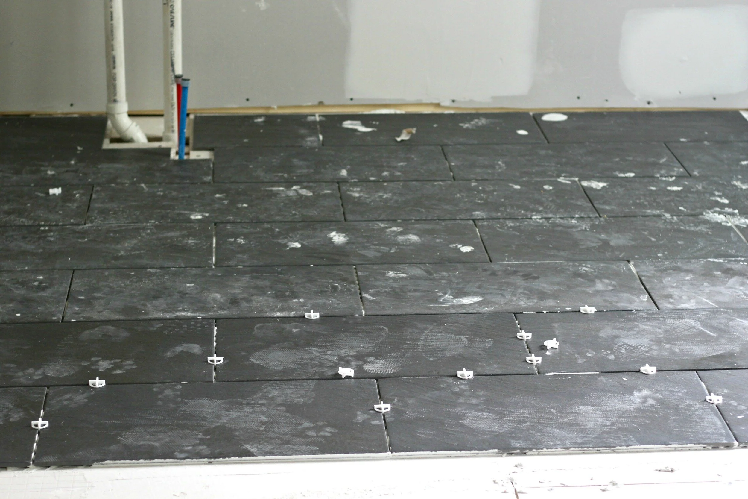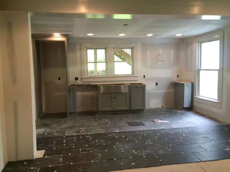 They have begun laying our slate tile which will fill the entire room and flow into the hall and mudroom as well.