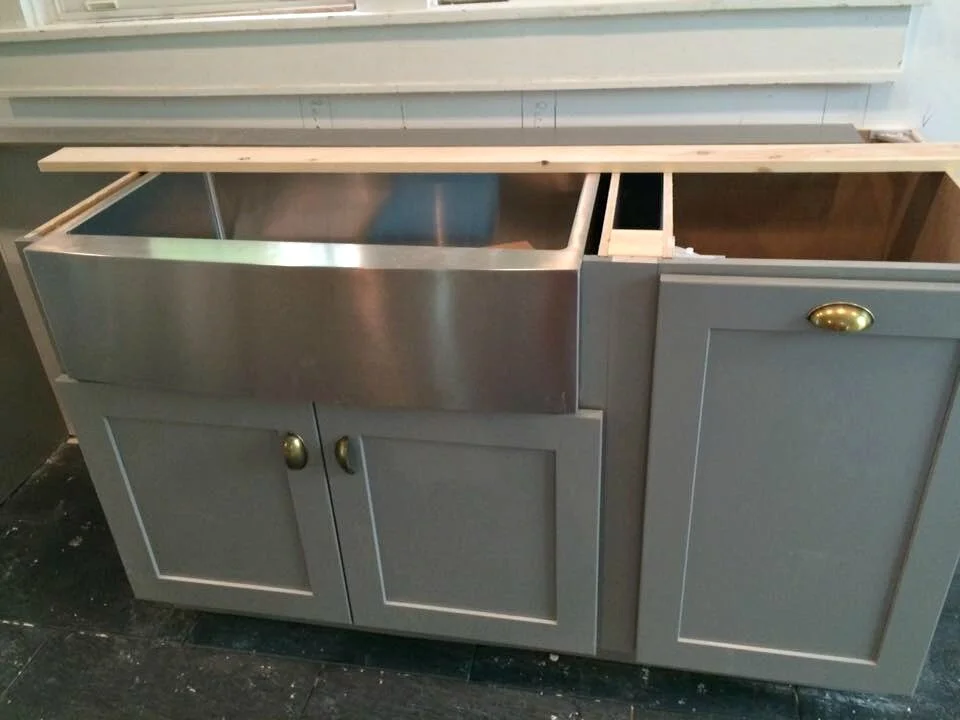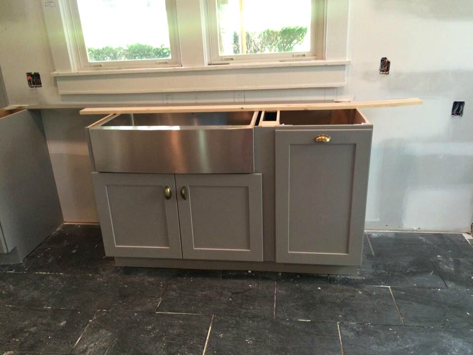 Below you can see our stainless farmhouse sink that has been installed too. All of our appliances are also stainless- the dishwasher will be in the open space to the left and the range and vent hood will be in the big open space to the right.