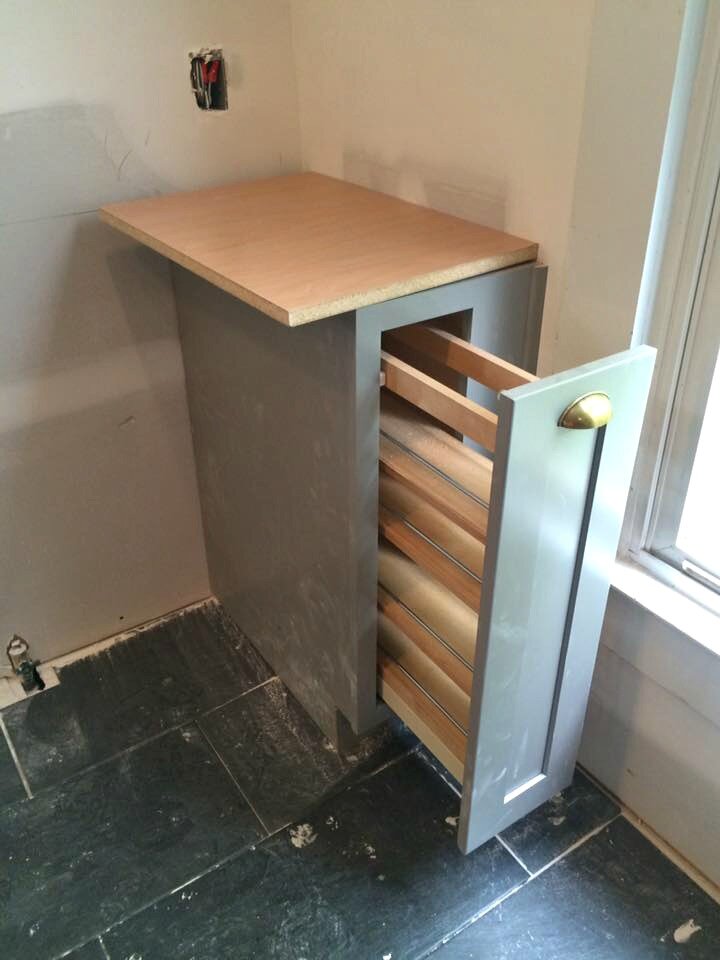 The cabinet to the far right by the window is a spice rack pull-out! This will be perfect to have right by the range and oven, and I may also do some mini floating shelves on the wall above it (to the right of the range) for olive oils, vinegars, cooking sprays, and other necessities we will need nearby.