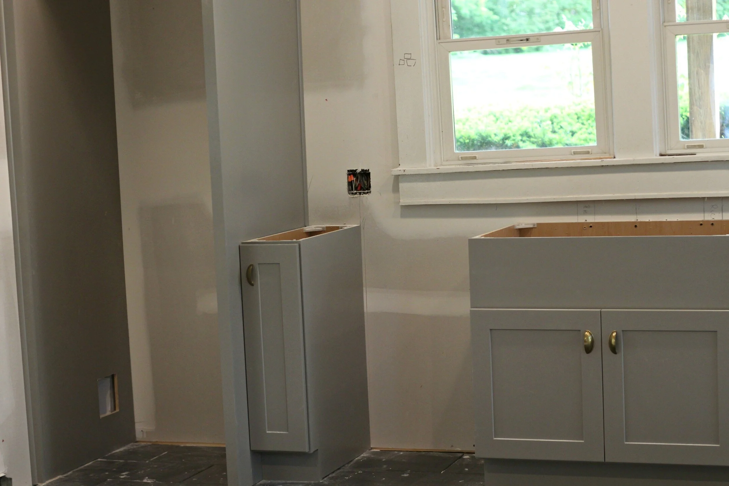 We also now have cabinets! The day we got our cabinets installed was like Christmas morning to me (and this week when our appliances come, it will be like Christmas morning part two!). We are still waiting on counter-tops too which will be installed next week. I love the gray color of the cabinets against the slate floor and the pops of brass with the knobs.