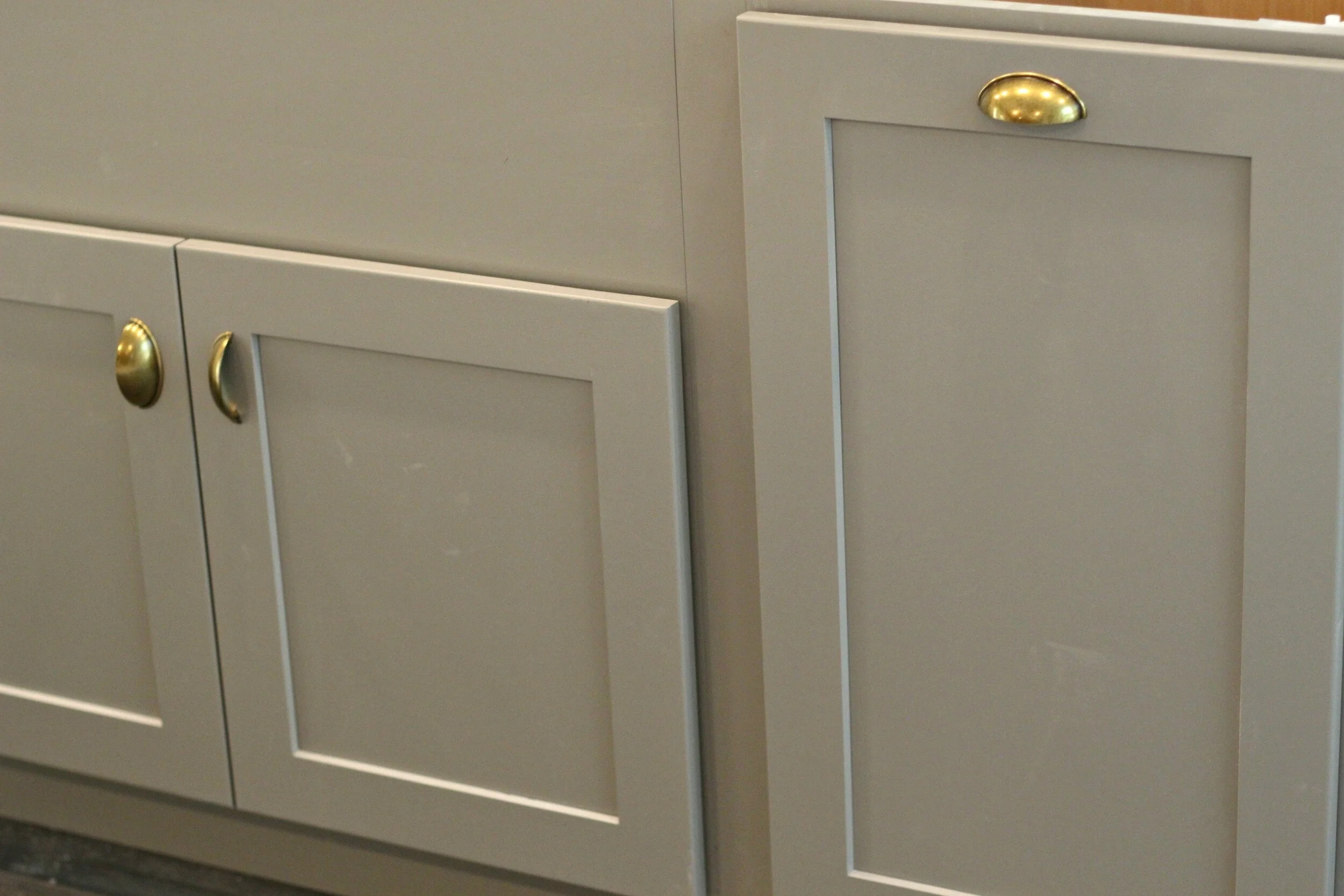 Below you can see a close up of the cabinet color/finish and the brass cup handles. This cabinet is a double trashcan pull-out.