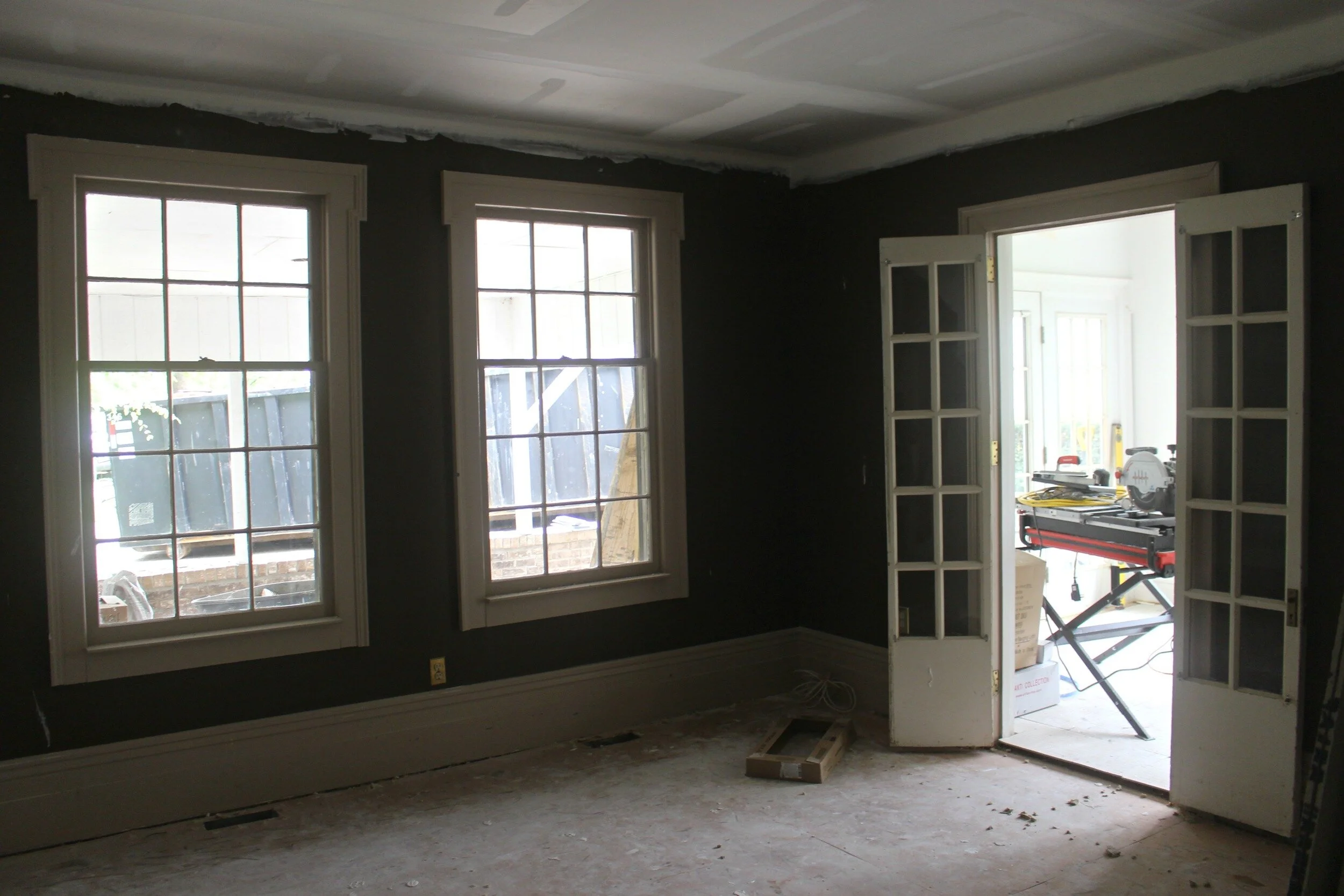 It is amazing how much difference a little drywall can make! This room has beautiful high ceilings but they were super outdated looking with popcorn-like texture. Now they are completely smooth and will be getting a fresh coat of paint this week (along with all the trim and walls!)