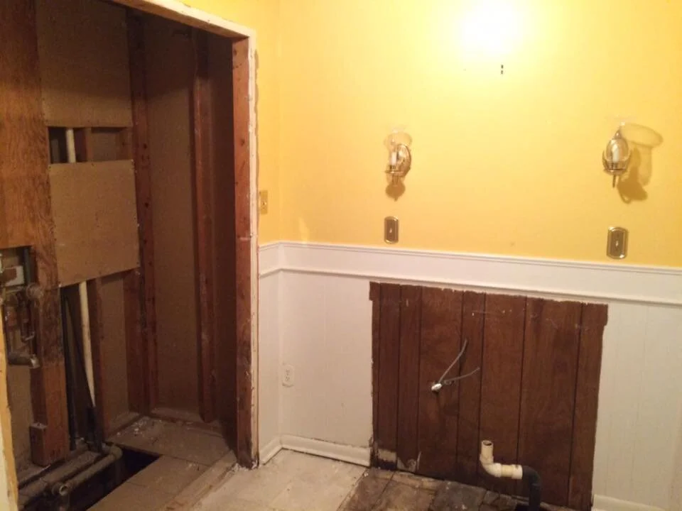 More demo progress in the master bath before any plumbing work was started. After the plumbing was redone we had to hang new drywall over all the opened up walls.