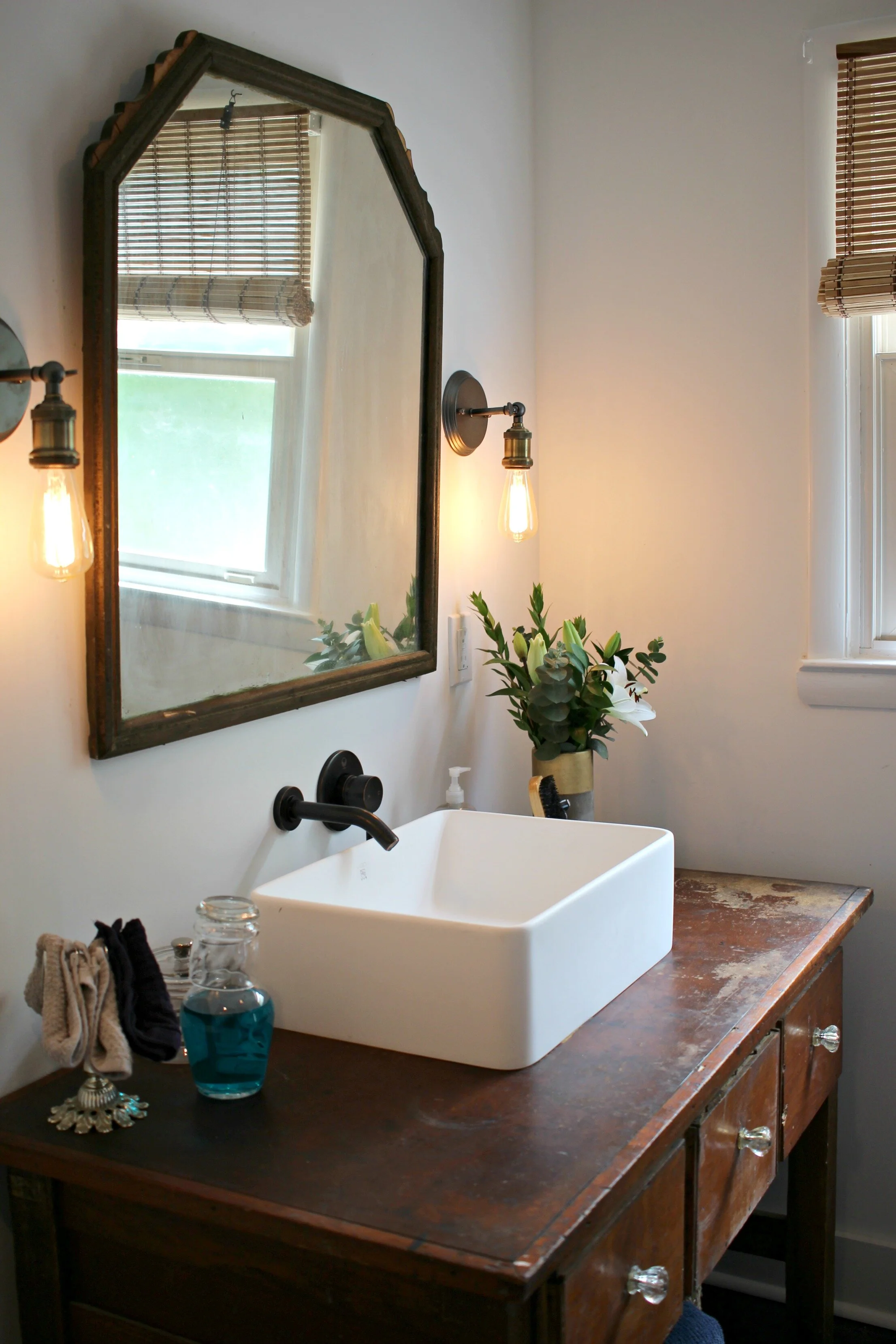 I had been saving pictures for years of old pieces of furniture re-purposed into vanities with vessel sinks on top. I immediately knew this is what I wanted to do in this bathroom and I also liked the unique touch of a wall mount faucet. I think it perfectly matched the style of our other fixtures as well. You can find our vessel sink here and sink faucet here. I like this sink because it has clean lines and is much deeper and more substantial than most vessel sinks.