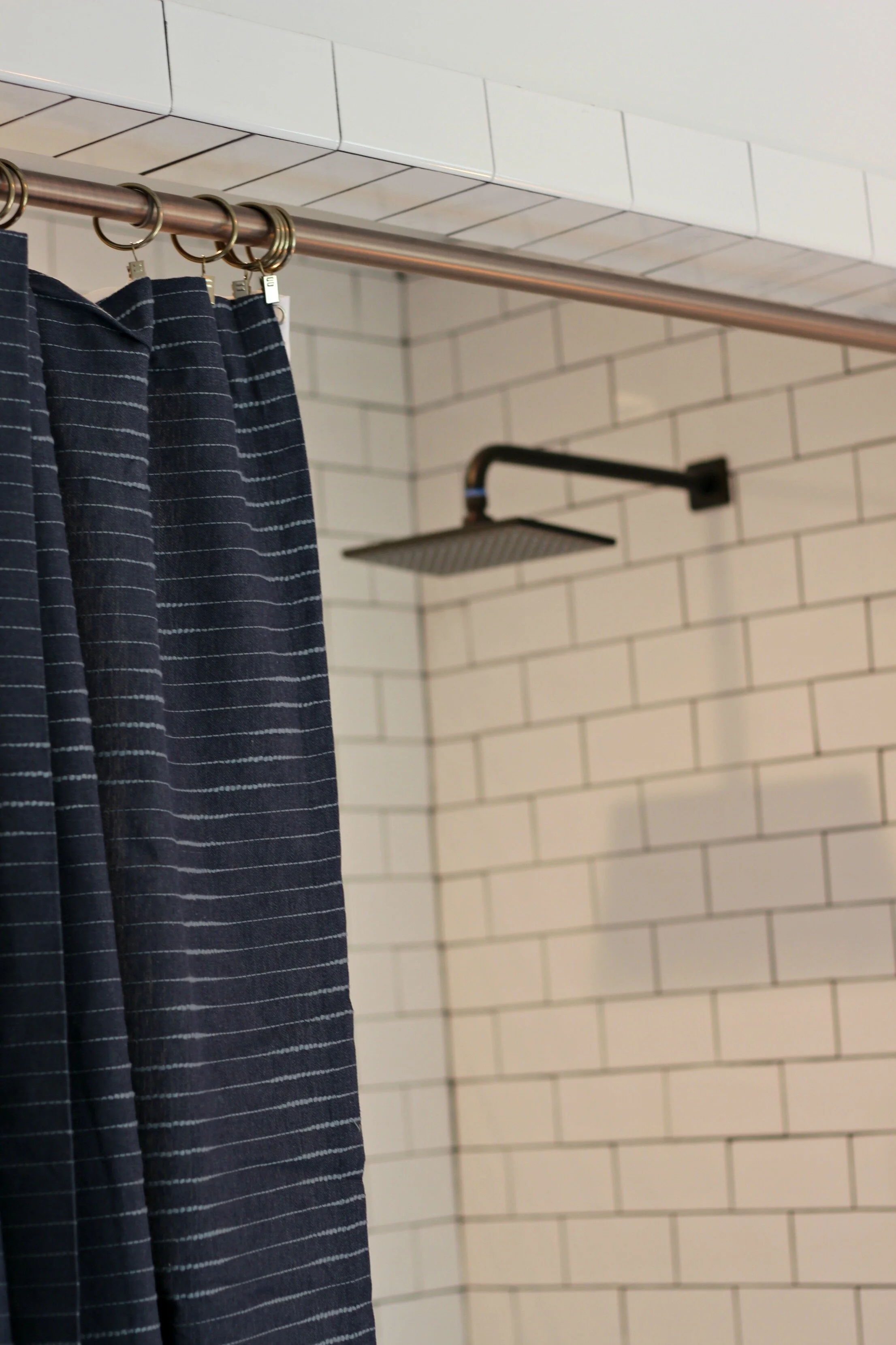Another view of the shower- I had originally tried a neutral shower curtain but decided I definitely needed a pop of color against all the white tile. This Nate Berkus curtain has a little bit of texture and matches the other navy tones I have going on in the room. I also love the super modern, minimal look of our main shower head. It was a little bit of a splurge but I think it was worth it because the rain shower head feels so spa-like and the look is so unique compared to other shower heads I was looking at.