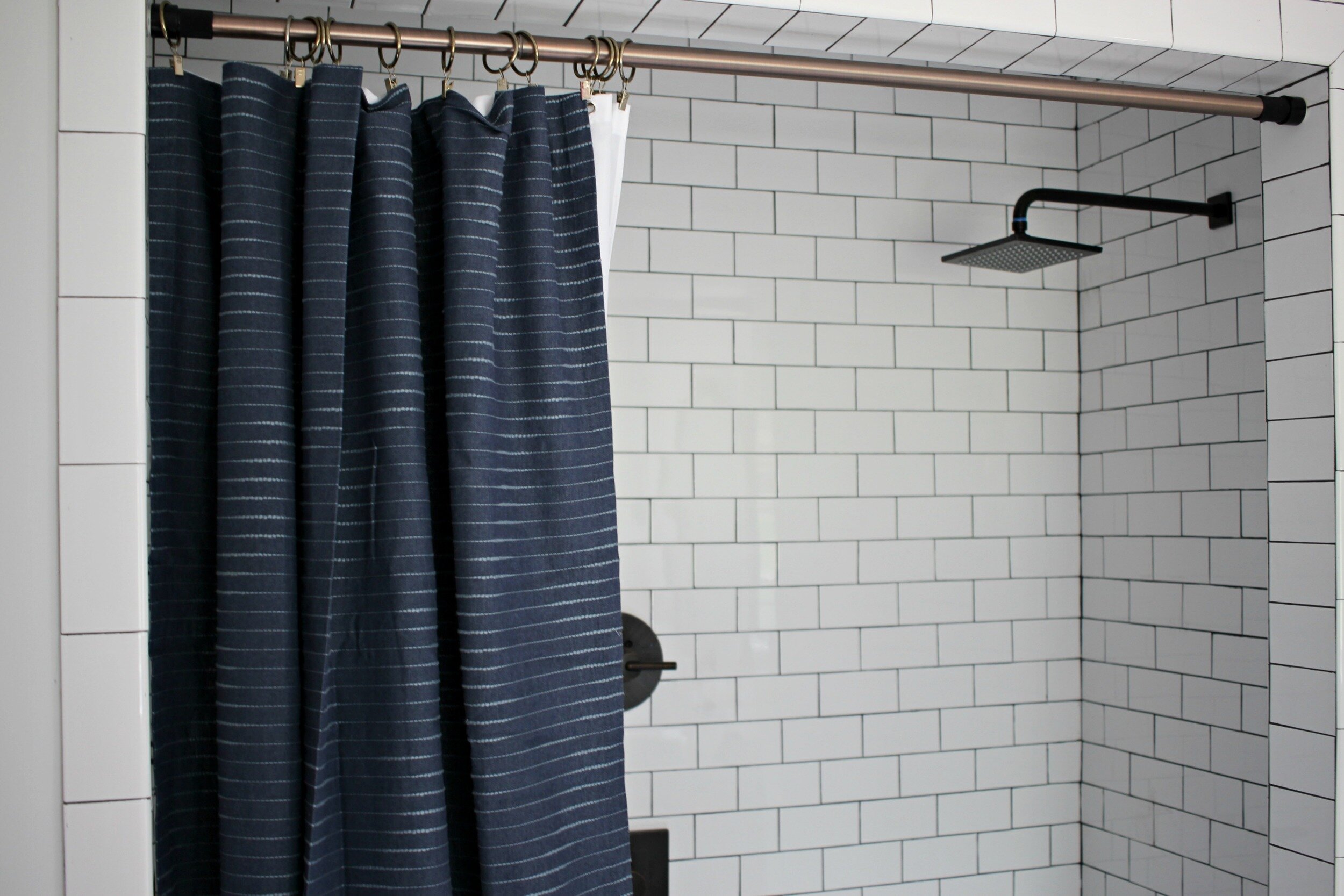 Here's a look at the new shower which is so clean and modern- such a change from the previous tub! We went with my favorite white subway tile with dark grout in here with oil rubbed bronze fixtures. Like I mentioned in my post about our master bath plans, we would like to eventually get a seamless glass shower door but right now we did not have enough money left in the budget. One of my biggest challenges in decorating this space was finding a shower curtain for the extra long, not-standard-size opening. I was able to find an extra-long shower curtain liner on Amazon but there are not many attractive options for decorative extra-long shower curtains. I had an idea to try a regular curtain and use curtain clip rings to hold both the curtain and liner together. I was able to find a curtain and rings that fit perfectly over my tension rod at Target and I'm pretty pleased with the look! It slides easily and works just like a regular shower curtain!