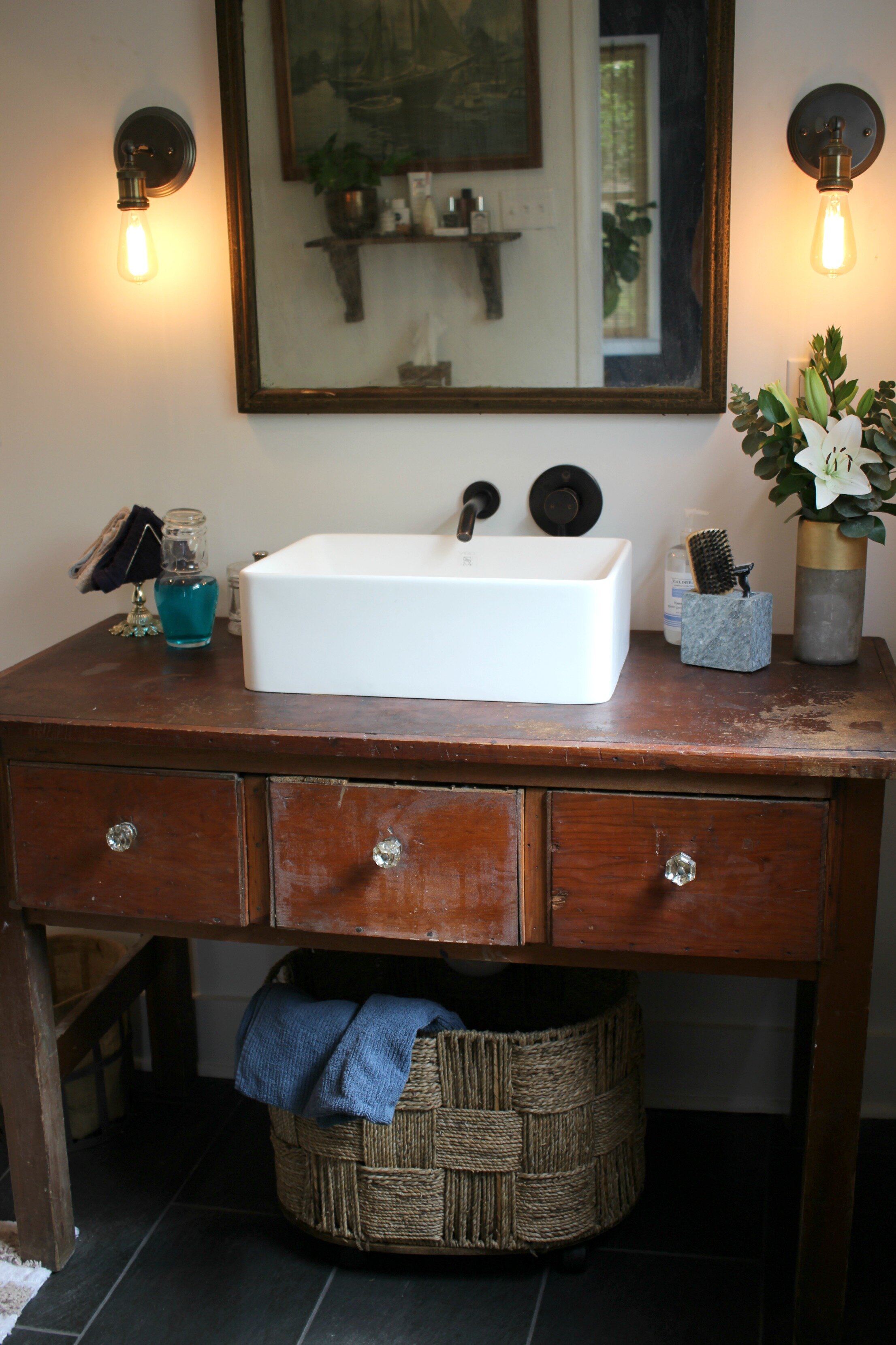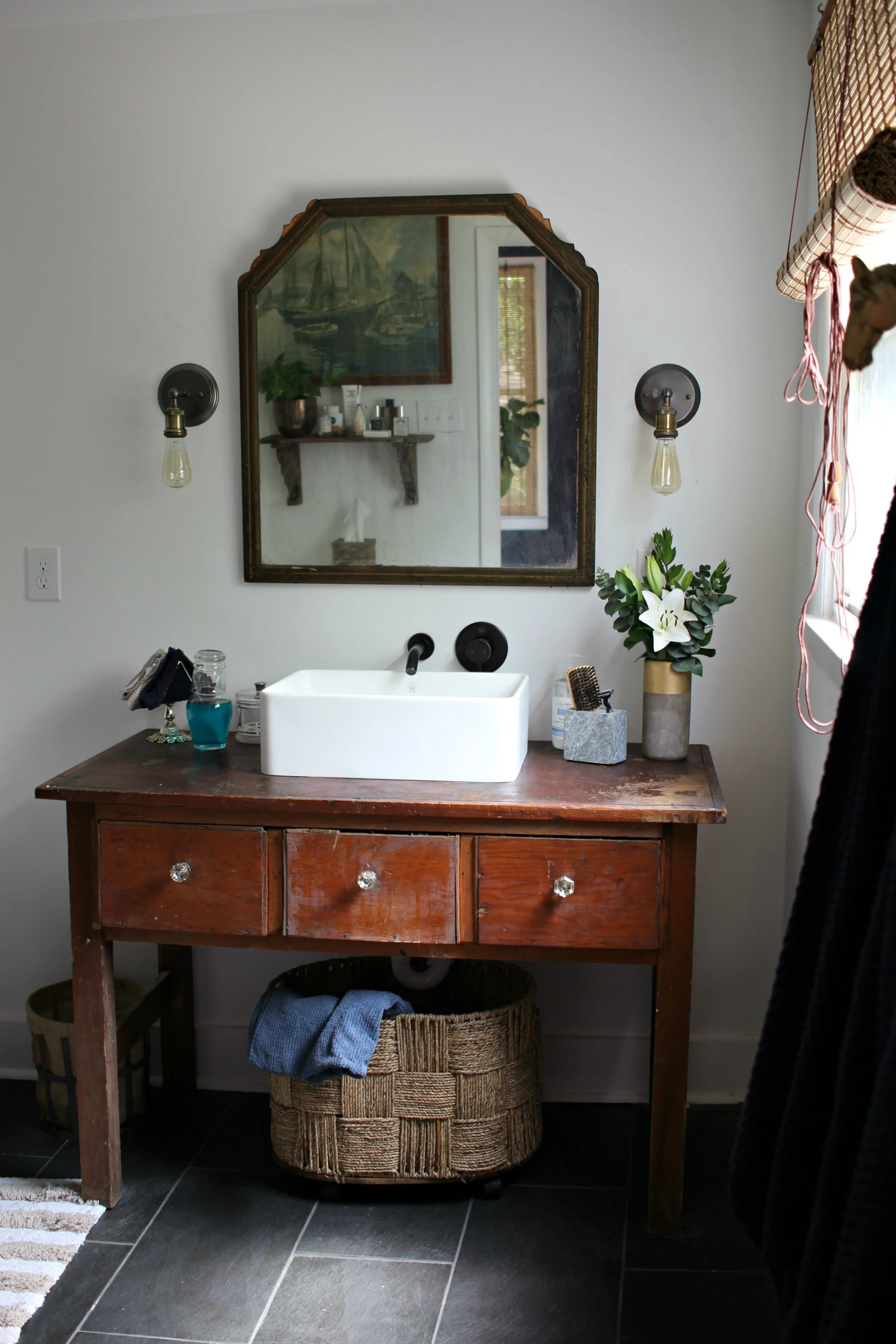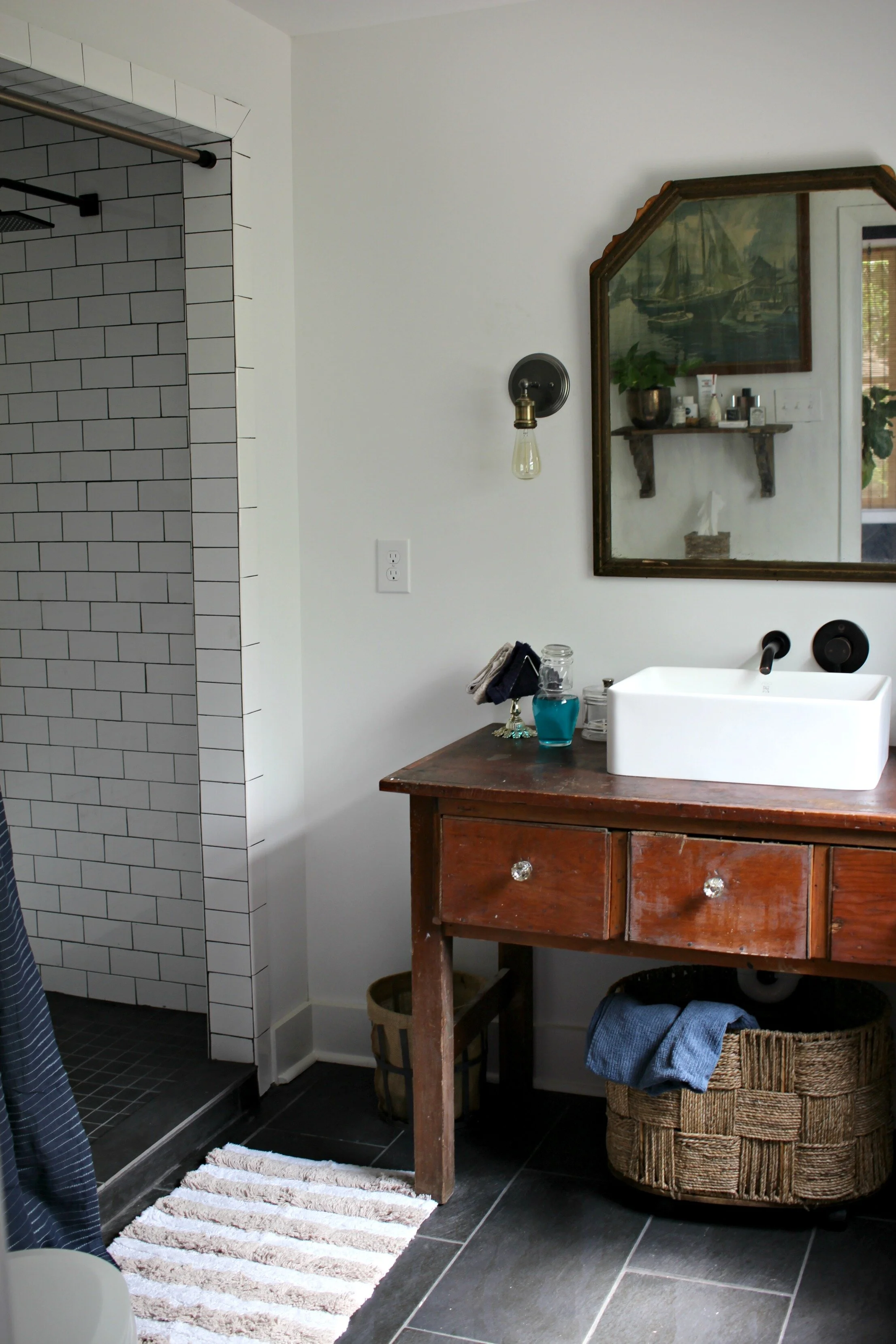 This vanity is one of my favorite features of the bath. I love the character it adds and how the rustic style contrasts with some of the super modern finishes and glossy subway tile. This vanity was an old antique sideboard that I have used in various rooms in our old house. It was my first thought when trying to find a vanity piece for this space and thankfully it fit perfectly! It is also so nice to have these huge drawers for extra storage.
