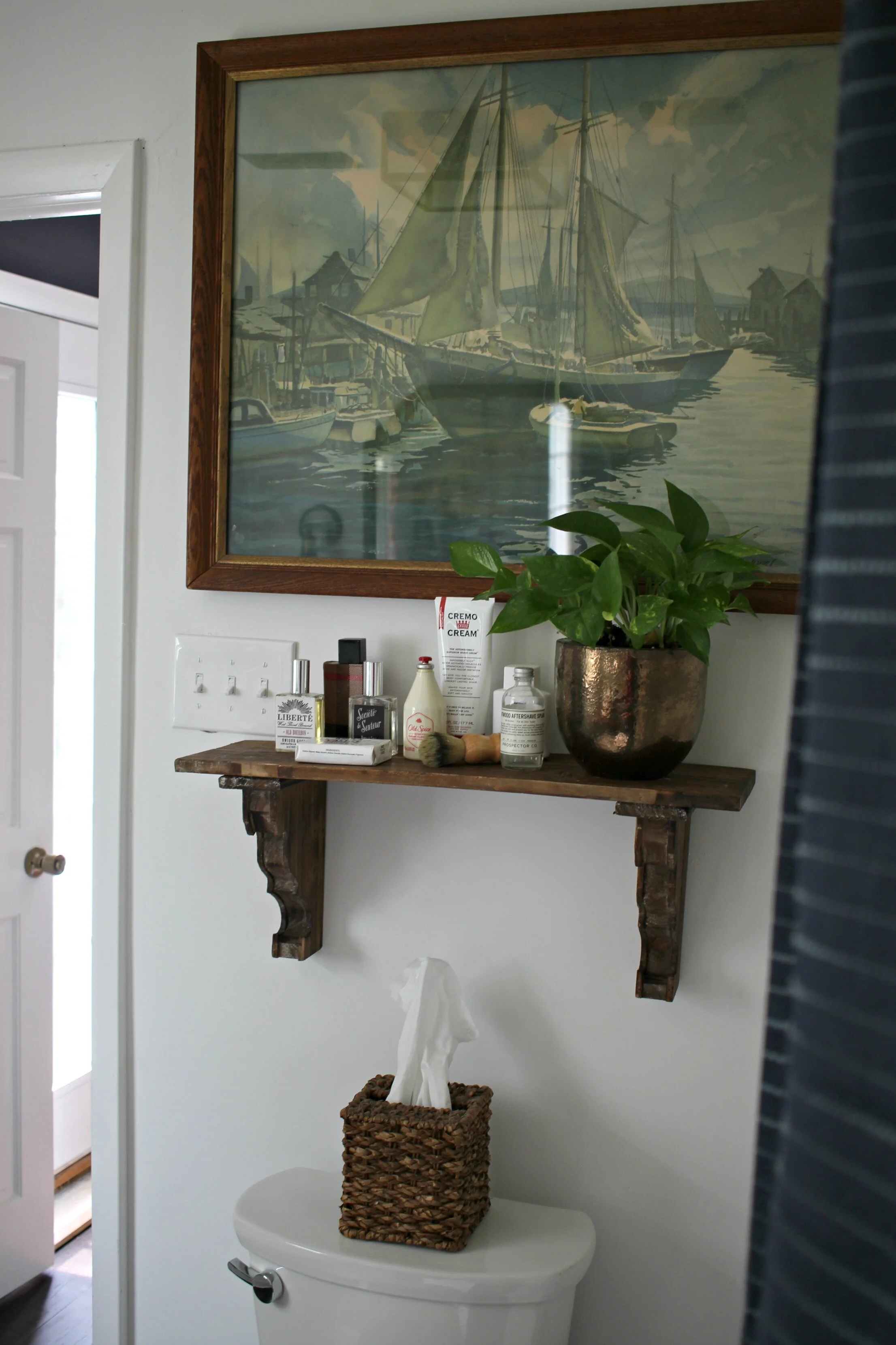 Here's a look at where the toilet was re-positioned. It looks so much better and it's hard to believe it was ever tucked into that corner to begin with. I added a little shelf above it and vintage painting to break up all the white. I found this vintage sailboat painting while we were moving and had completely forgotten that I had it in the attic! I love the colors and wood frame for this space.