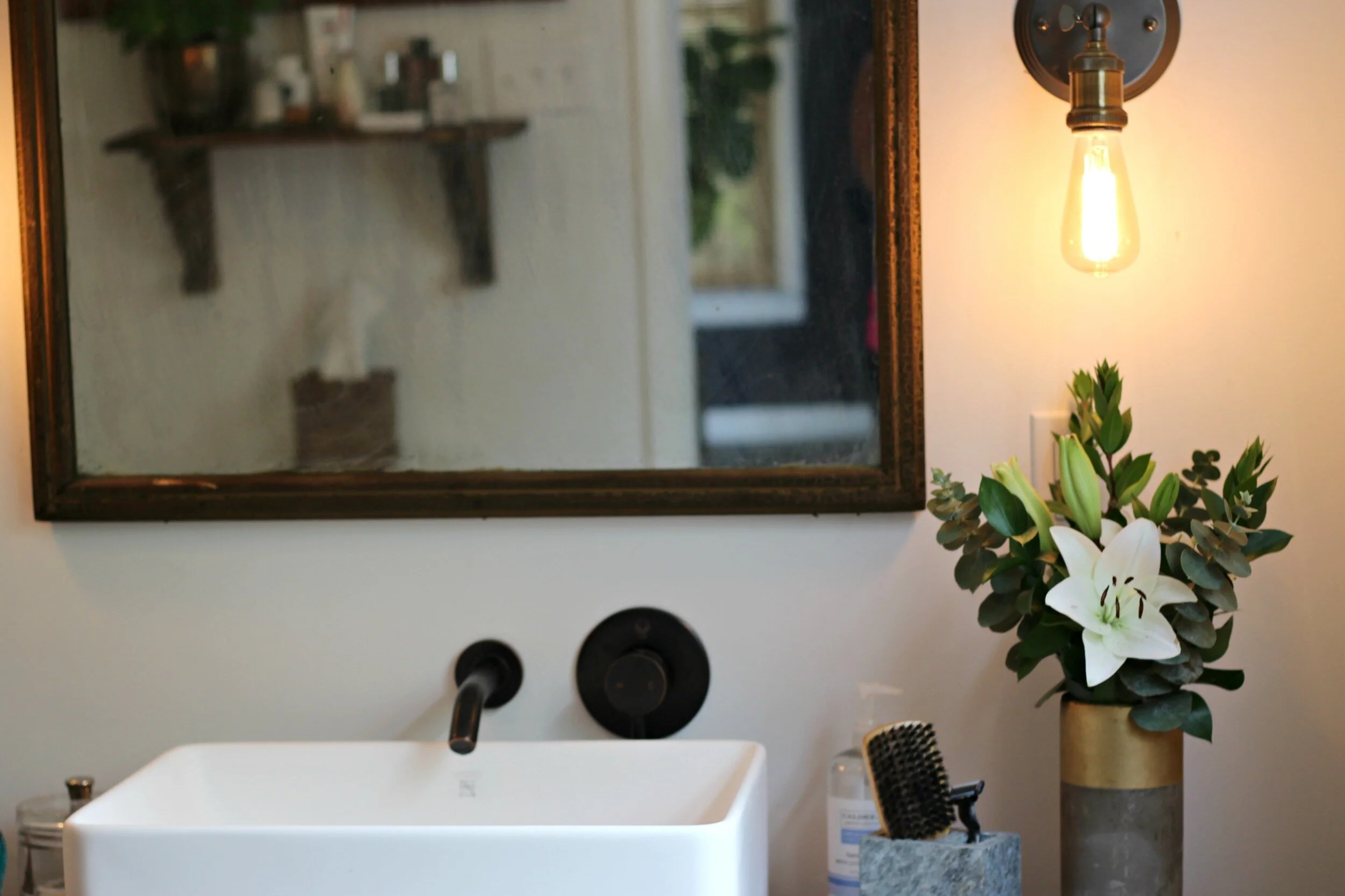 The vanity was a good size for the space and I didn't necessarily mind the style but I really wanted something with a little more character. I kept the sconces that were placed on each side above the vanity and updated them with more industrial looking lights.