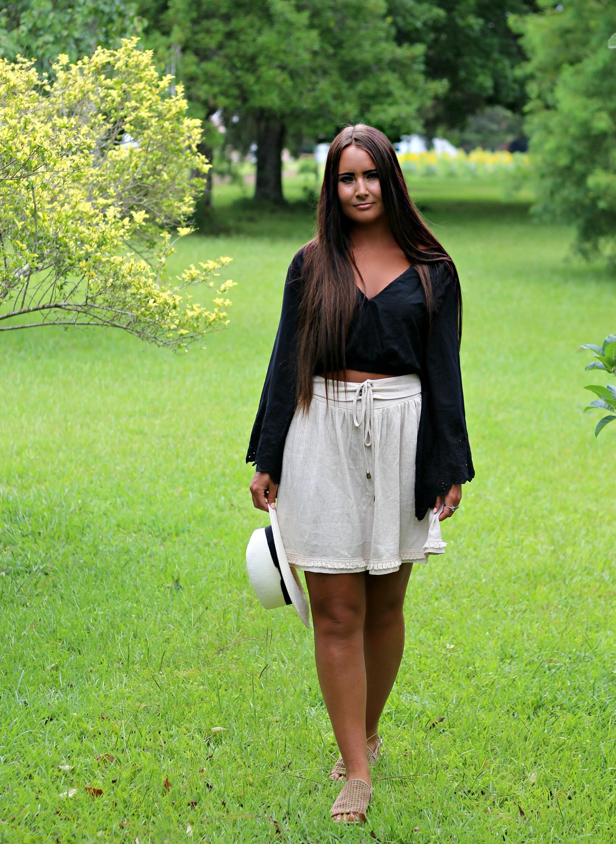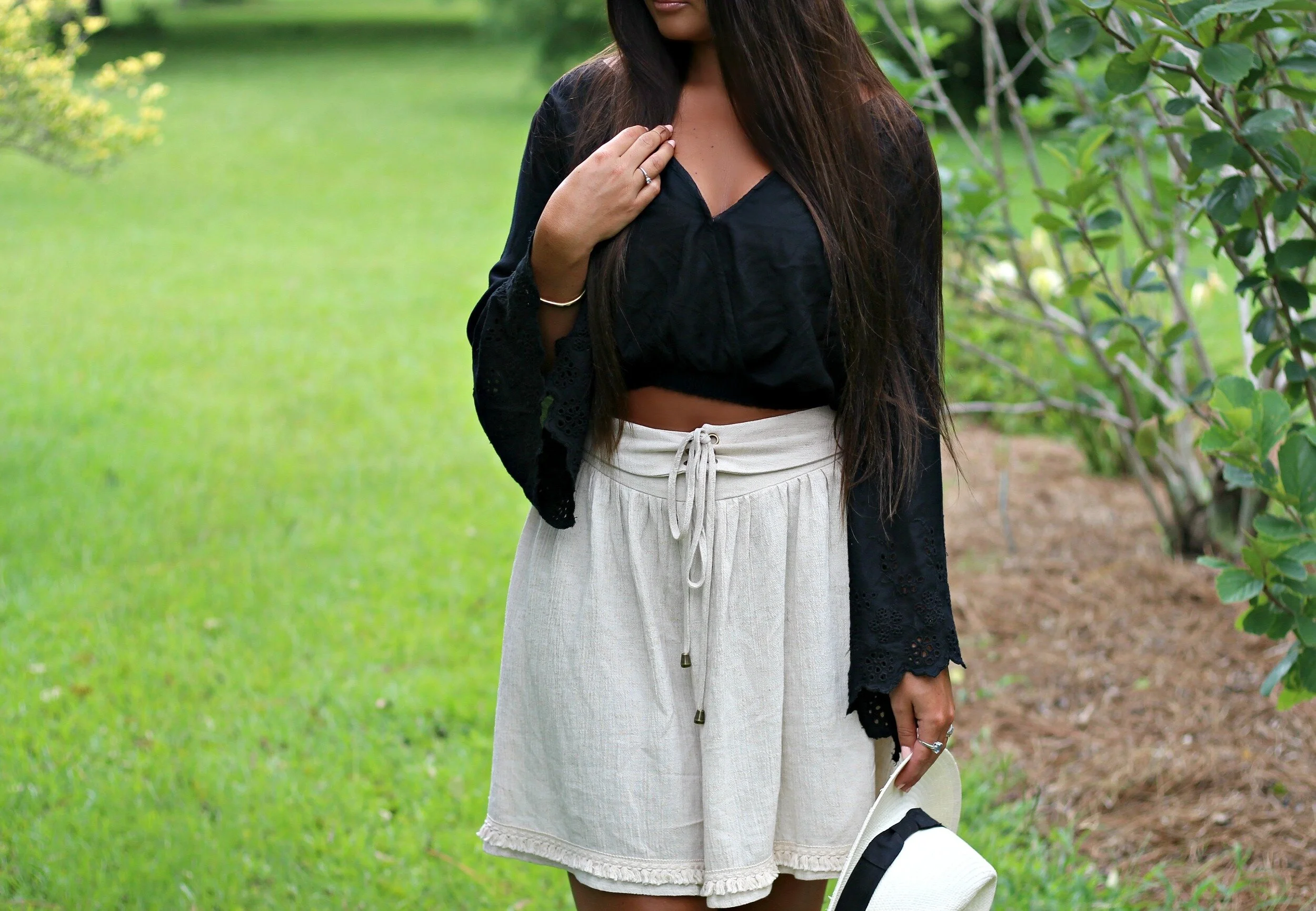 We're halfway through July and I still can't get enough neutrals + summer staples in my wardrobe. This skirt from local boutique Entwine is the perfect breezy piece with the cutest details (tassel trim + lace up waist!). Not to mention it's also a soft linen-like material and SO comfortable. I paired it with a flowy bell-sleeve blouse from Forever 21 and some basic flat sandals for a laid-back summer Sunday. Forever 21 is my favorite place to get little crop tops and flowy blouses like this and they always have a good selection come summer. I'm trilled that bell sleeves are back, they are so flattering and comfortable and I love the vintage vibe! What are some of your favorite summer staples?