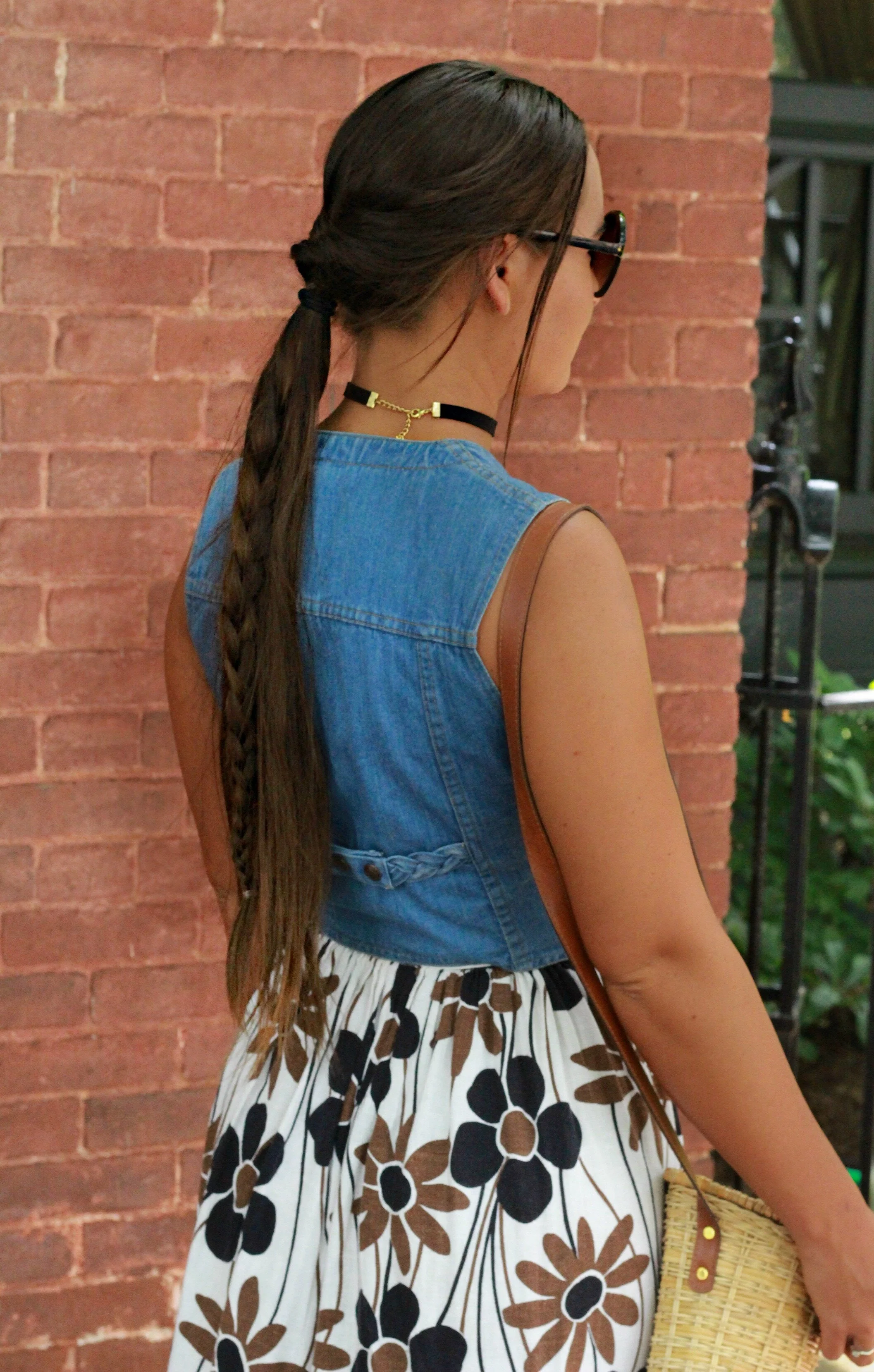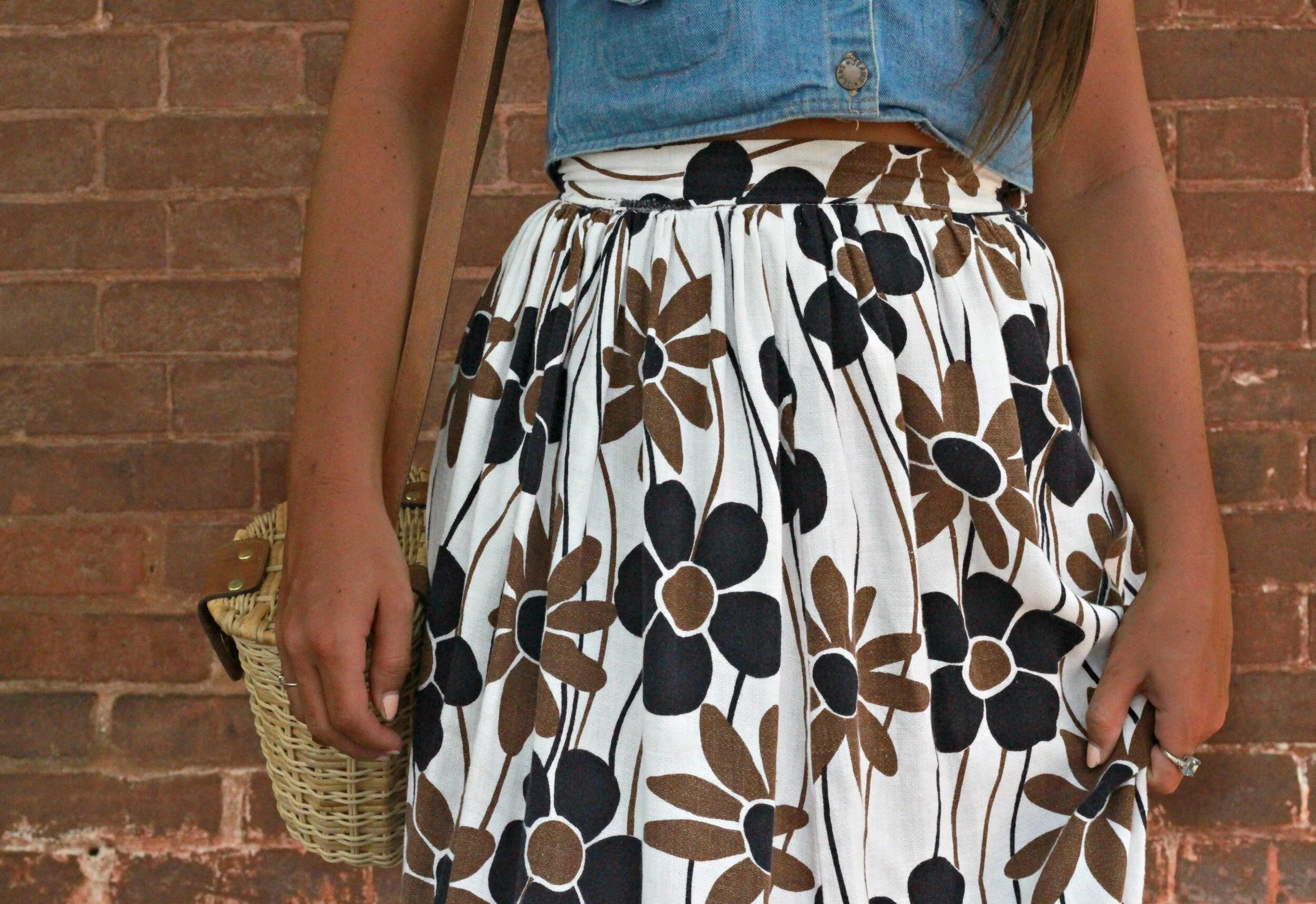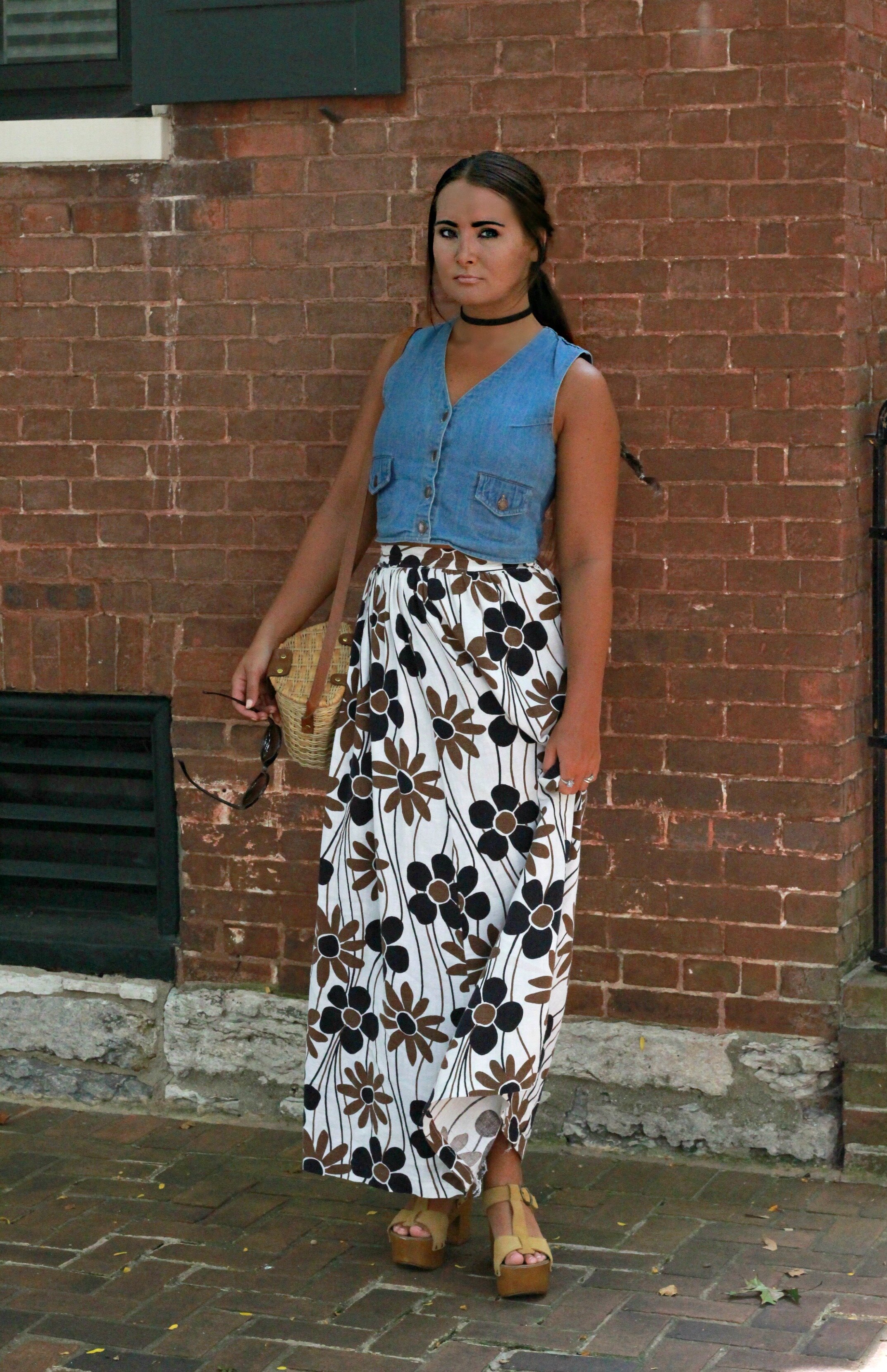 This weekend I have been dressing in nothing but maxis to conceal my poor legs that are covered in poison ivy! Somehow I got into some poison ivy or poison oak in our yard while weeding last week and now have a horrible rash on both ankles and parts of my legs. It has finally stopped itching and spreading (I hope!), but will take a week or so to fully heal. In the meantime, I have been pulling some maxi skirts and dresses out of my closet that haven't seen the light of day in quite a while! This outfit combines some of my favorite summer vintage staples: chunky wedges, a basket purse, denim top, + floral skirt! Vintage skirts are my favorite because they have the BEST prints and are always super fitted at the waist, which is my favorite silhouette to wear. It is hard to find modern skirts that fit as well as these as many vintage skirts were handmade, paying attention to the tiniest of details. This entire outfit is vintage except for my choker necklace which adds a little bit of a modern touch to the look. You can find this essential summer choker in our shop and I promise you will be wearing it with everything!